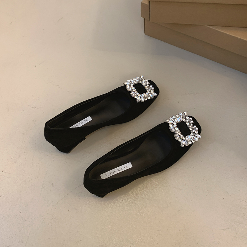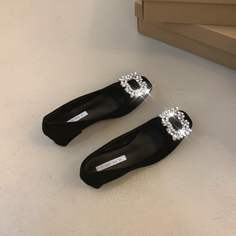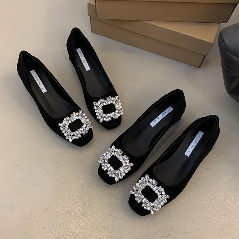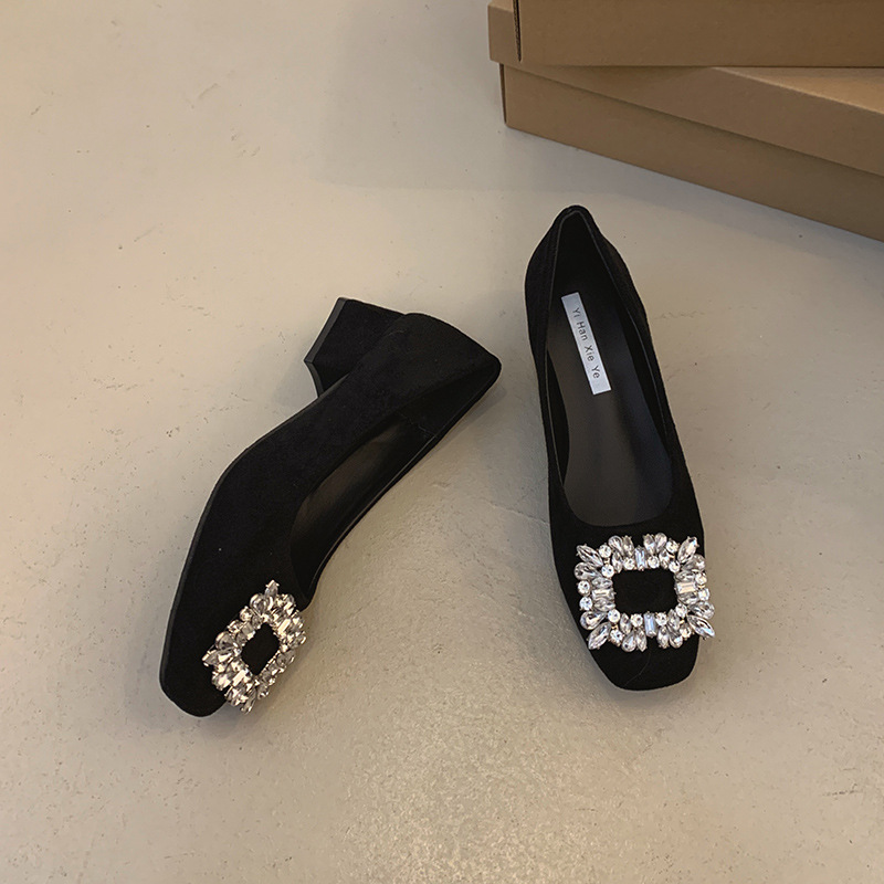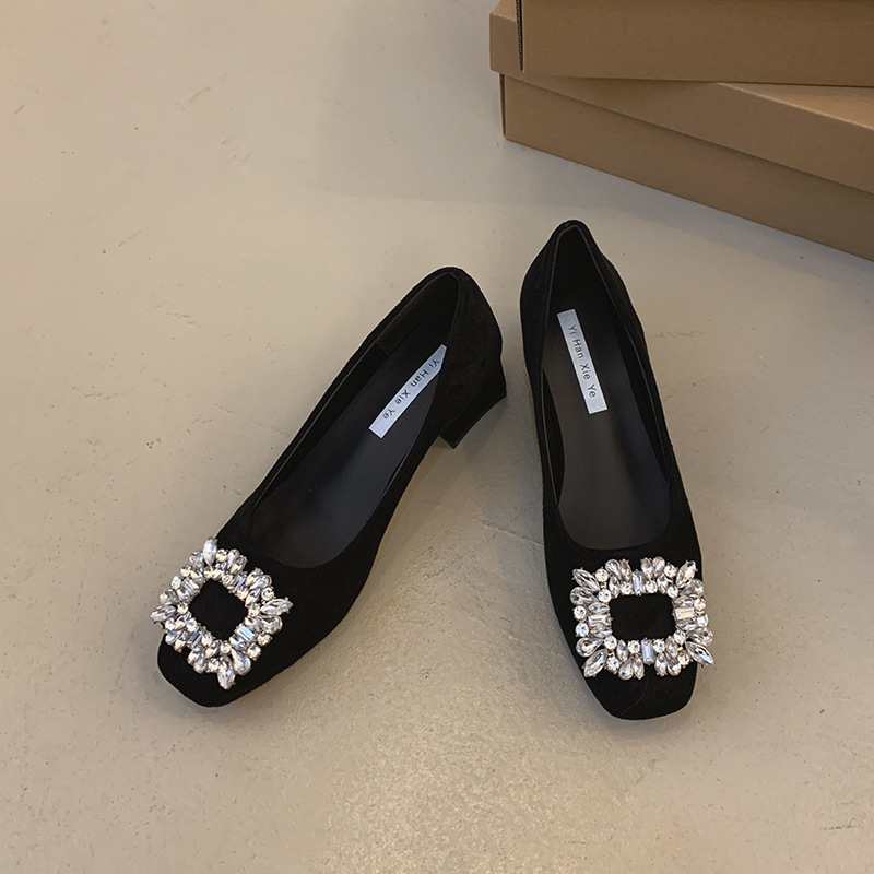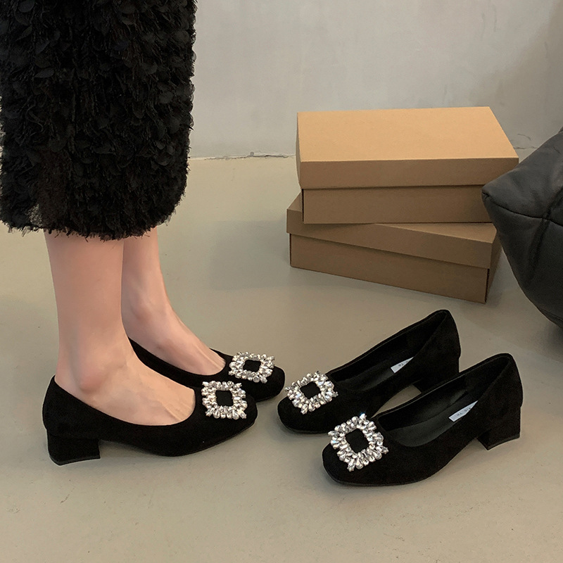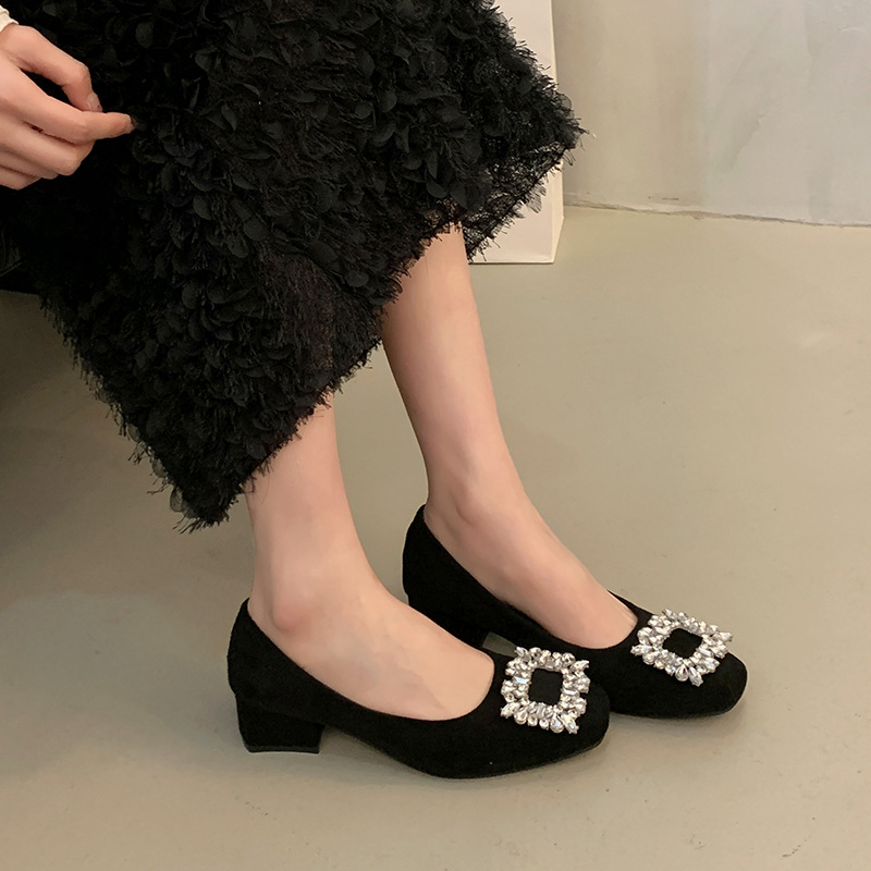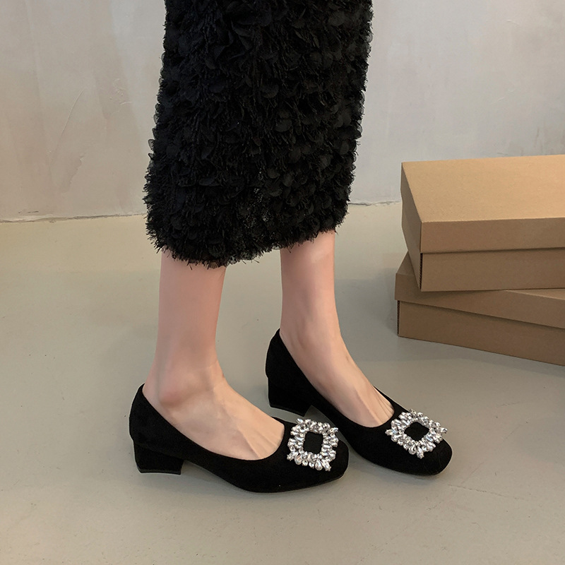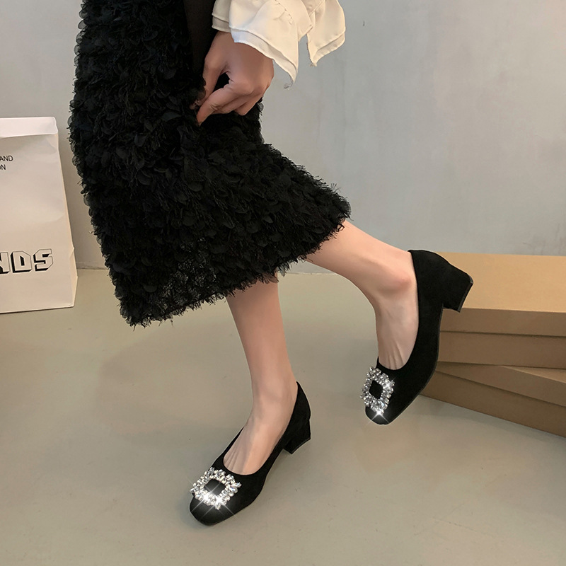 프랑스 스타일 스퀘어 발가락 신발 여성 신발 2025 초봄 새 라인스톤 두꺼운 힐 로우 힐 신발 한 단계 얕은 하이힐