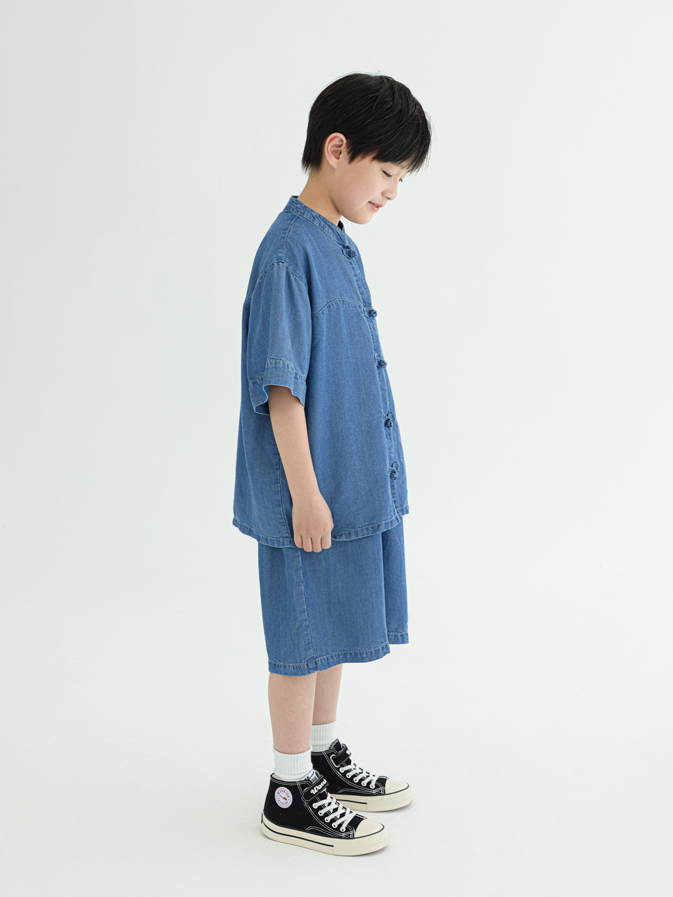 2025 년 여름 새 소년 '경량 쿨 텐셀 데님 반팔 세트 어린이 새 중국 셔츠 투피스 세트
