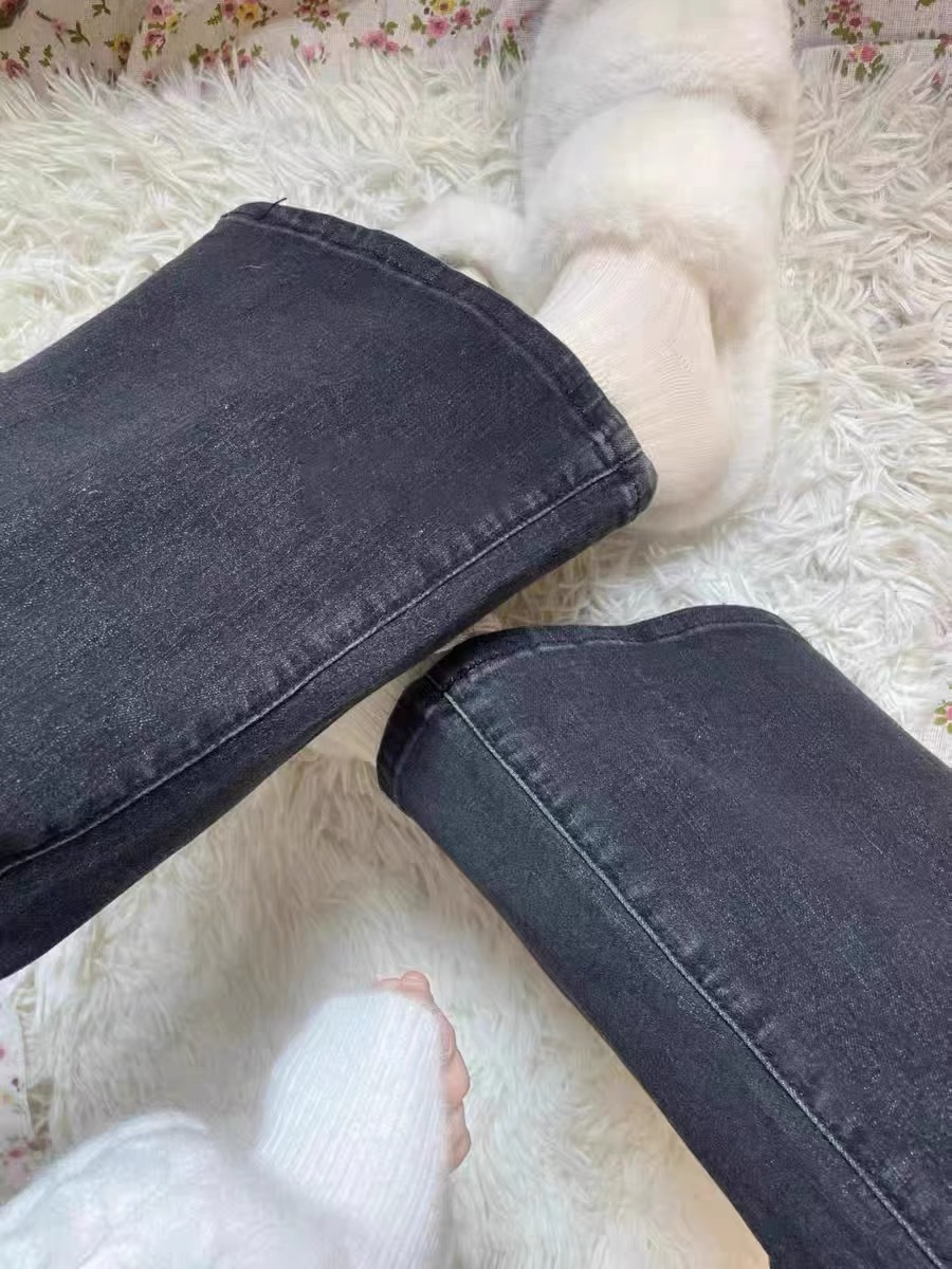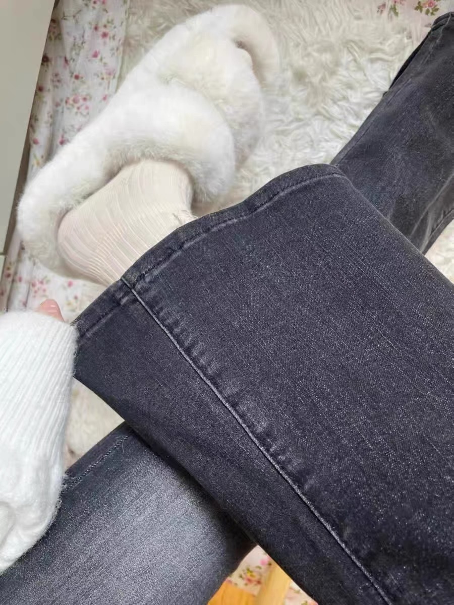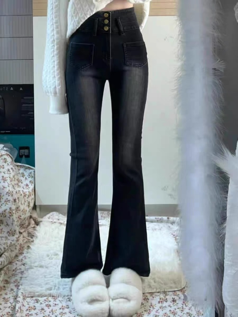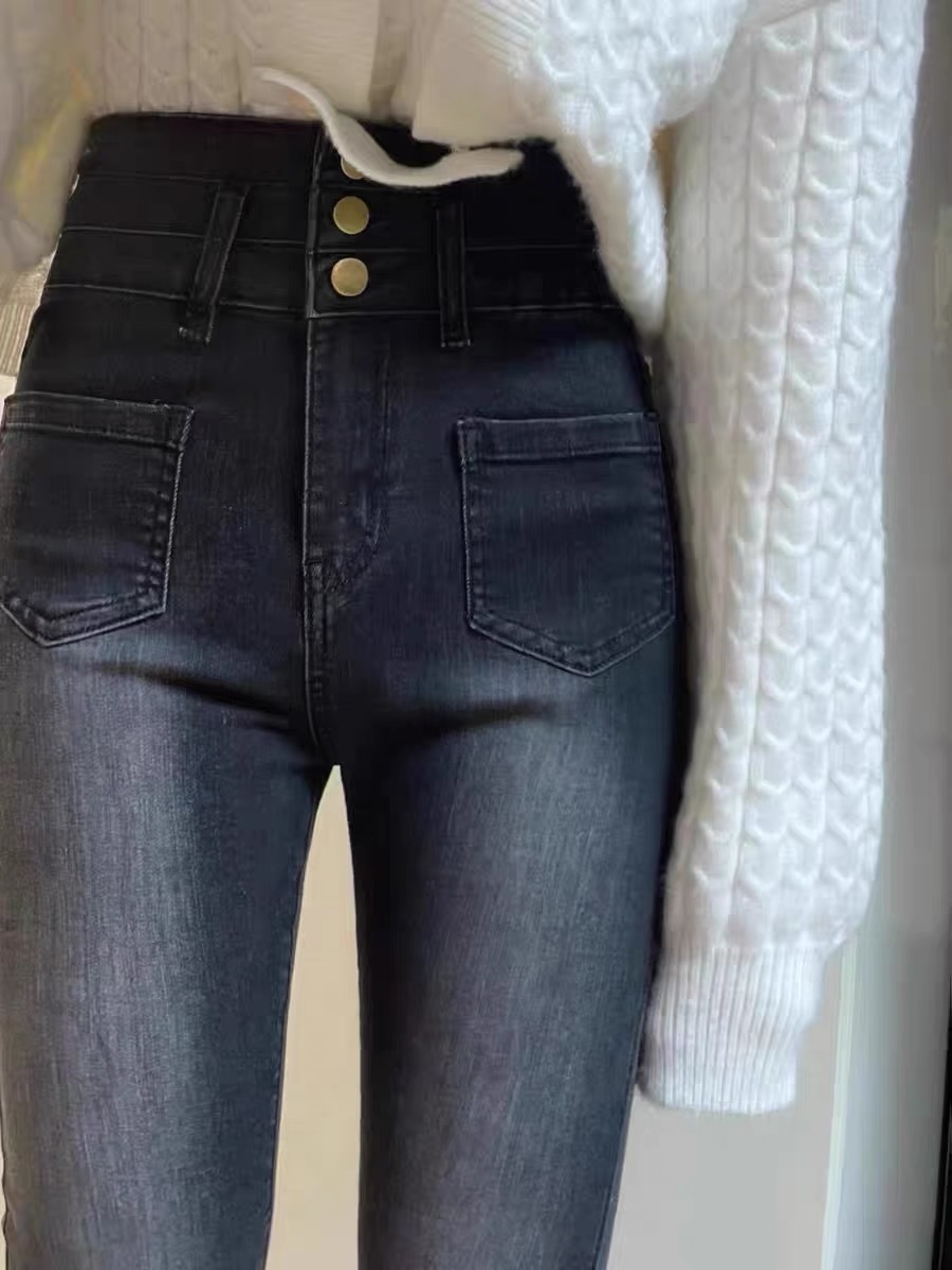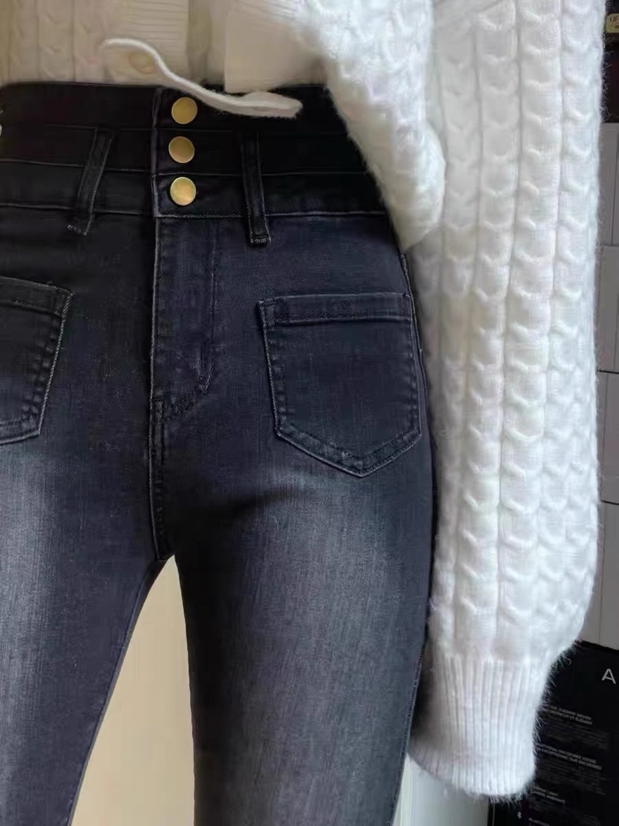 플러스 사이즈 통통한 자매 3 버튼 마이크로 블레 청바지 여성 가을 및 겨울 아메리칸 스타일 레트로 스트레치 하이 웨이스트 슬림 핏 슬림 핏 핏 핏 핏 핏 플라 드 팬츠