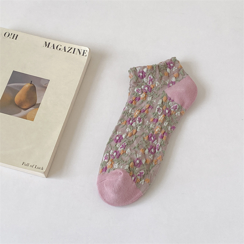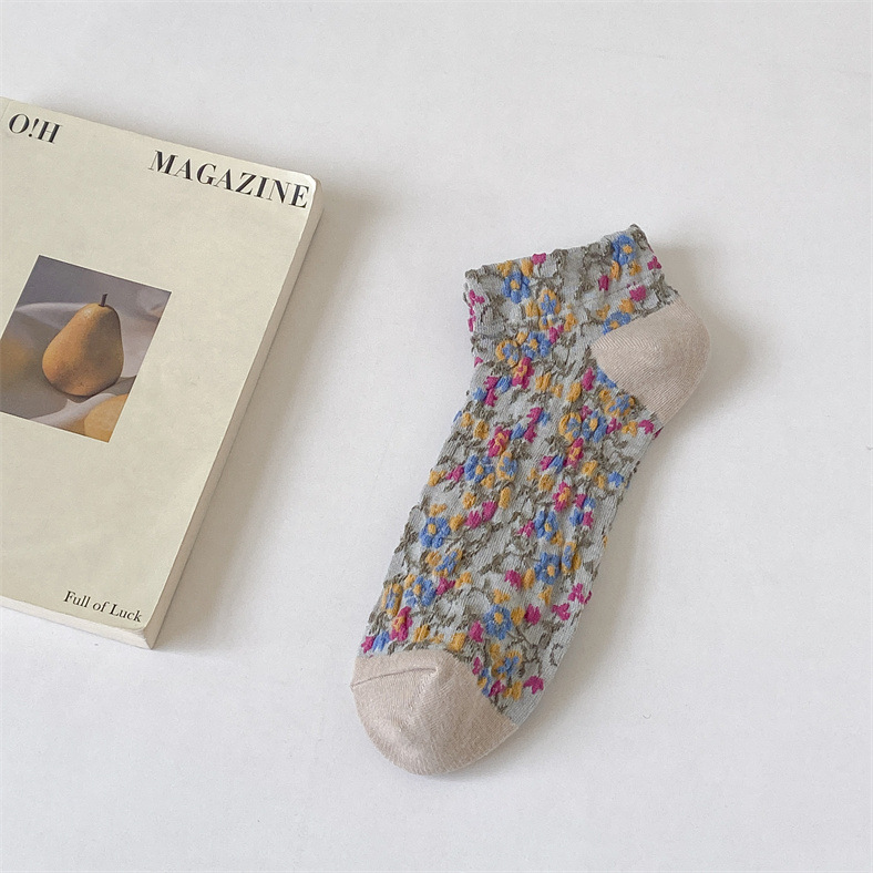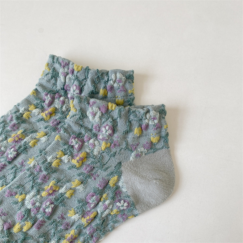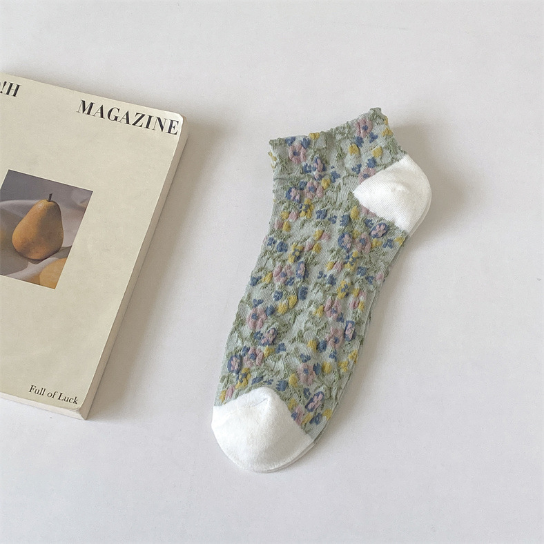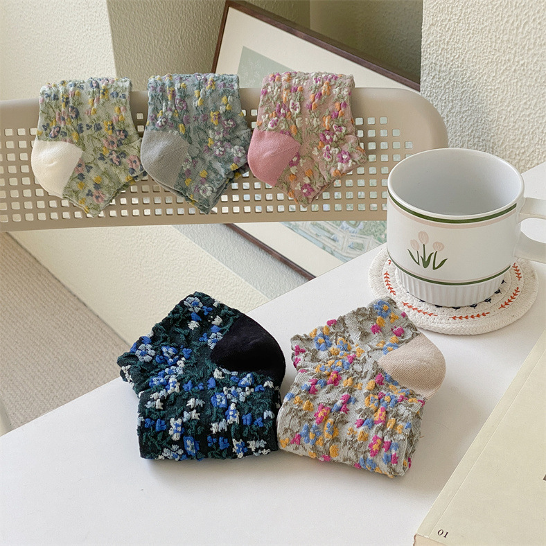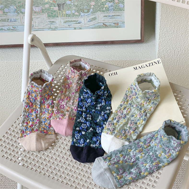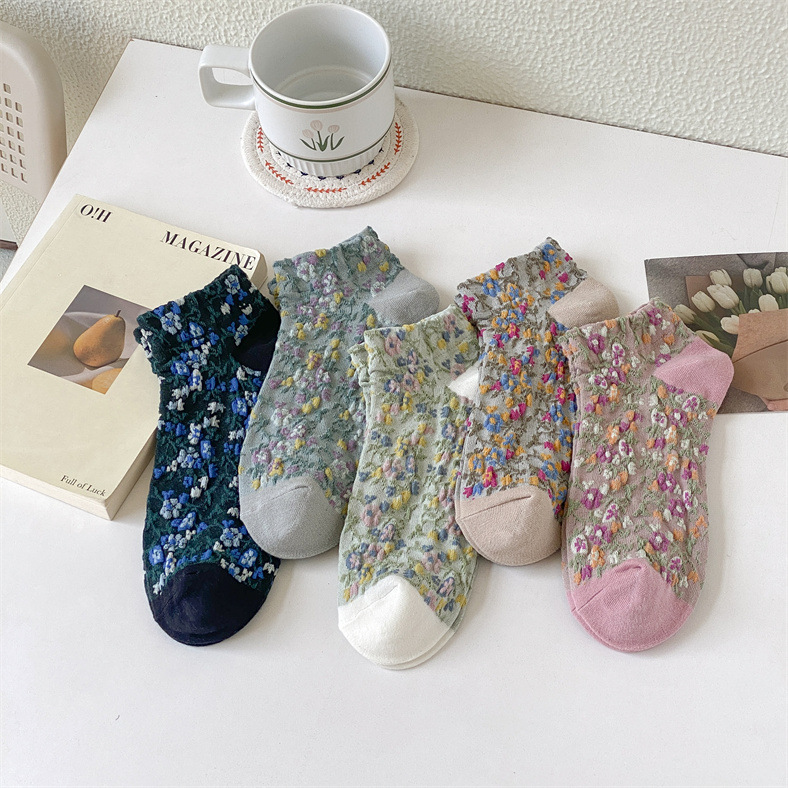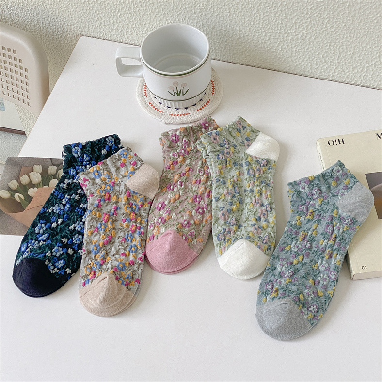 봄과 여름 새로운 일본 빈티지 3 차원 양각 꽃 색상 매칭 여성 보트 양말 Instagram 패션 면 로우 사이드 쇼트 튜브