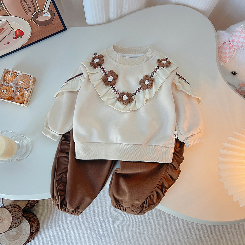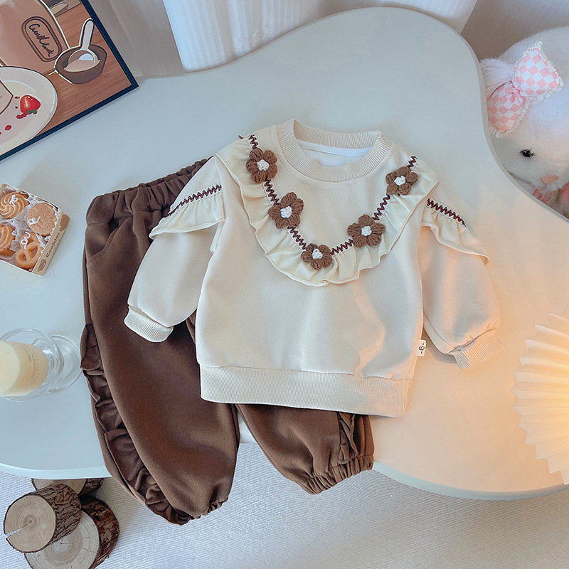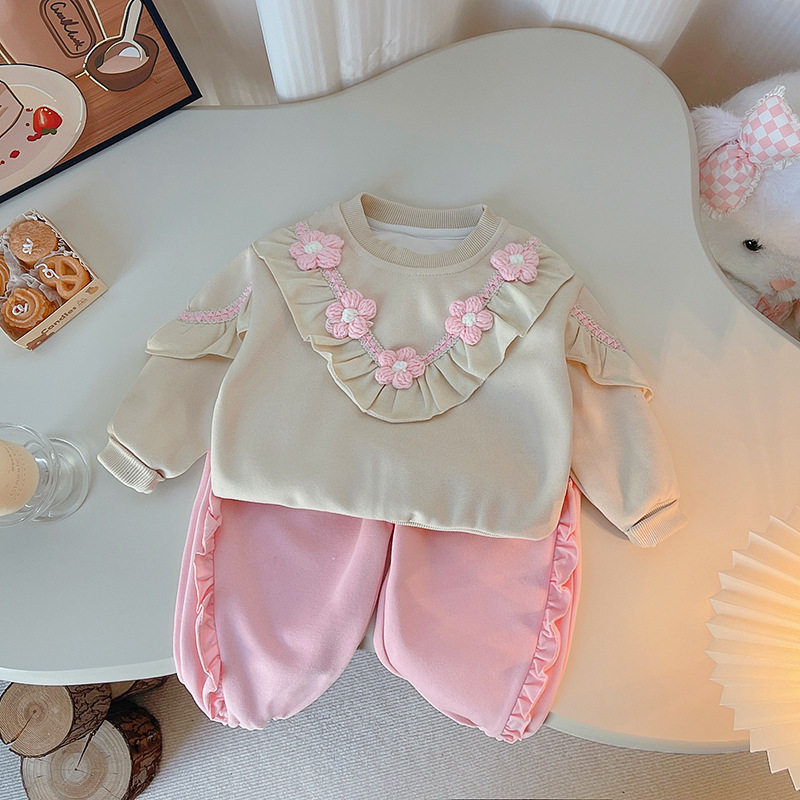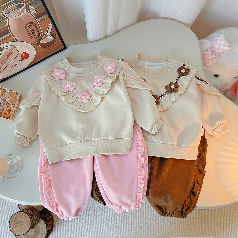 2025 새로운 봄 한국 어린이 착용 아기 소녀의 꽃 단색 긴 소매 투피스 유행 어린이 세트