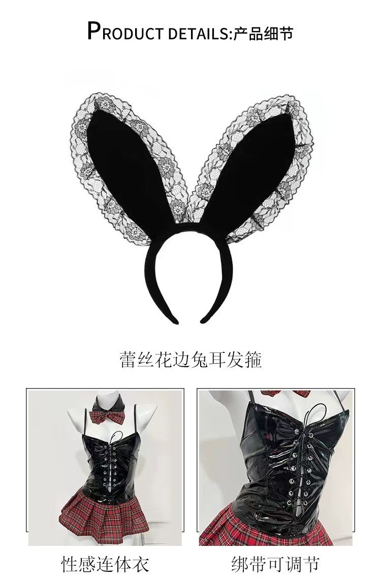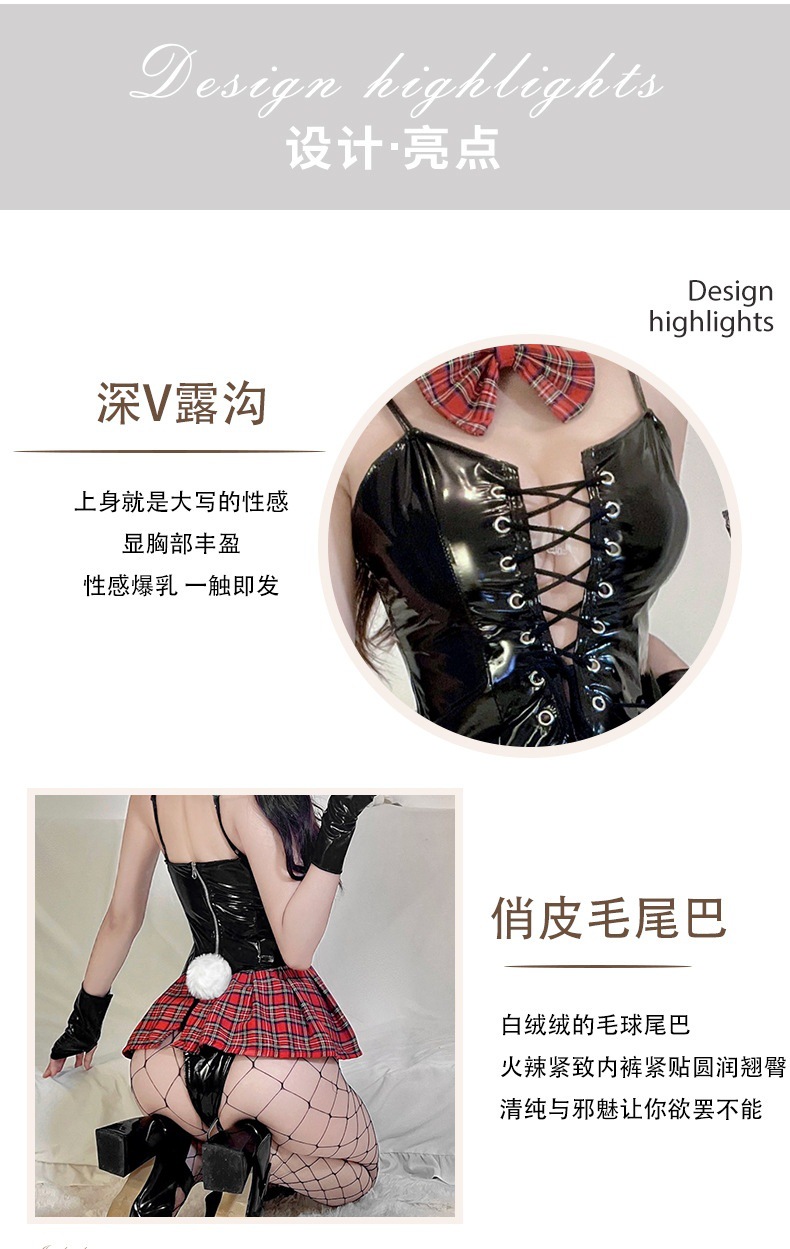 섹시한 속옷, 섹시한 서스펜더, 페이턴트 가죽 레드 체크 무늬 스커트, 유니폼, 토끼 소녀 유혹 스트랩, 학생복, 가죽 코트