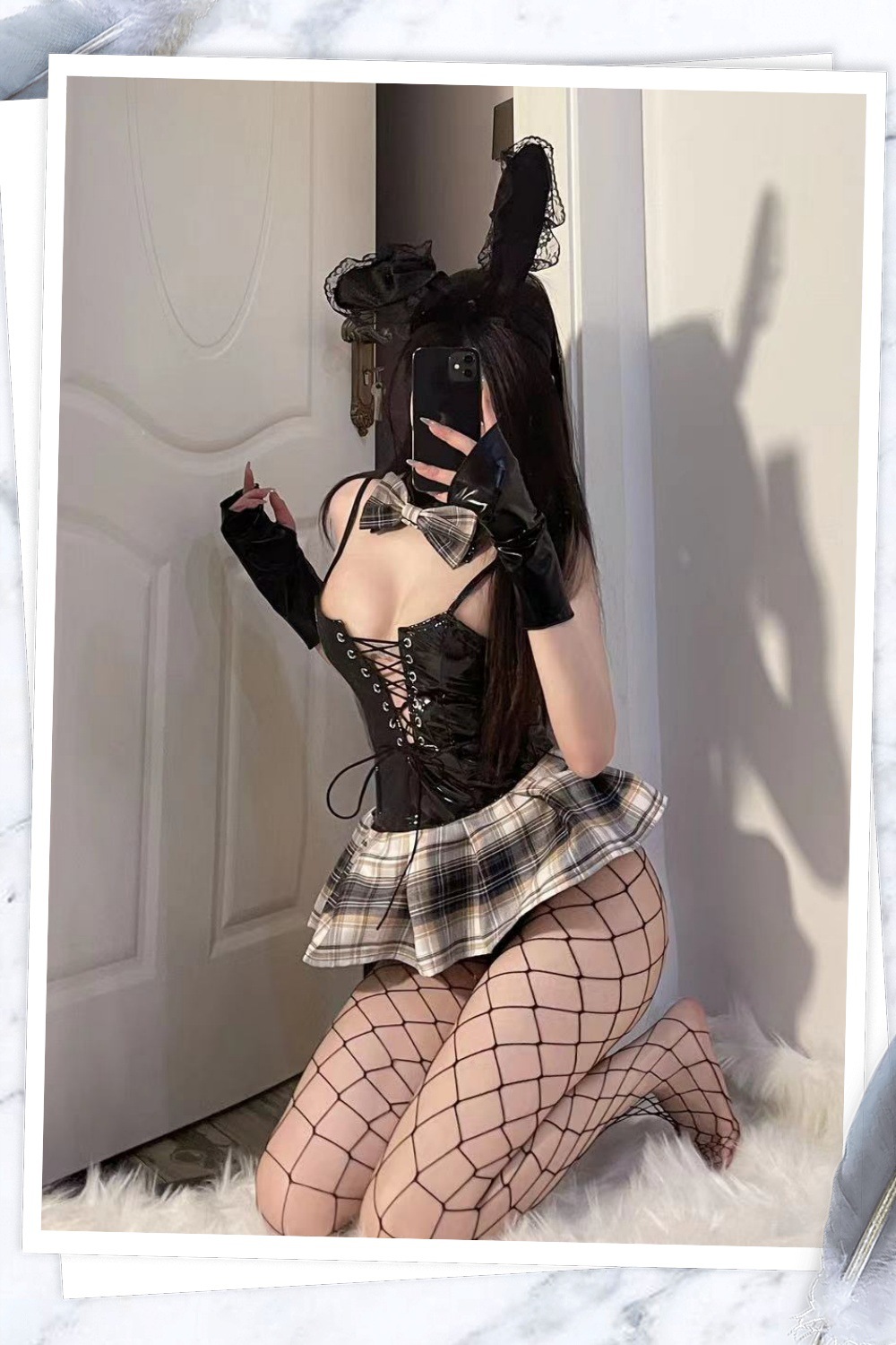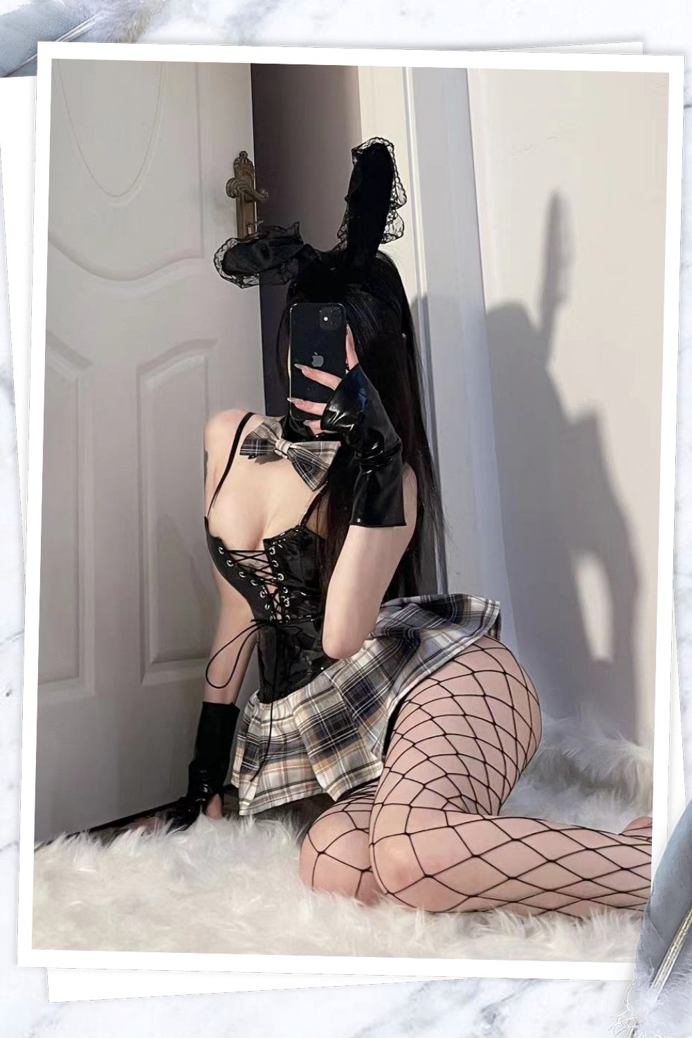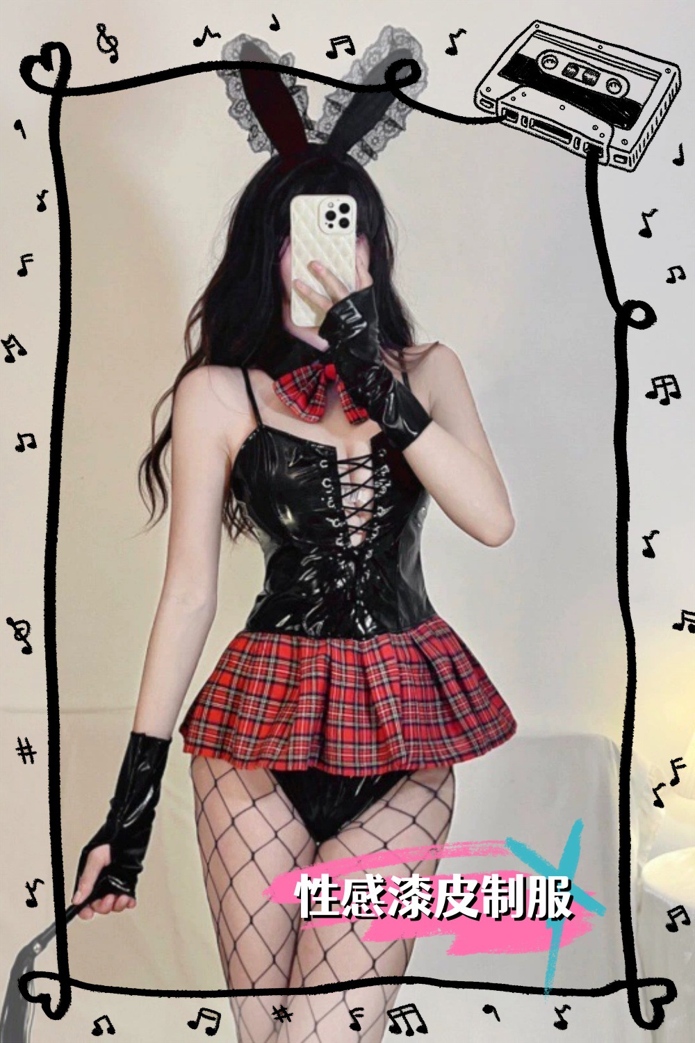 섹시한 속옷, 섹시한 서스펜더, 페이턴트 가죽 레드 체크 무늬 스커트, 유니폼, 토끼 소녀 유혹 스트랩, 학생복, 가죽 코트스토어 가기