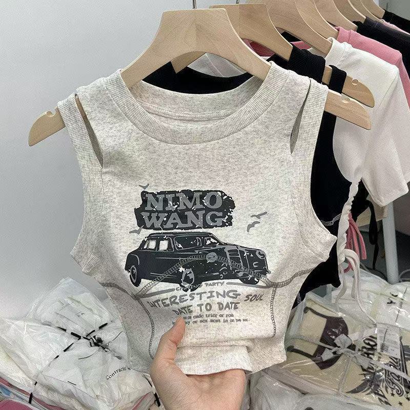 소녀를위한 달콤한 쿨 스타일 짧은 조끼 2025 여름 새로운 여성의 보물 세련된 디자인 센스 민소매 탑 티셔츠 슬링스토어 가기