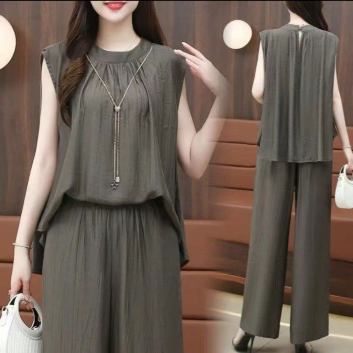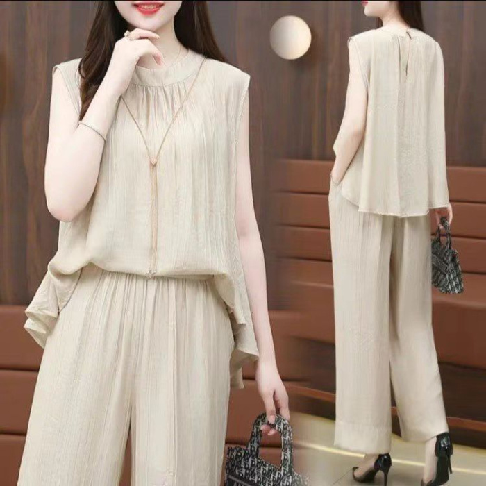 2025 여름 새로운 스타일 작은 우아한 느슨한 슬리밍 디자인 센스 짧은 소매 탑 넓은 다리 바지 투피스 목걸이