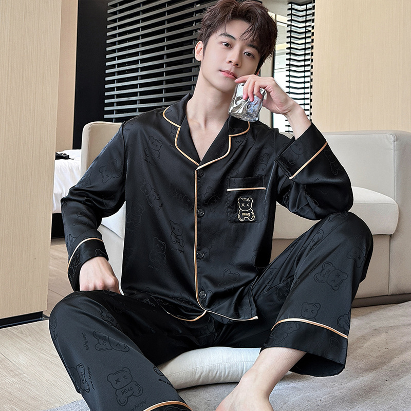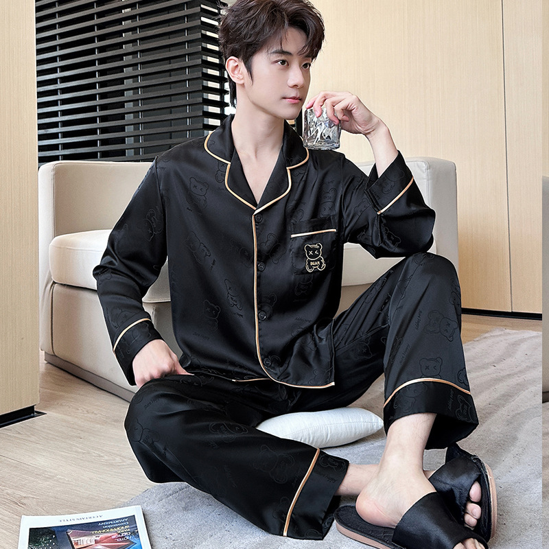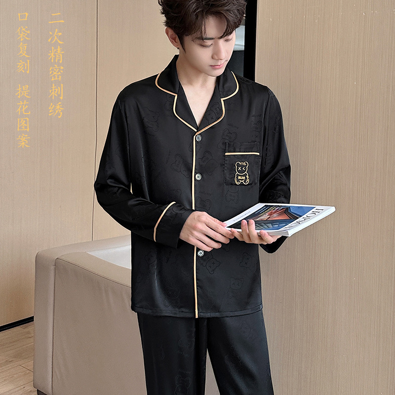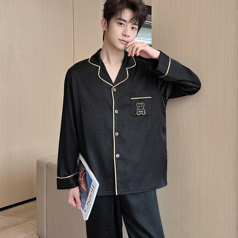 곰 만화 자카드 검은 얼음 실크 잠옷 남자의 봄과 가을 긴 소매 얇은 여름 잠옷 세트 퇴색하지 않습니다