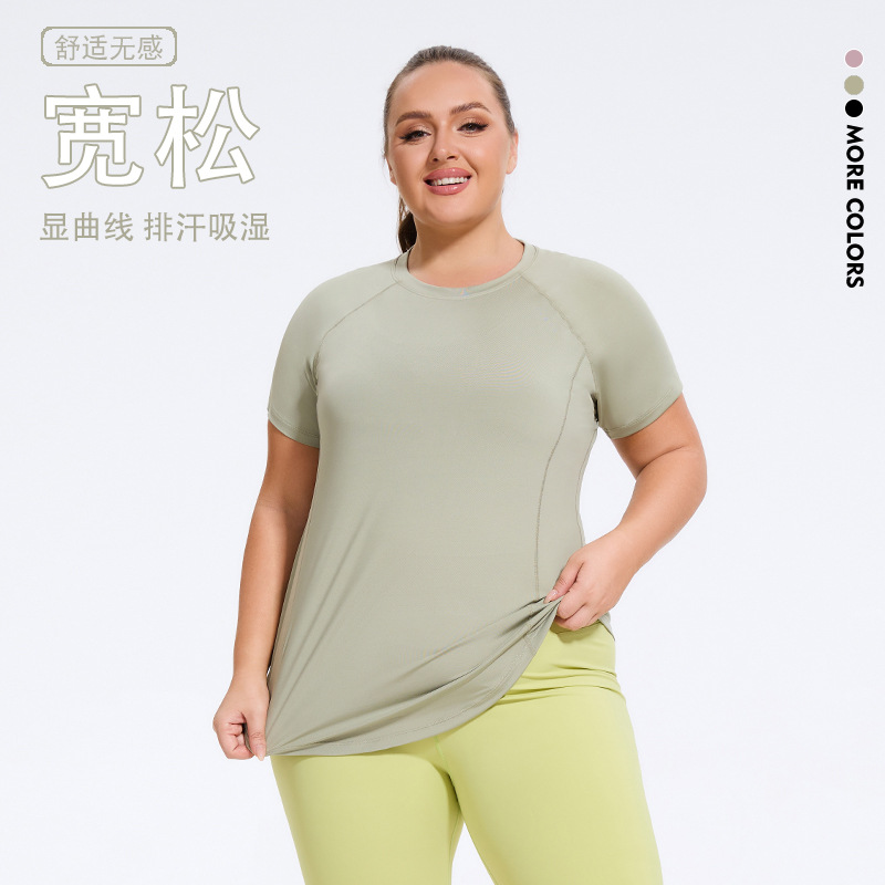 유럽과 미국의 플러스 사이즈 느슨한 스포츠 탑 여성 티셔츠 빠른 건조 옷 통기성 슬리밍 피트니스 옷 실행 요가 옷 짧은 소매