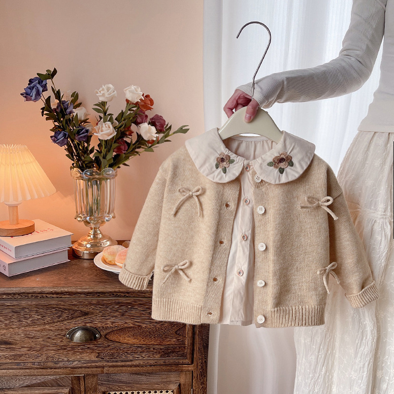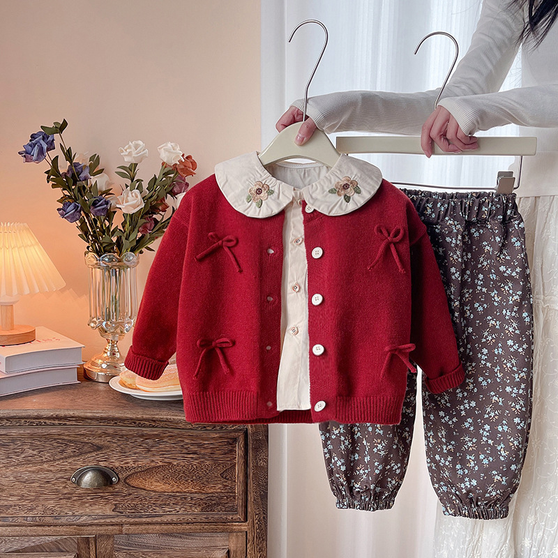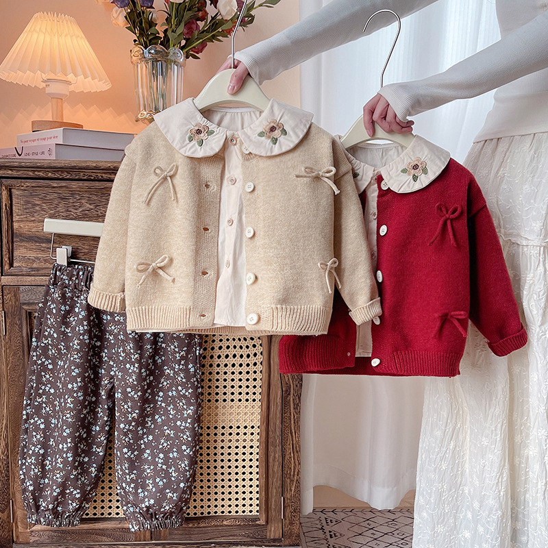 소녀의 봄 세트 봄과 가을 새로운 니트 활 스웨터 긴팔 캐주얼 어린이 3 피스 유행 세트스토어 가기
