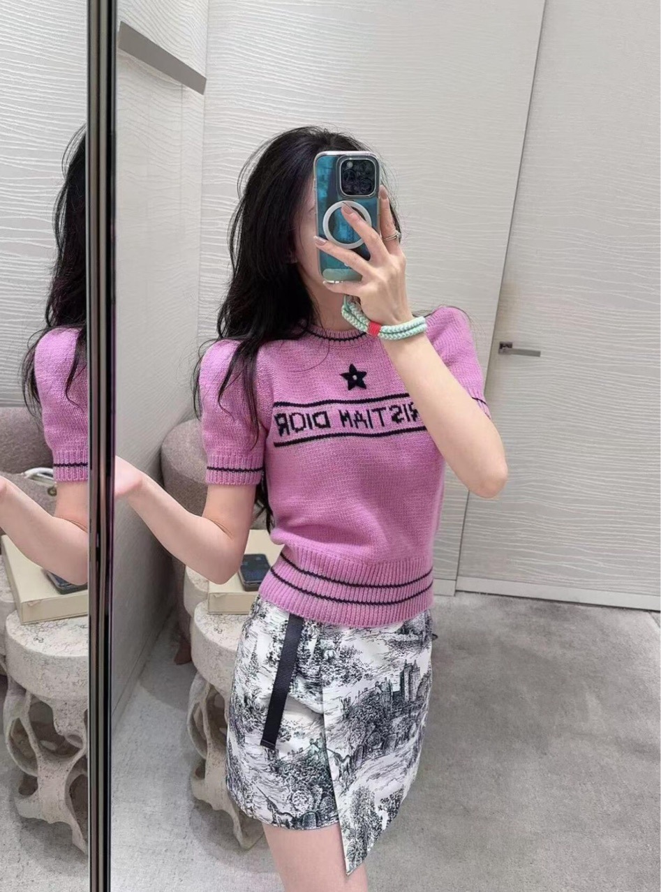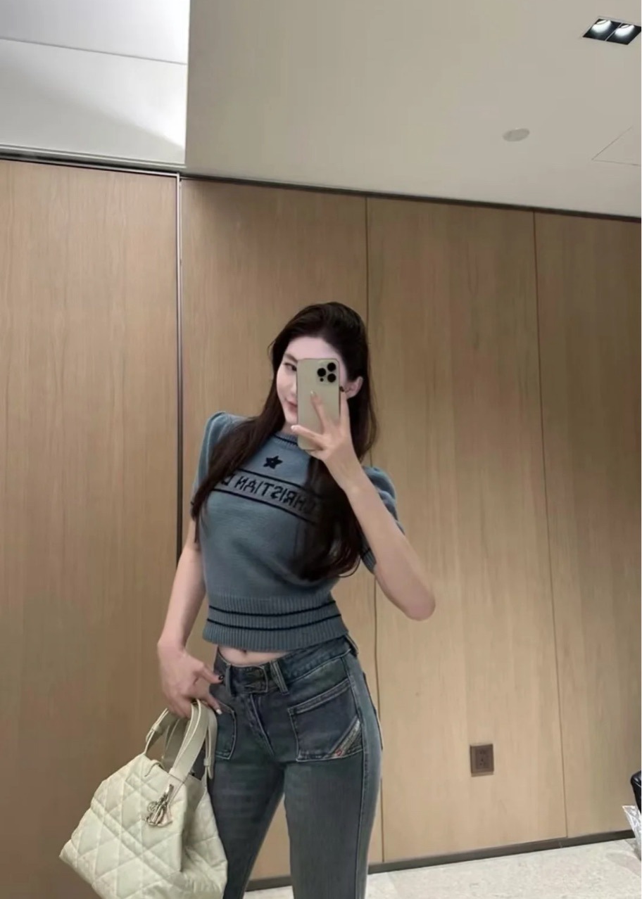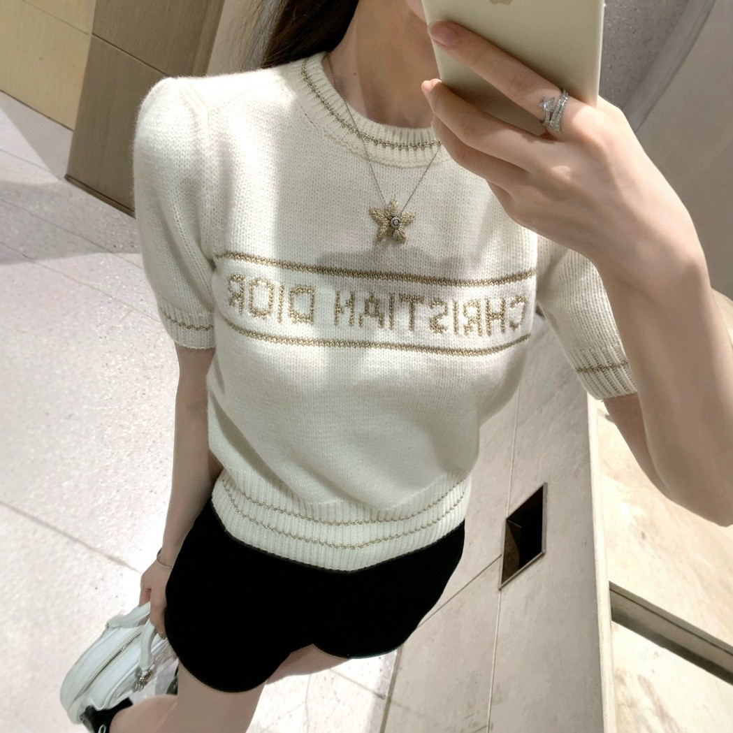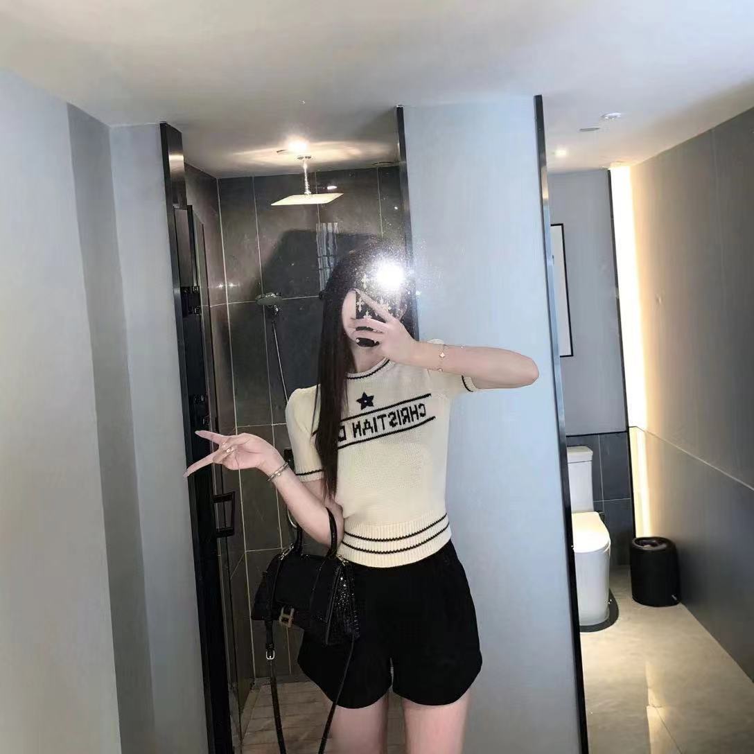 D 크루 넥 반팔 스웨터 달콤한 소녀 스타일 나이를 줄이는 슬림 핏 올 매치 자수 탑 칼리지 스타일 샤넬 스타일스토어 가기