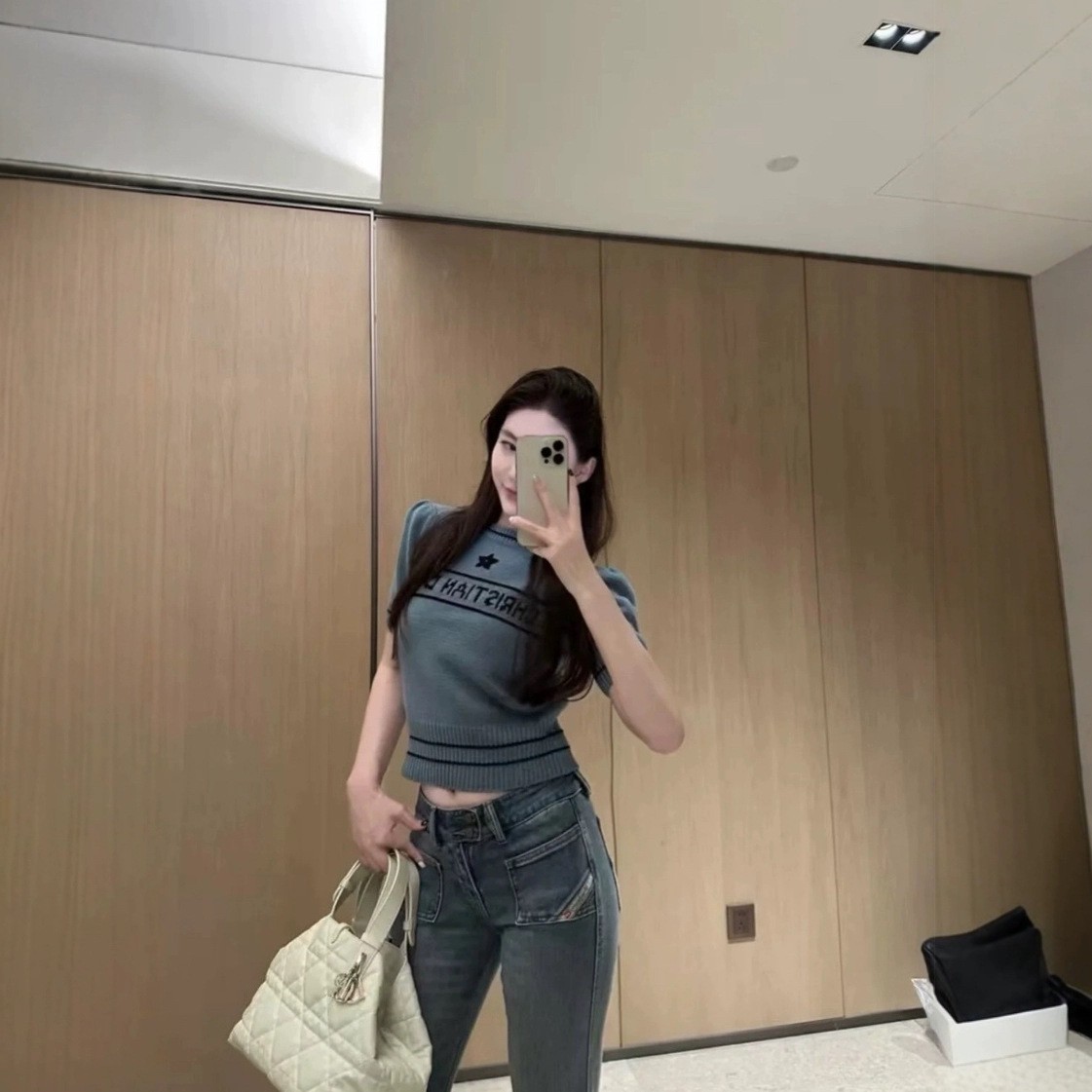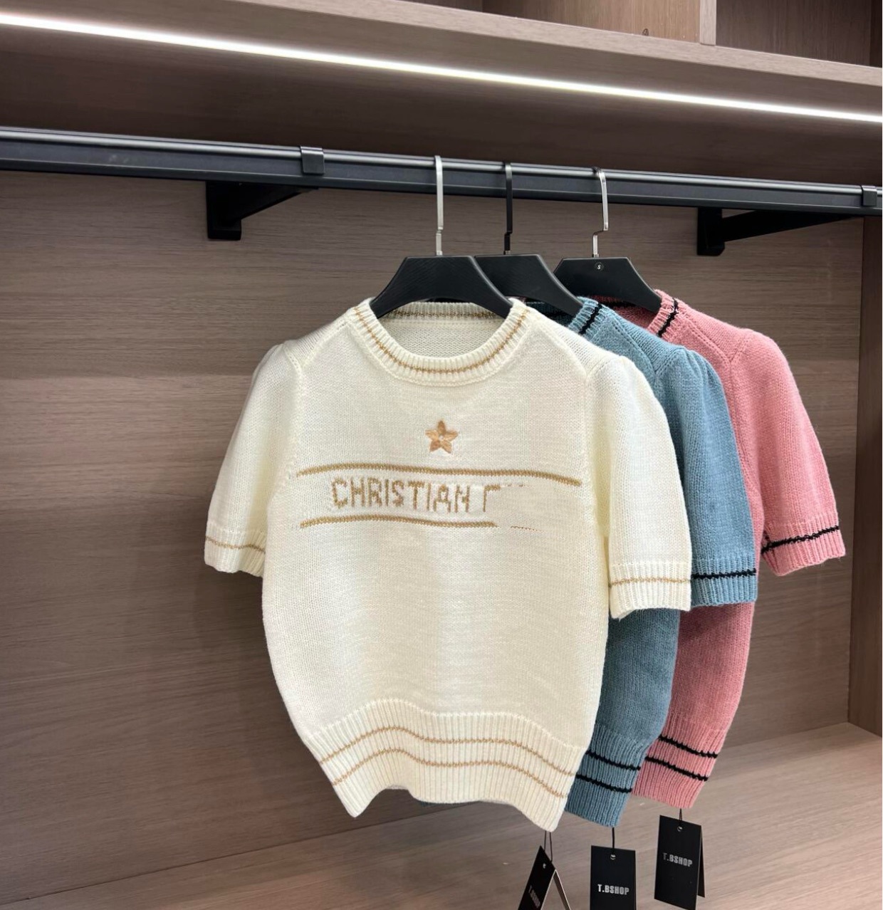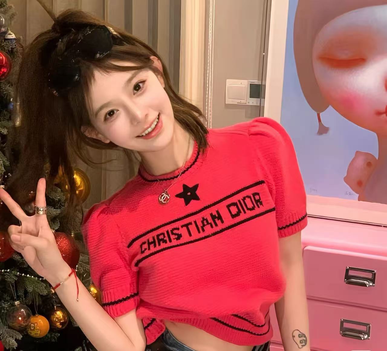D 크루 넥 반팔 스웨터 달콤한 소녀 스타일 나이를 줄이는 슬림 핏 올 매치 자수 탑 칼리지 스타일 샤넬 스타일스토어 가기