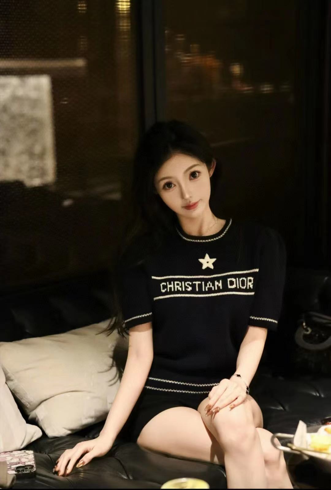 D 크루 넥 반팔 스웨터 달콤한 소녀 스타일 나이를 줄이는 슬림 핏 올 매치 자수 탑 칼리지 스타일 샤넬 스타일