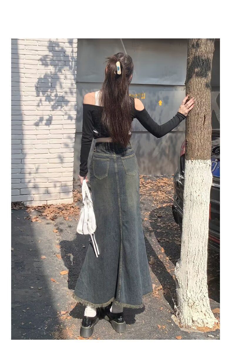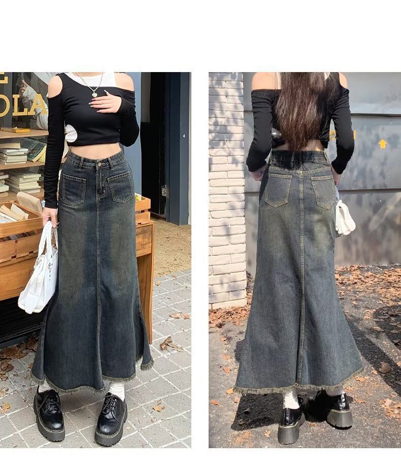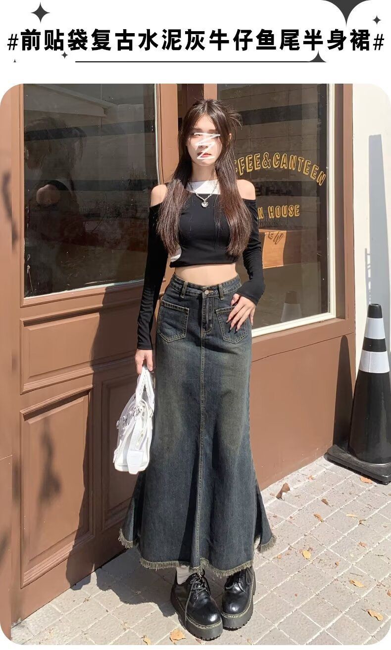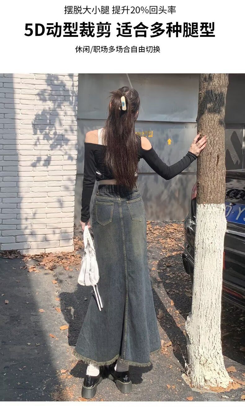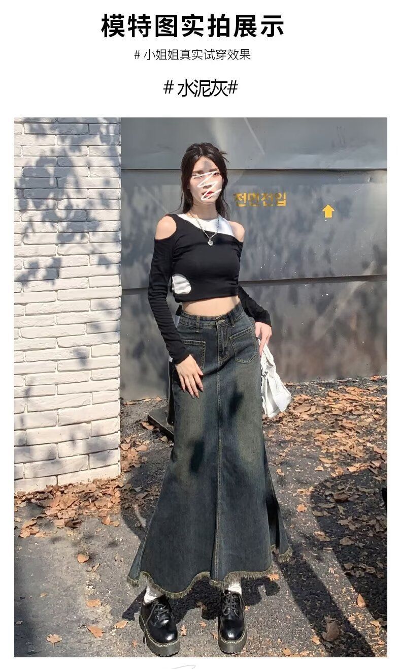 헤어 에지 시멘트 회색 데님 스커트 여성의 봄과 가을 새로운 슬리밍 A 라인 중간 길이의 피쉬 테일 엉덩이 데님 스커트스토어 가기