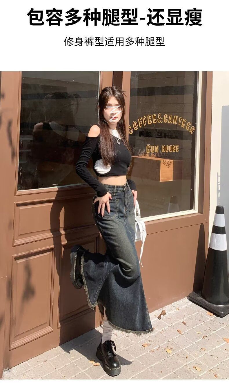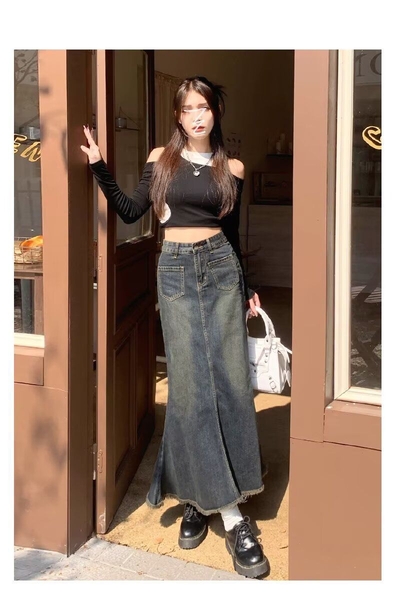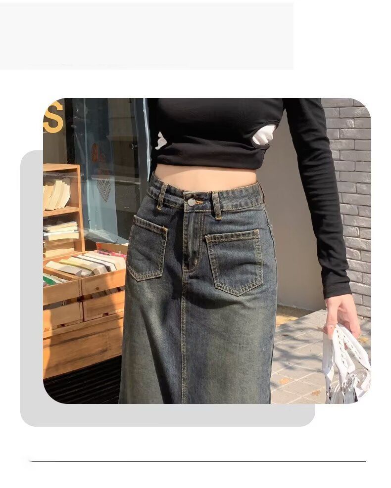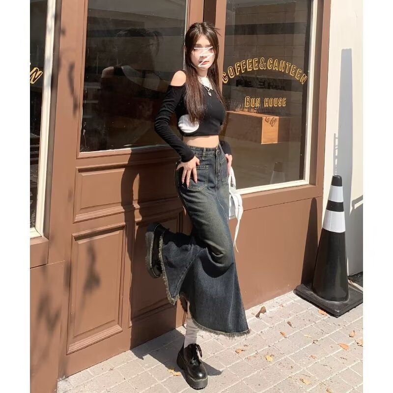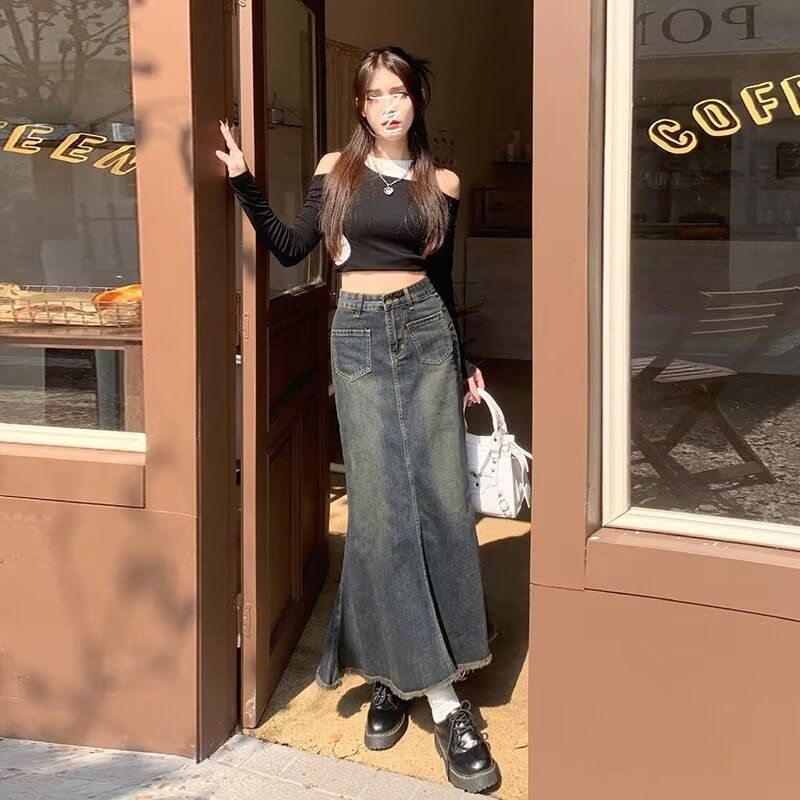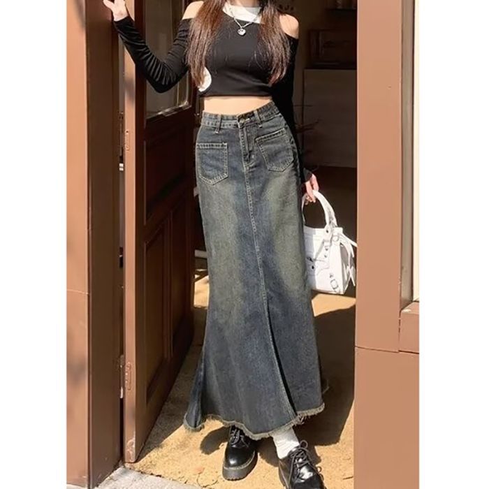 헤어 에지 시멘트 회색 데님 스커트 여성의 봄과 가을 새로운 슬리밍 A 라인 중간 길이의 피쉬 테일 엉덩이 데님 스커트스토어 가기