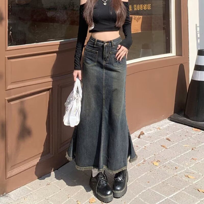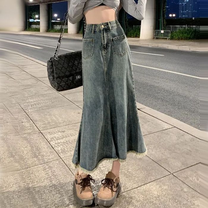 헤어 에지 시멘트 회색 데님 스커트 여성의 봄과 가을 새로운 슬리밍 A 라인 중간 길이의 피쉬 테일 엉덩이 데님 스커트