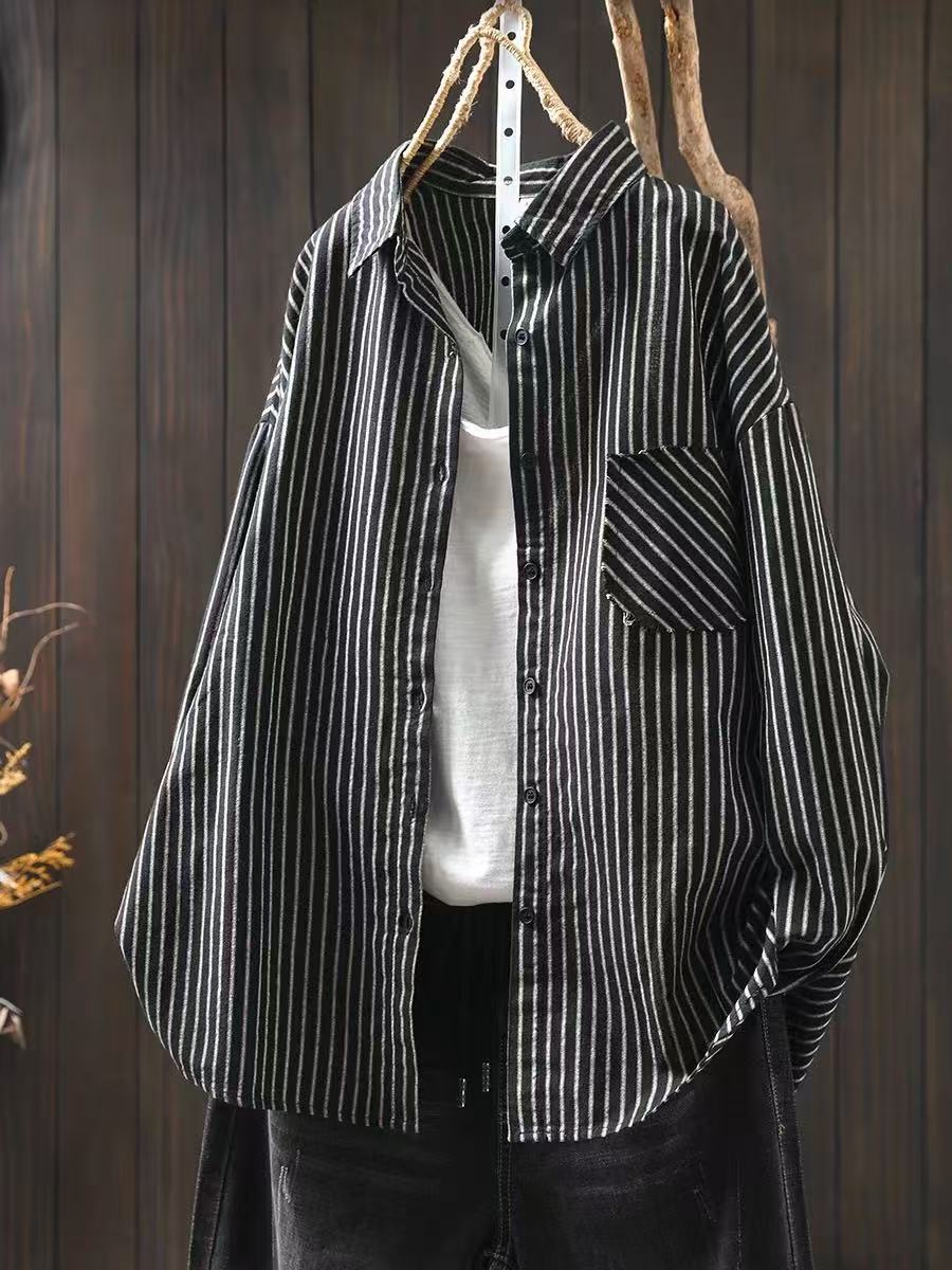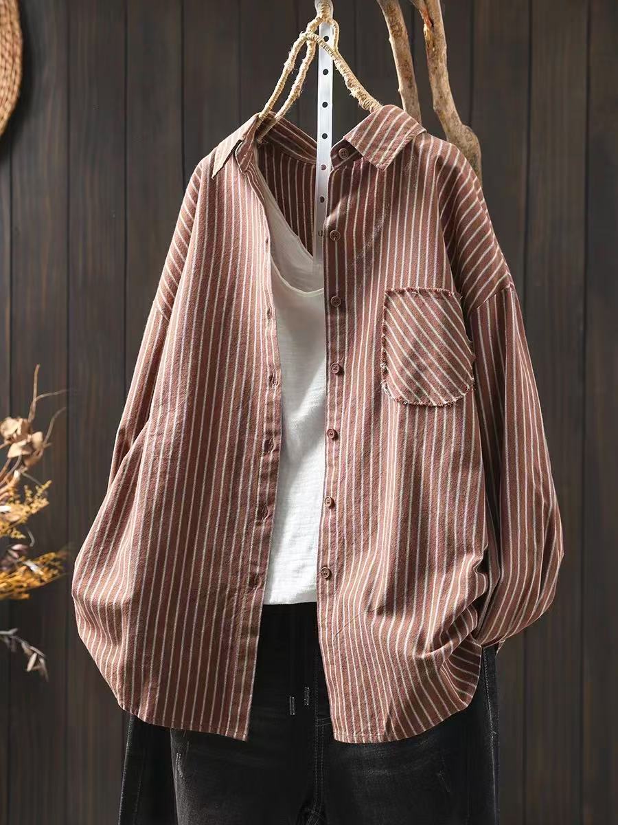 봄 새로운 복고풍 줄무늬 셔츠 여성용 면 긴 소매 최고 느슨한 플러스 사이즈 캐주얼 셔츠 95013스토어 가기