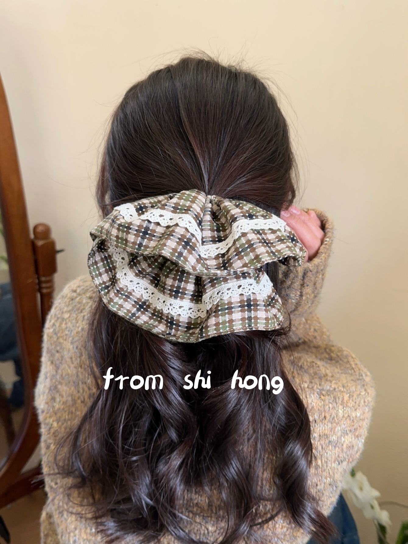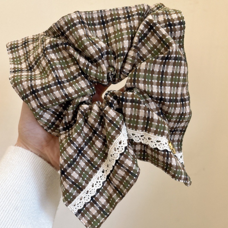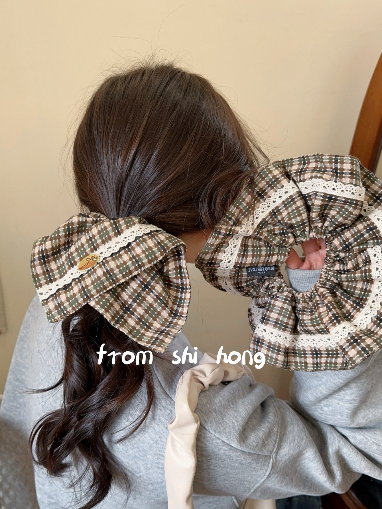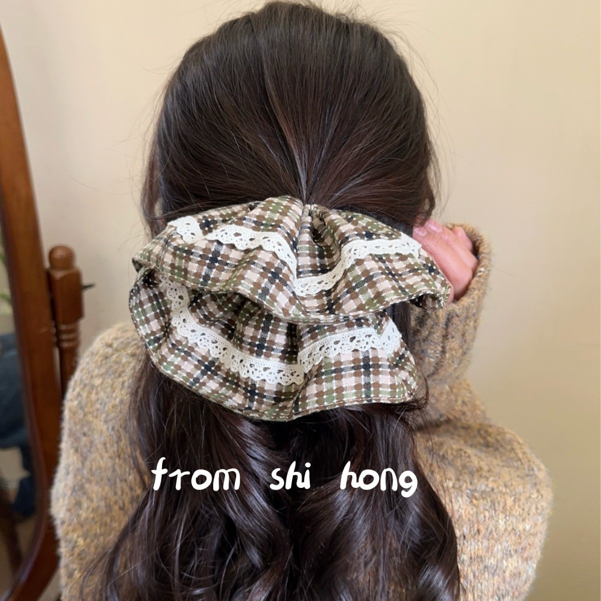 신선한 격자 무늬 패브릭 레이스 대형 Intestine 헤어 링 소녀 모리 스타일 낮은 포니 테일 스퀘어 스카프 머리띠 헤어 스트랩 헤어 액세서리