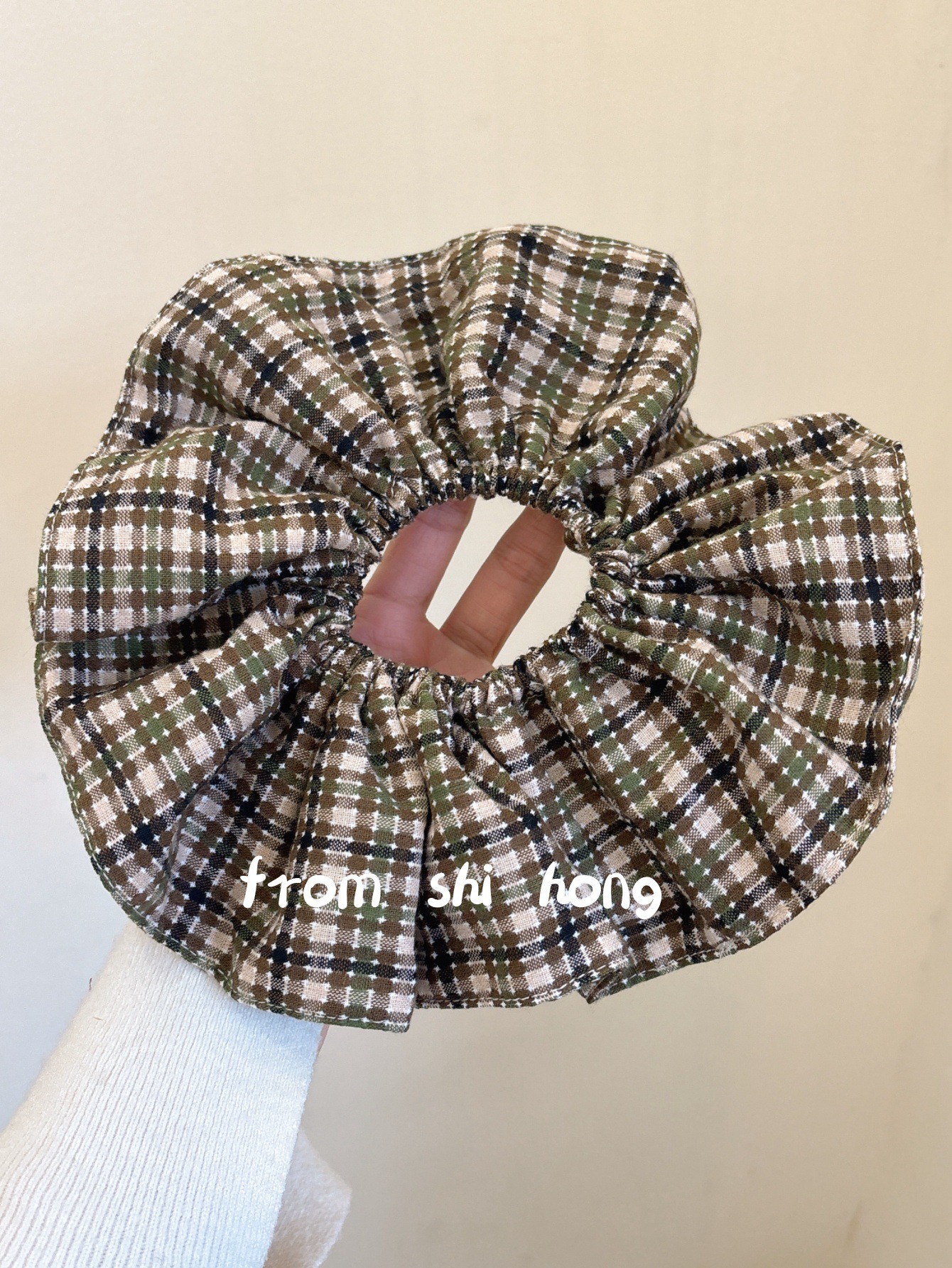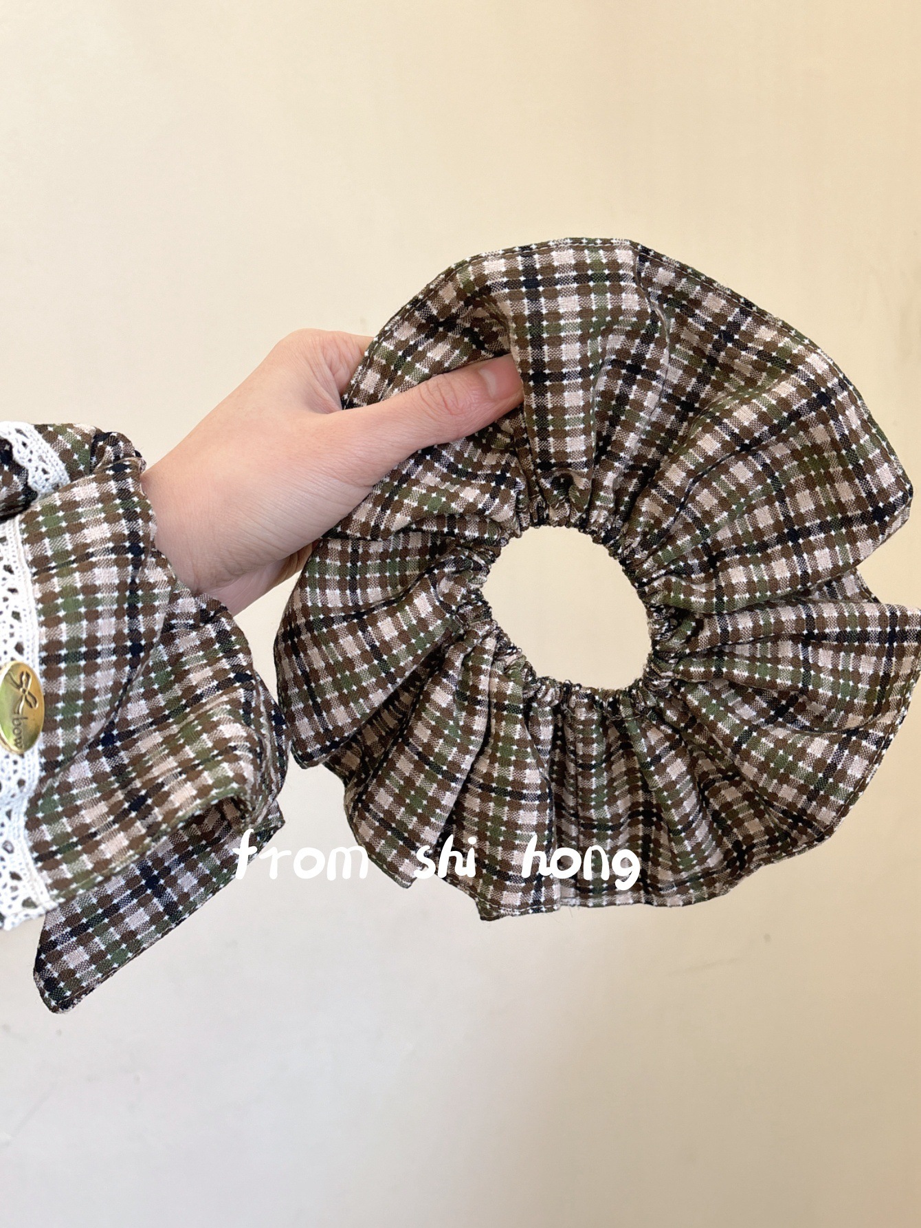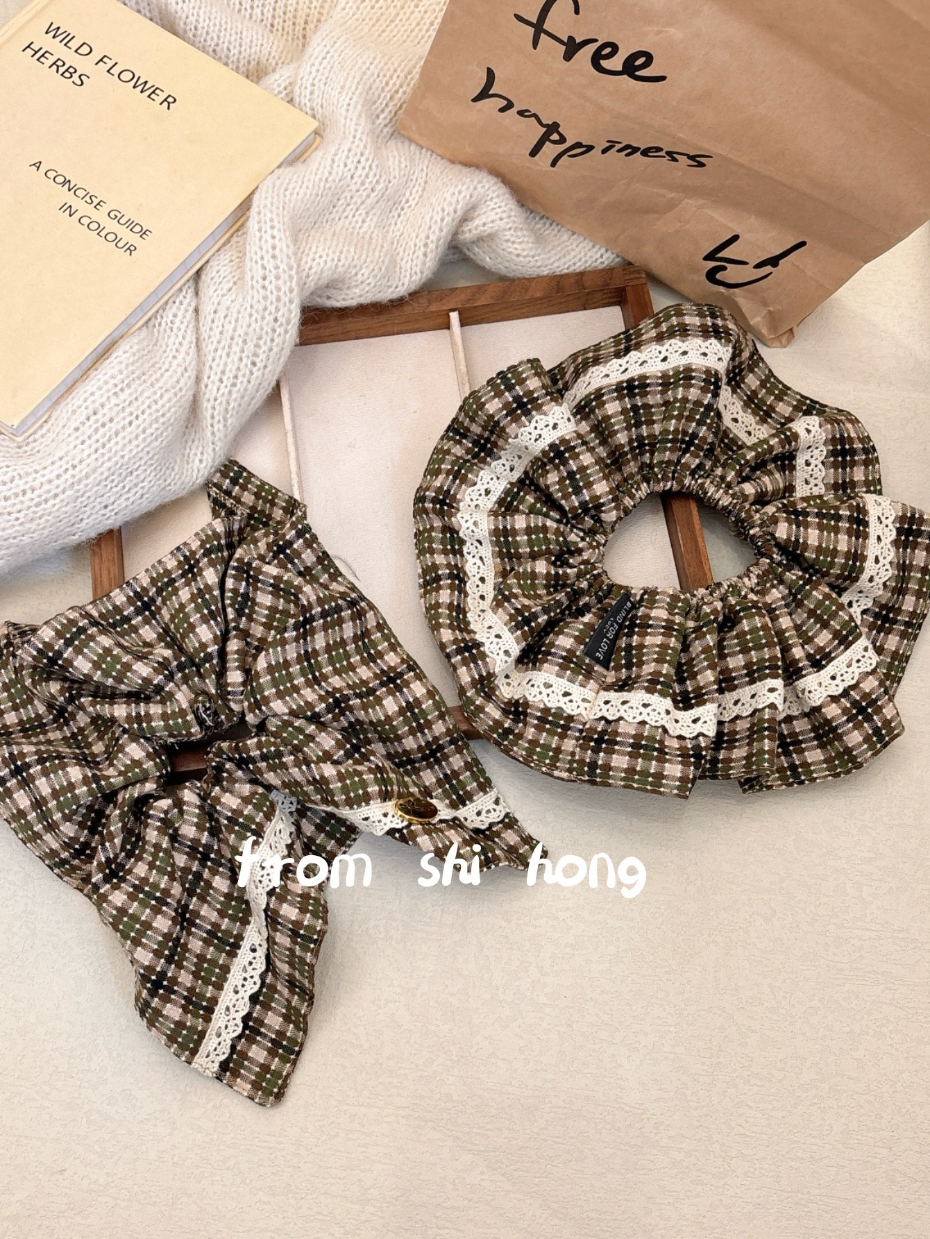 • 브라운과 그린 체크 무늬 레이스 머리끈