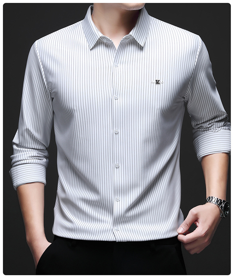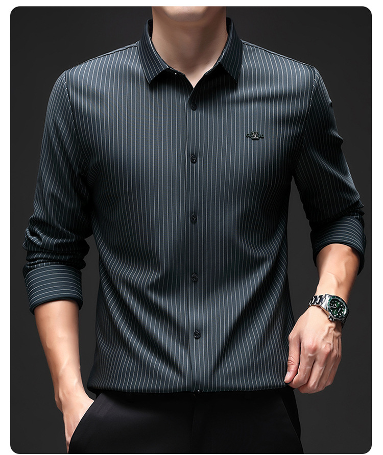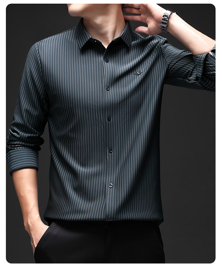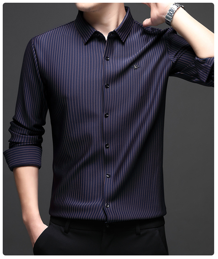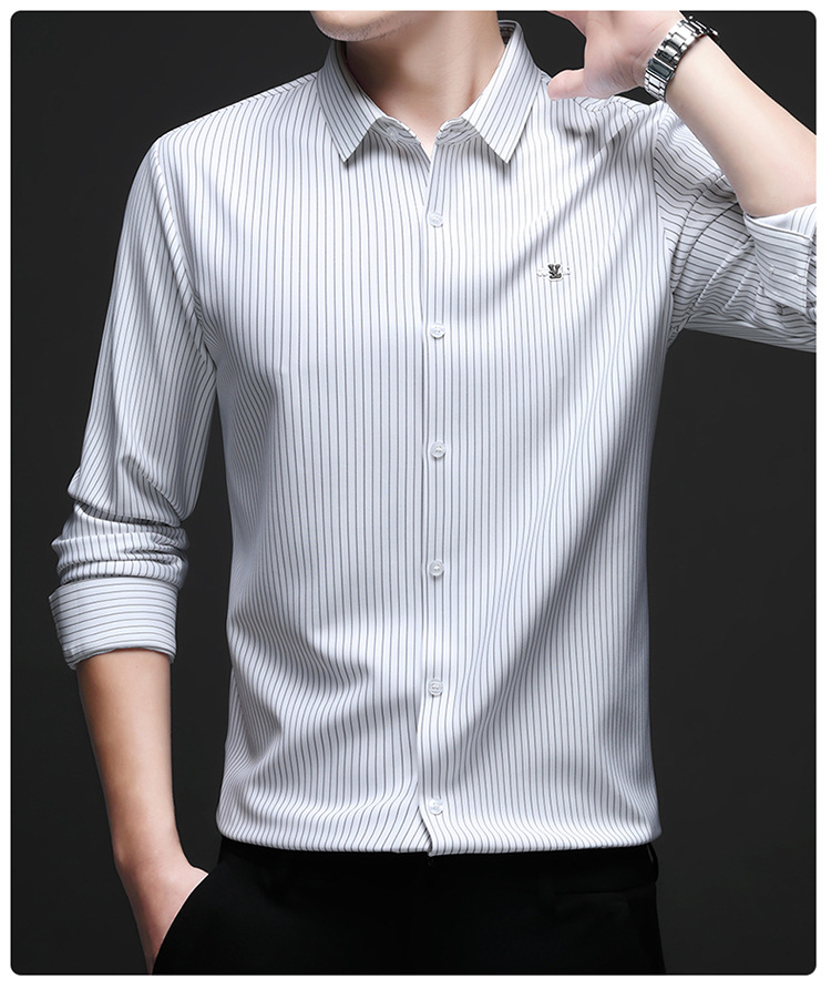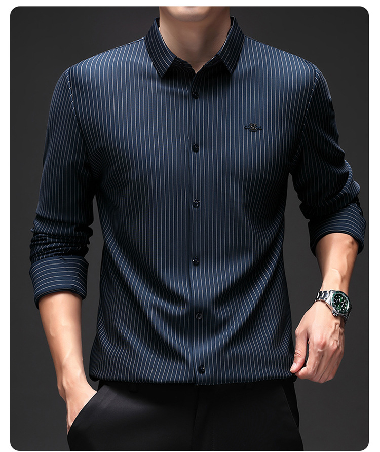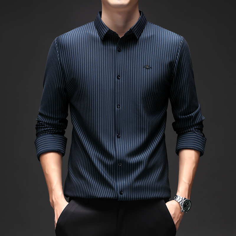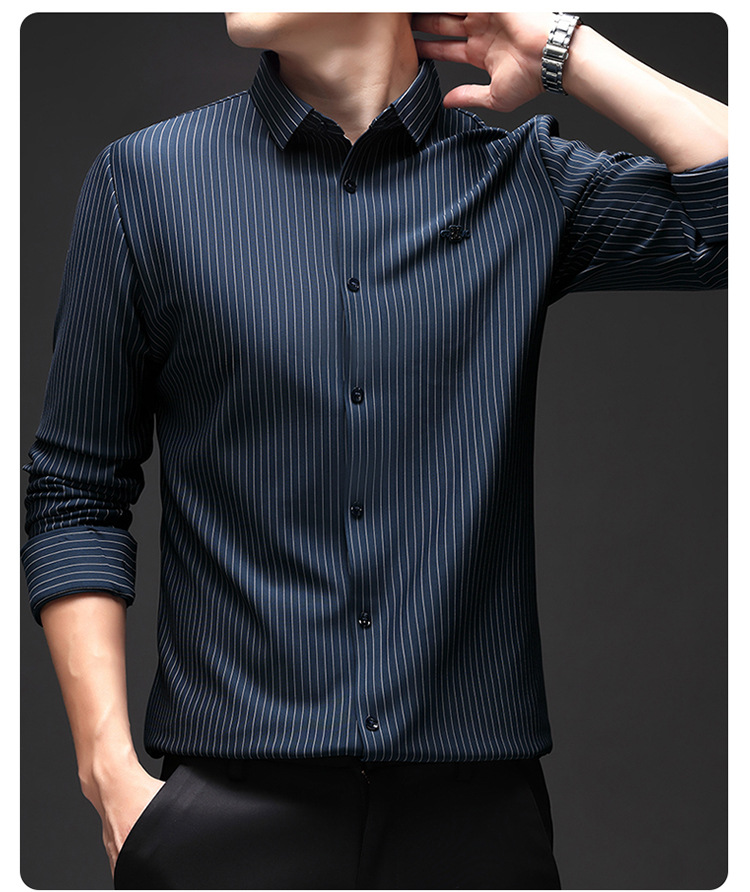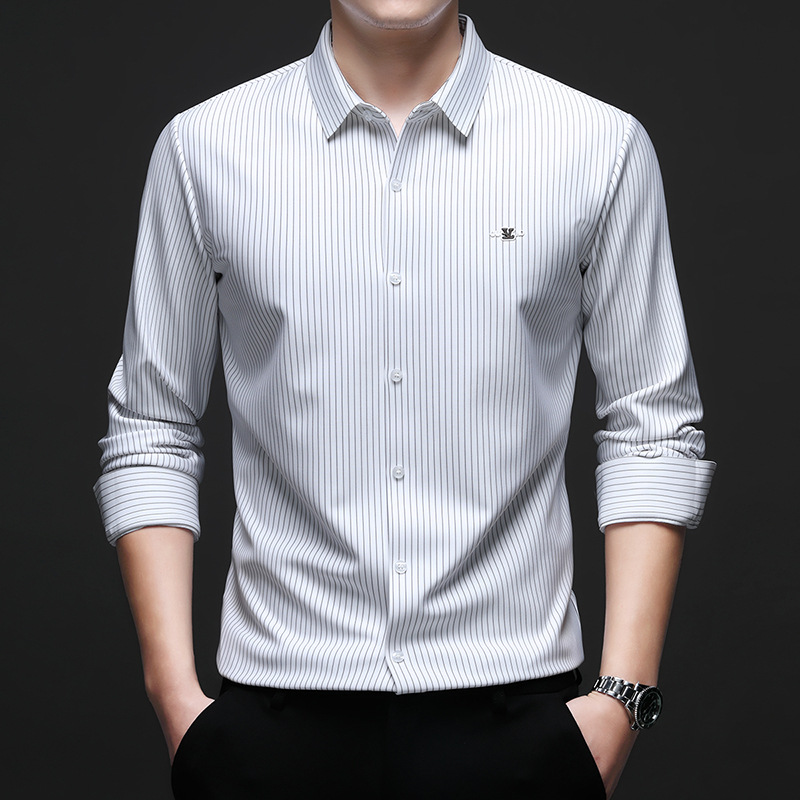 아이스 실크 스트레치 스트라이프 긴팔 셔츠 남자의 봄과 가을 비 다림질 사업 캐주얼 올매치 베이스 셔츠 주름 방지 셔츠