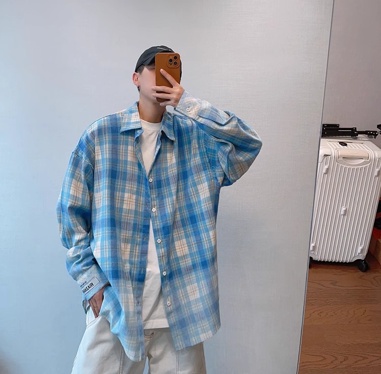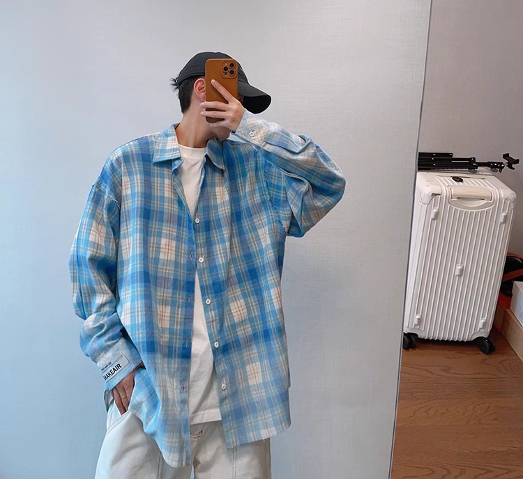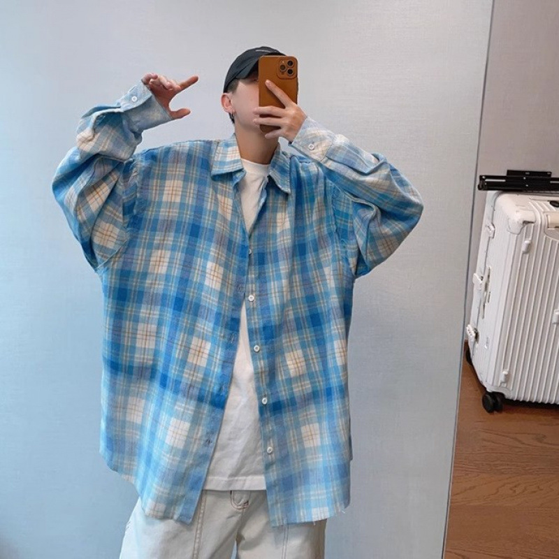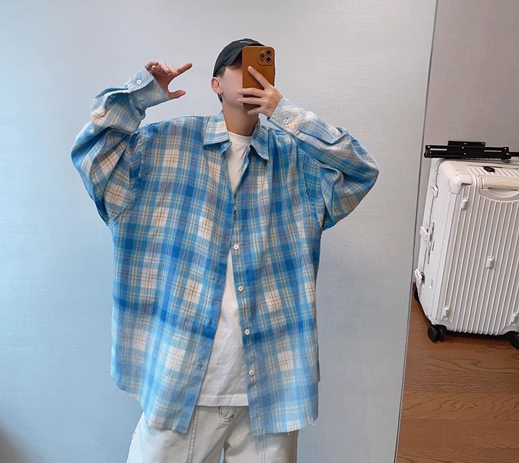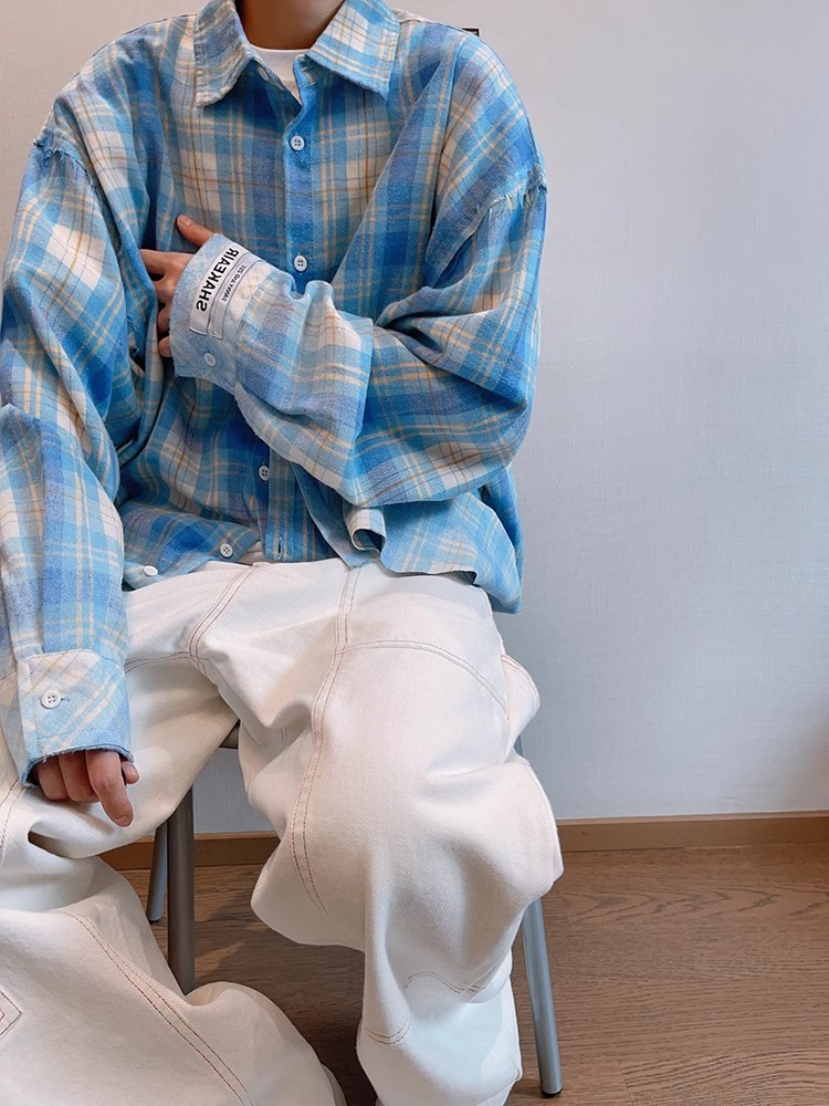 2024小众春季复古百搭水蓝色做旧毛边渐变印花格子长袖衬衫男