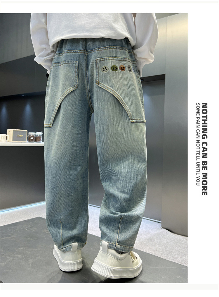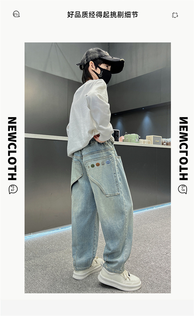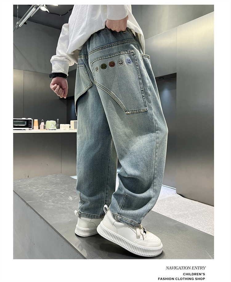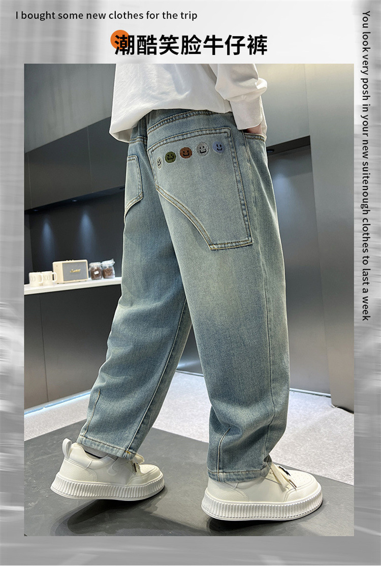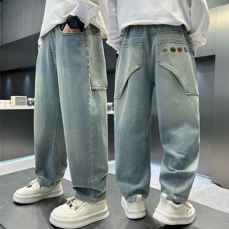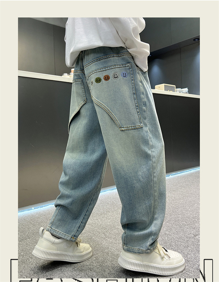 소년 청바지 봄과 가을 2025 새로운 큰 어린이 스트레이트 스마일리 페이스 라벨 넓은 다리 바지 소년 잘 생긴 느슨한 바지스토어 가기