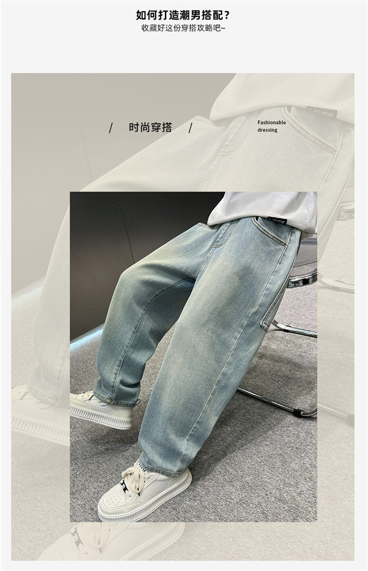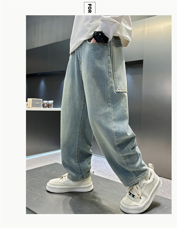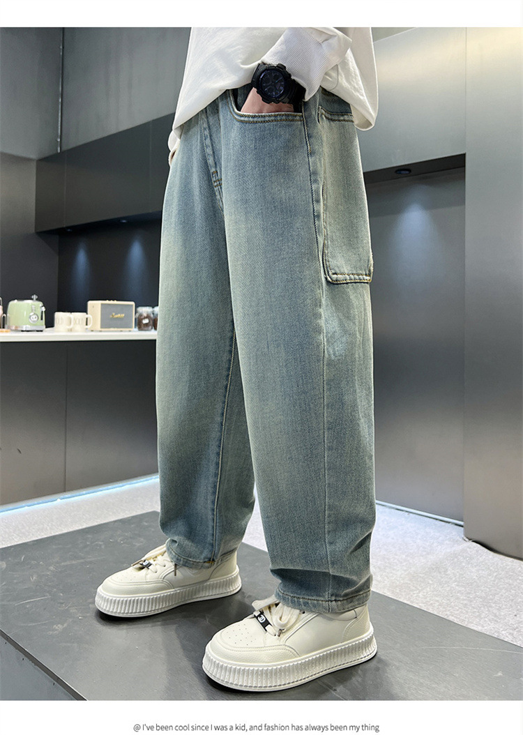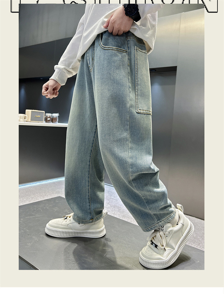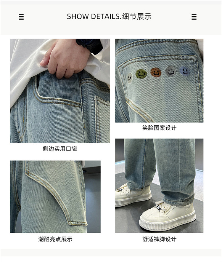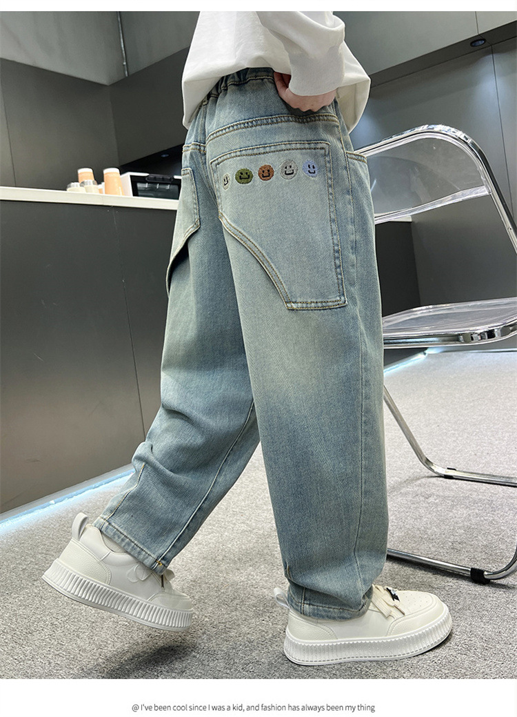 소년 청바지 봄과 가을 2025 새로운 큰 어린이 스트레이트 스마일리 페이스 라벨 넓은 다리 바지 소년 잘 생긴 느슨한 바지스토어 가기