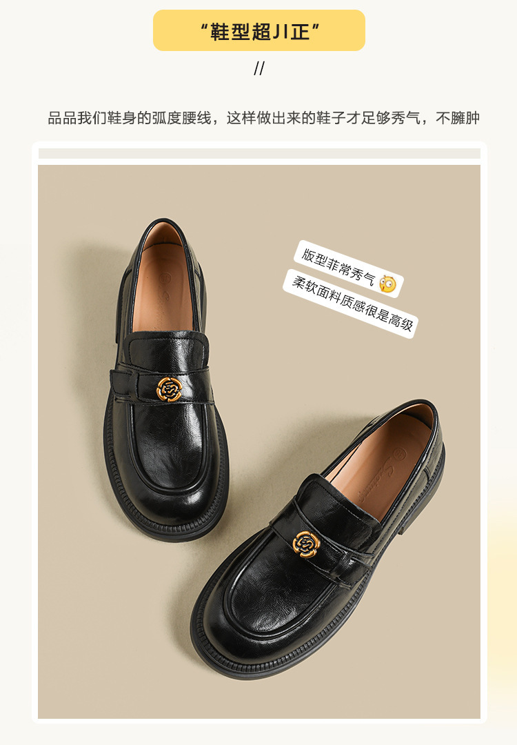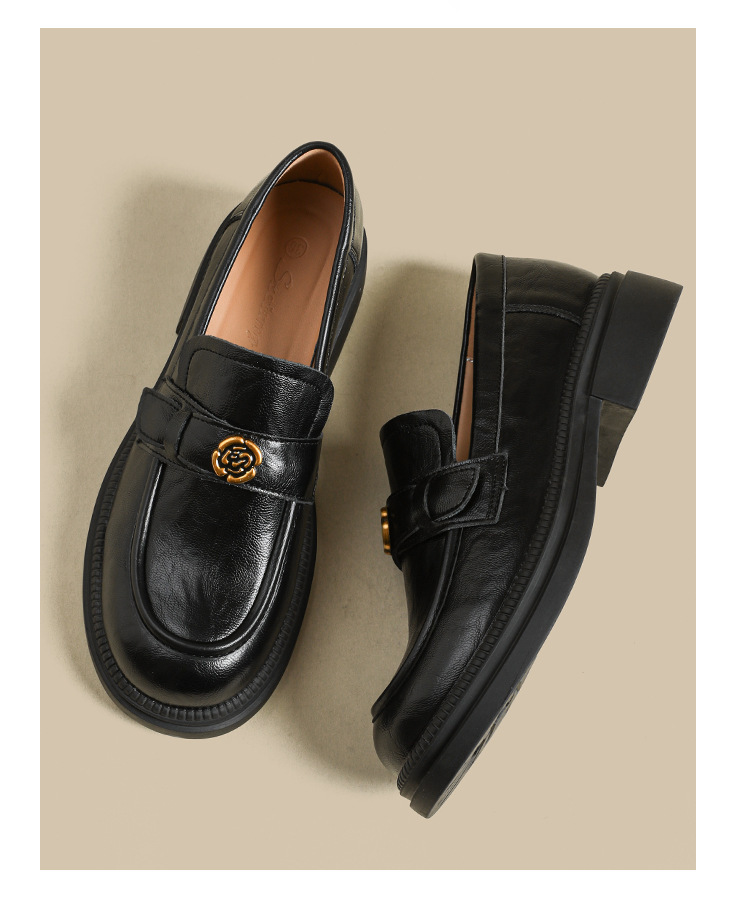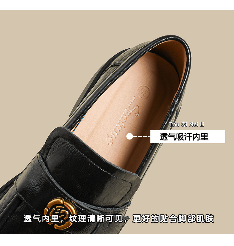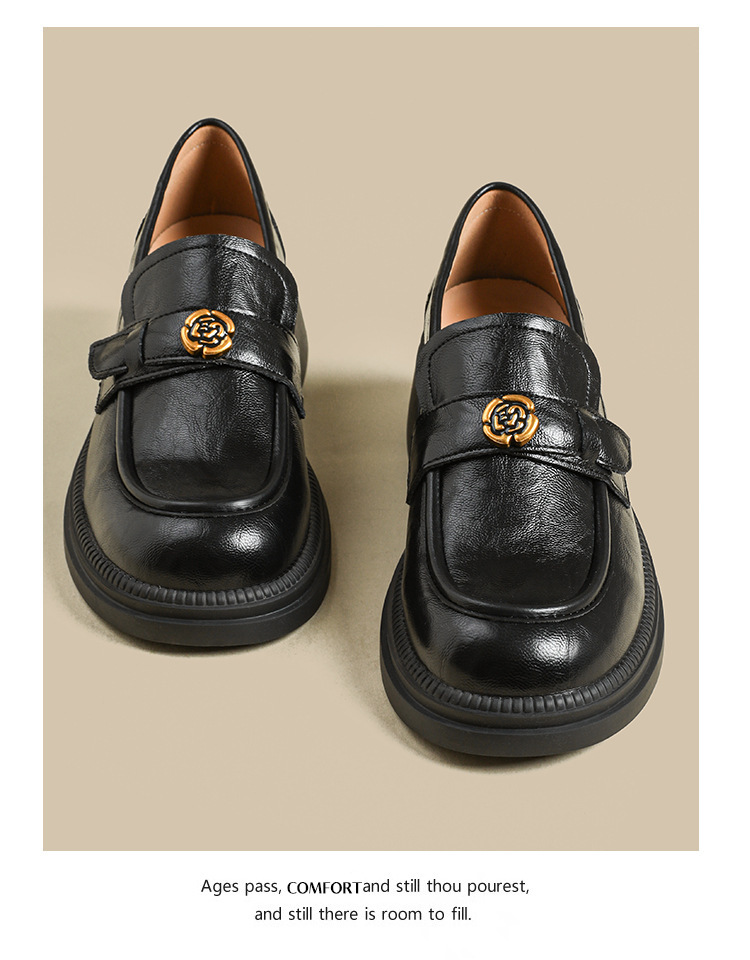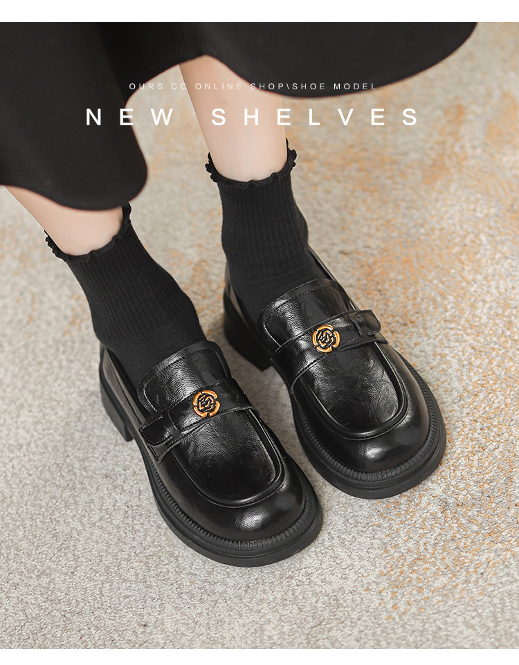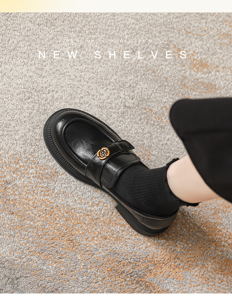 여성용 말가죽 질감의 블랙 카멜리아 로퍼 2025 신상 봄, 가을 밑창 영국 스타일 복고풍 작은 가죽 신발스토어 가기