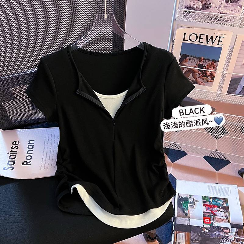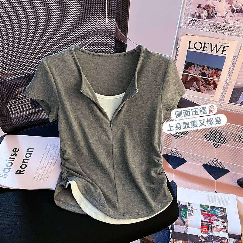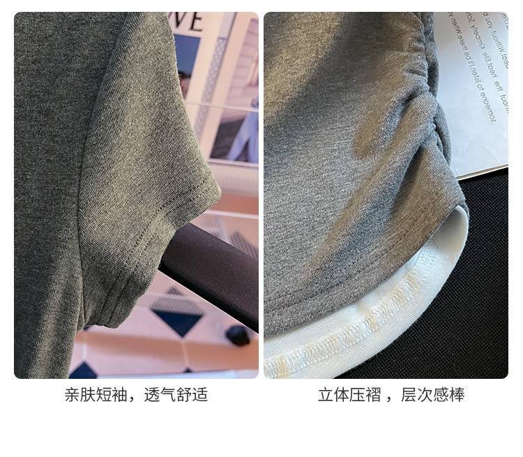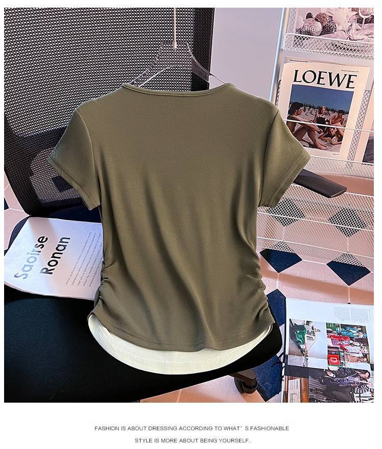 틈새 대비 컬러 V 넥 반팔 티셔츠 여성 여름 디자인 센스 러플 슬림 투피스 짧은 티셔츠 숄더 탑