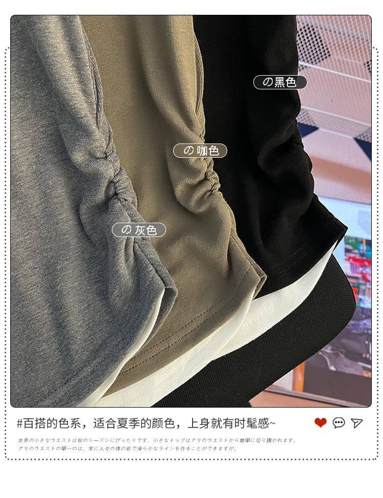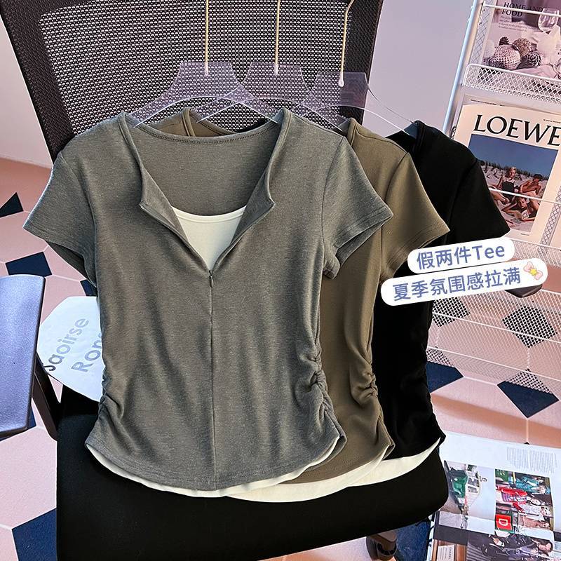 틈새 대비 컬러 V 넥 반팔 티셔츠 여성 여름 디자인 센스 러플 슬림 투피스 짧은 티셔츠 숄더 탑스토어 가기