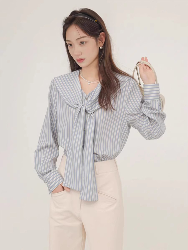 프랑스 하이 엔드 최고 해군 칼라 스트랩 디자인 블루 스트라이프 셔츠 여성의 봄 느슨한 긴팔 셔츠스토어 가기