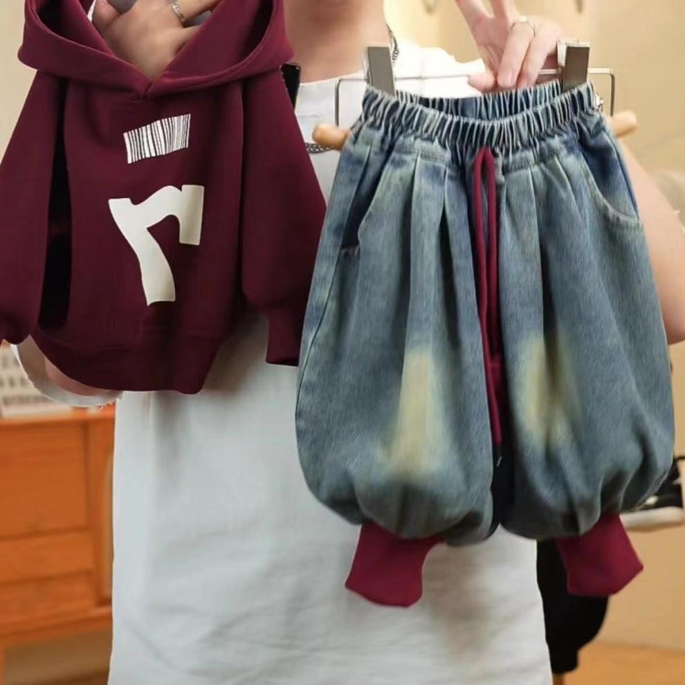 소년의 가을/겨울 기모 스웨덴 세트 2024 새로운 어린이 한국 인쇄 탑 유행 청바지 투피스 세트