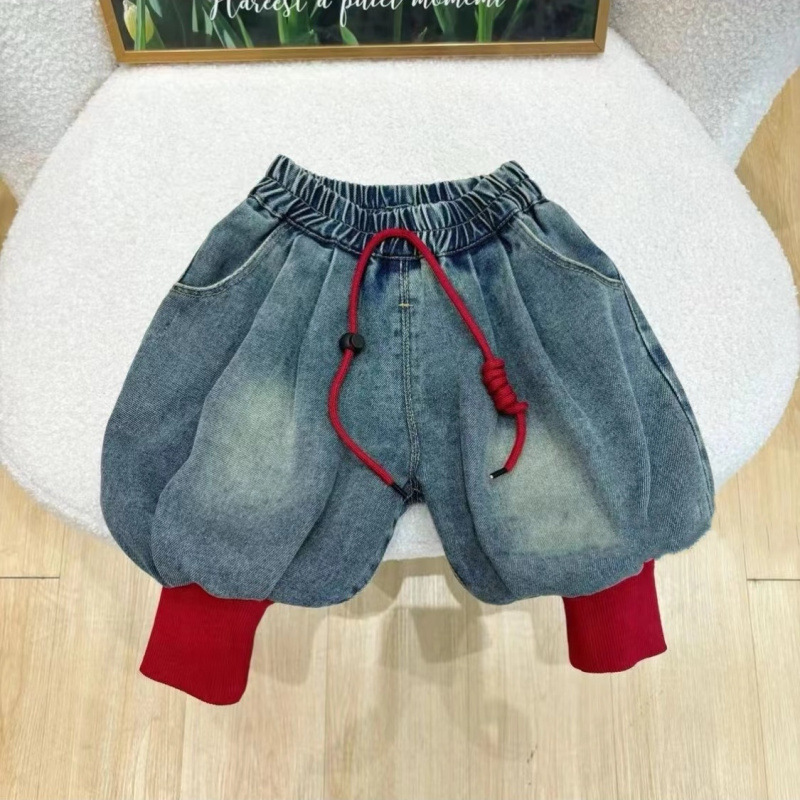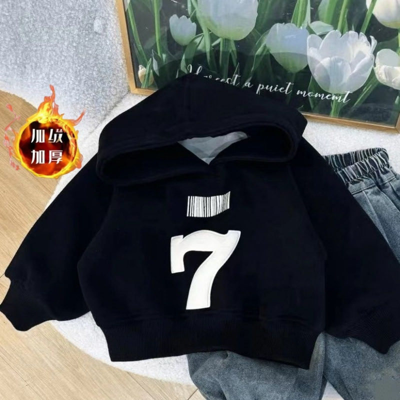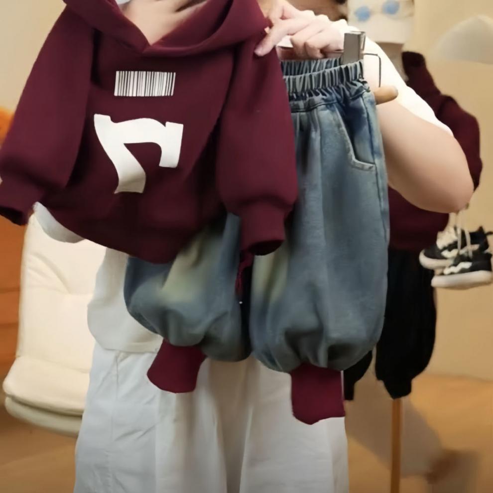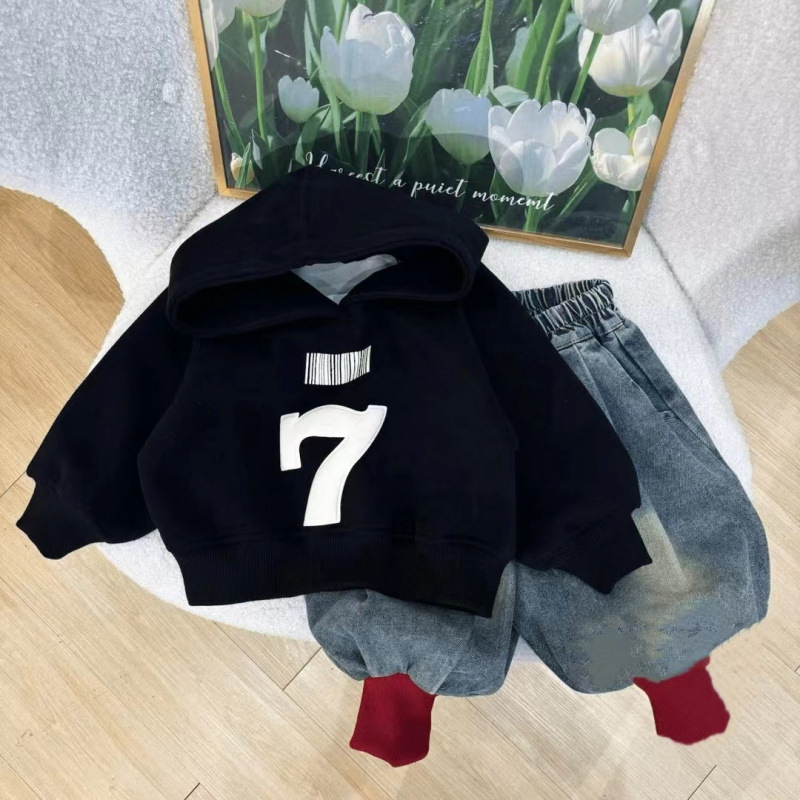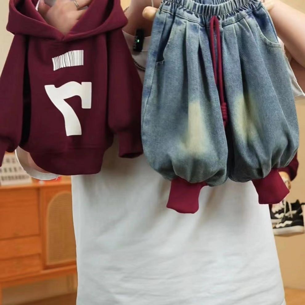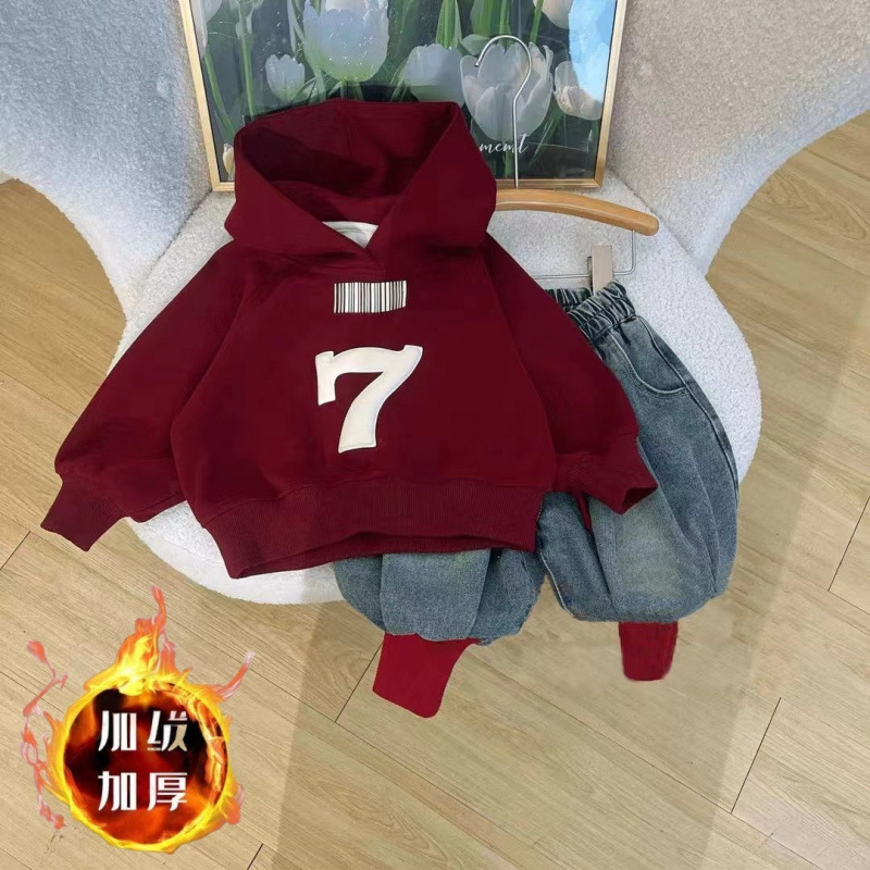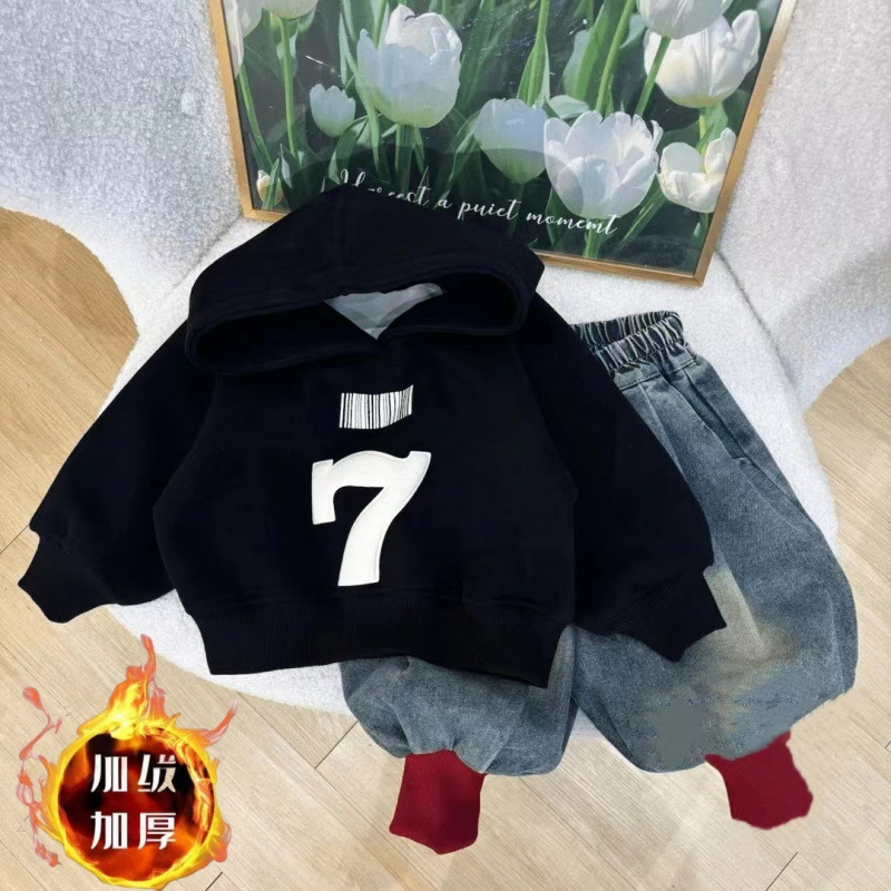 소년의 가을/겨울 기모 스웨덴 세트 2024 새로운 어린이 한국 인쇄 탑 유행 청바지 투피스 세트스토어 가기