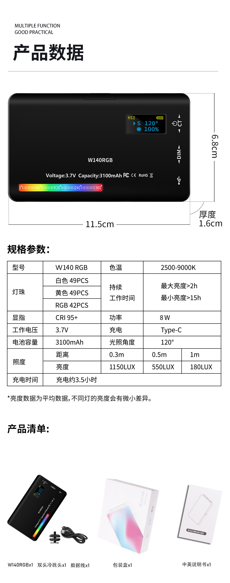 【灯珠】:白色49pcs 黄色49pcs RGB42pcs