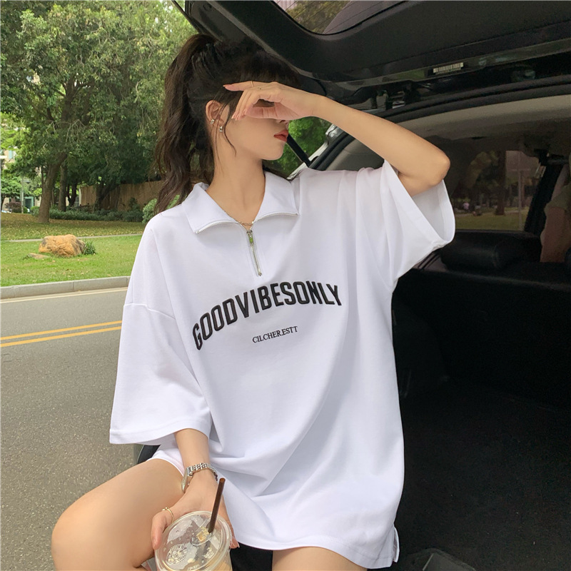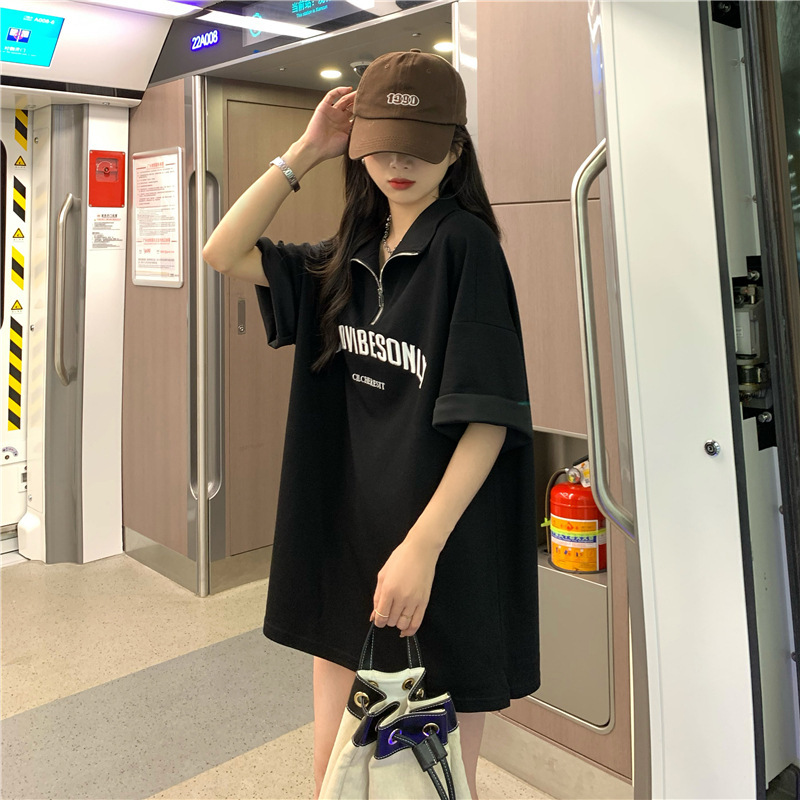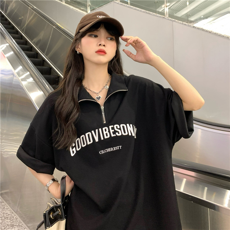 반팔 티셔츠 여자 2025 년 새 여름 반 지퍼 폴로 목 중간 길이 느슨한 플러스 사이즈 여자 반소매 탑스토어 가기