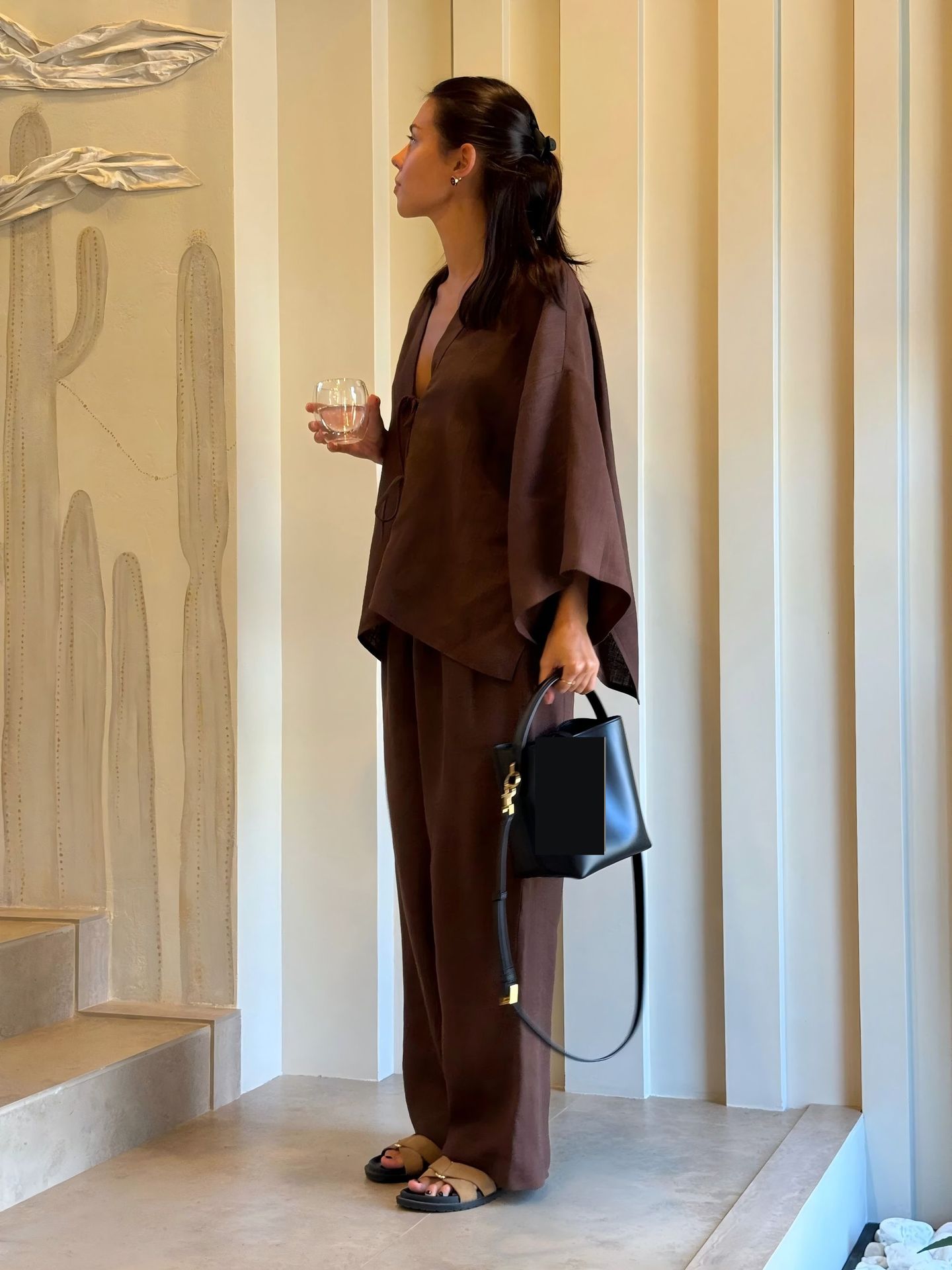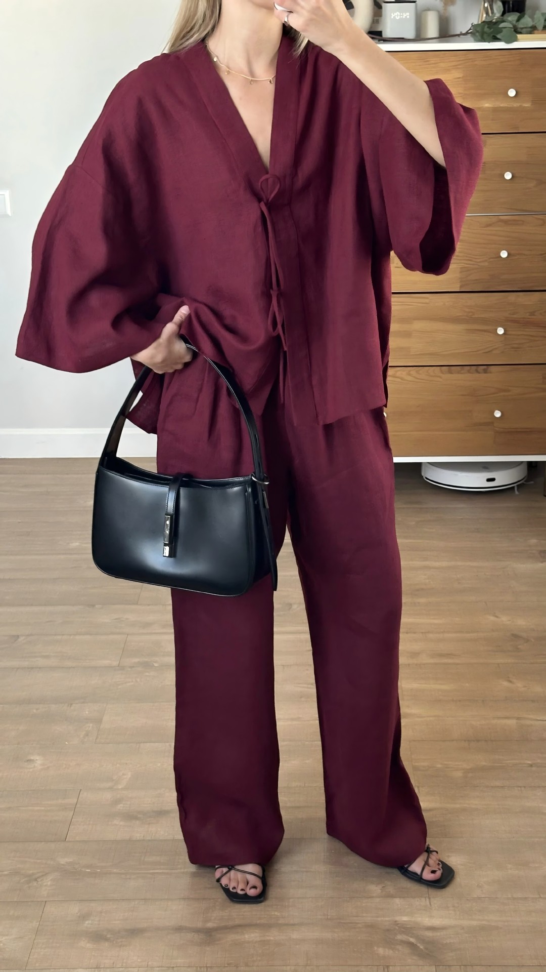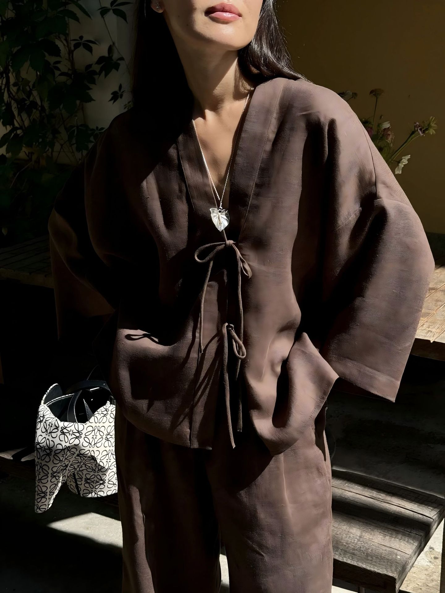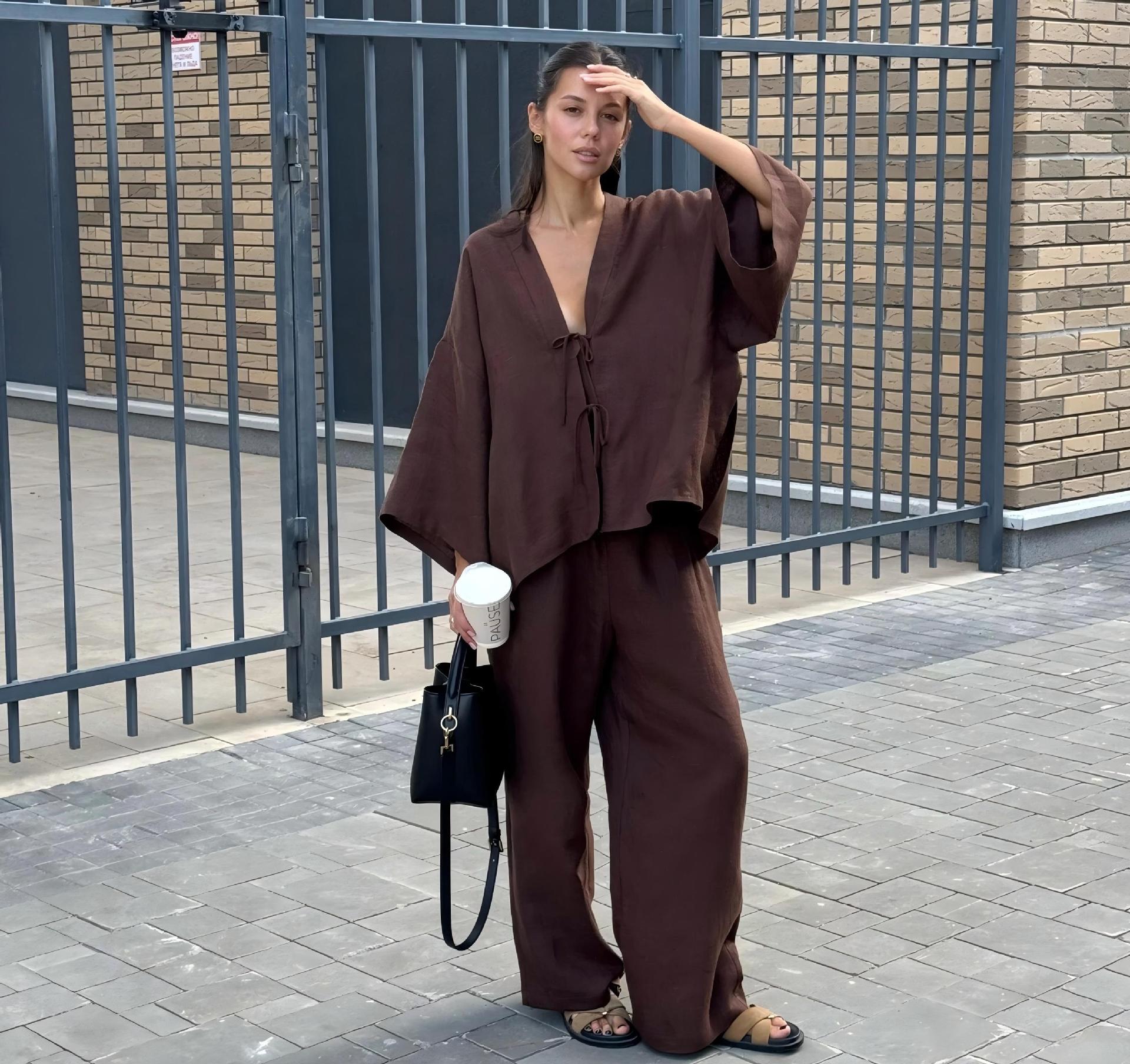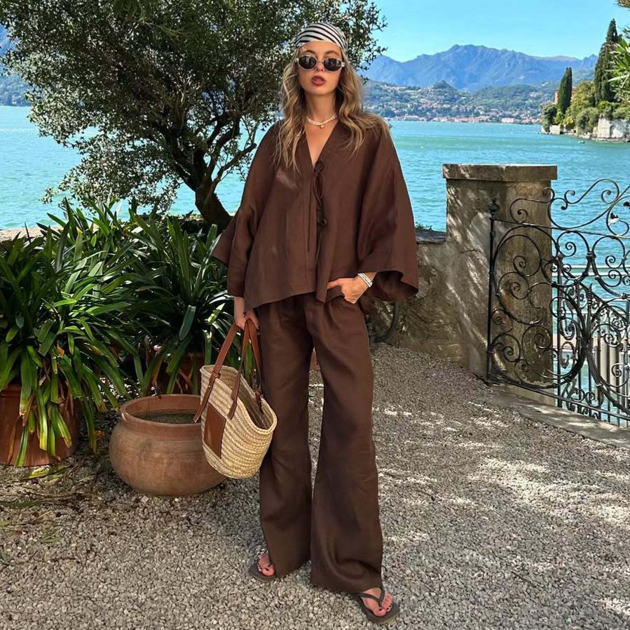 2025 년 봄과 여름 새로운 캐주얼 코튼 세트 레이스 업 재킷 넓은 다리 바지 유럽과 미국 국경 여성 도매스토어 가기