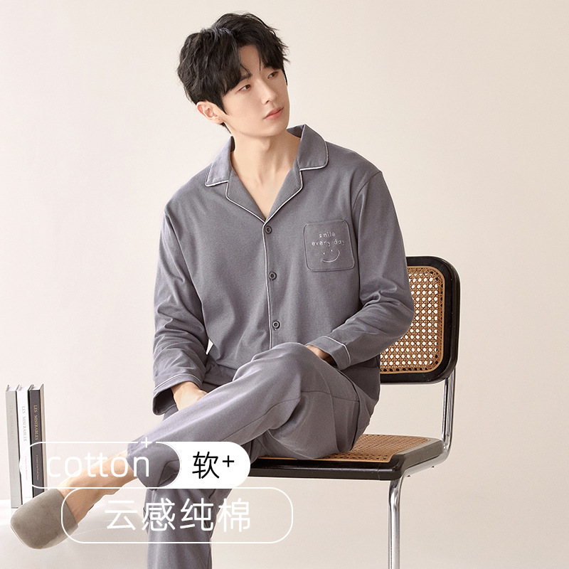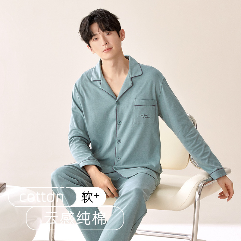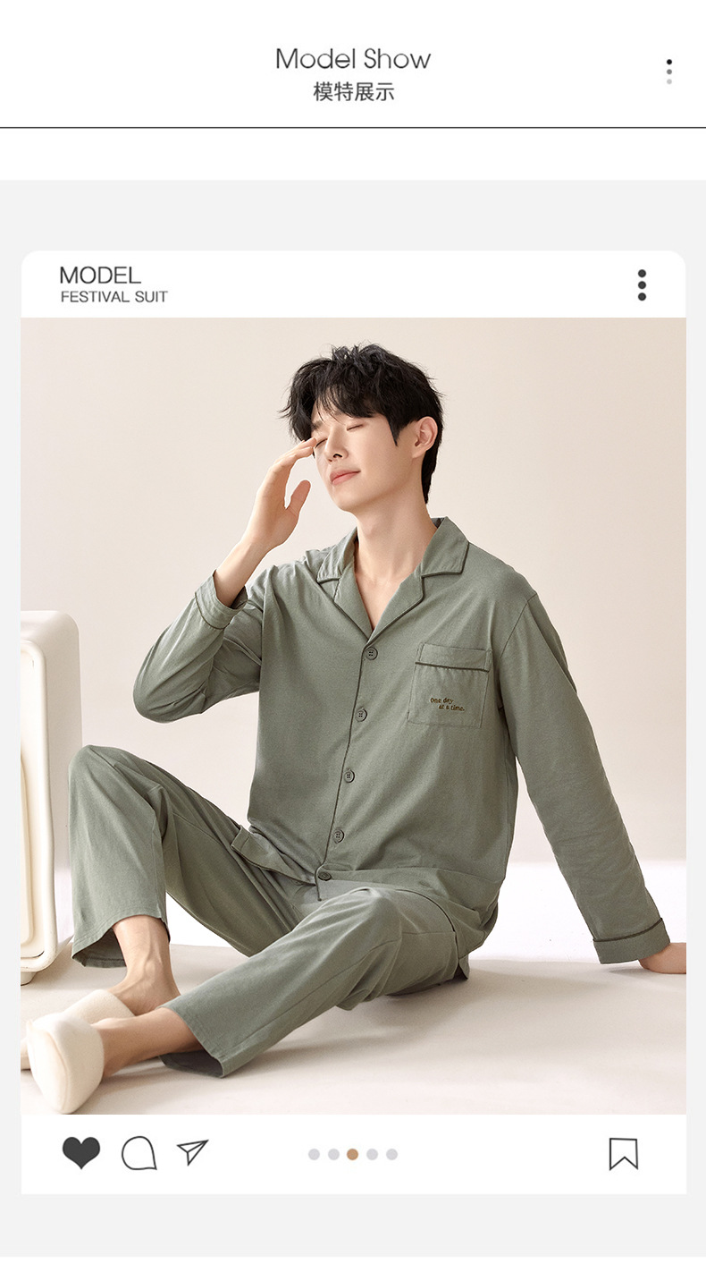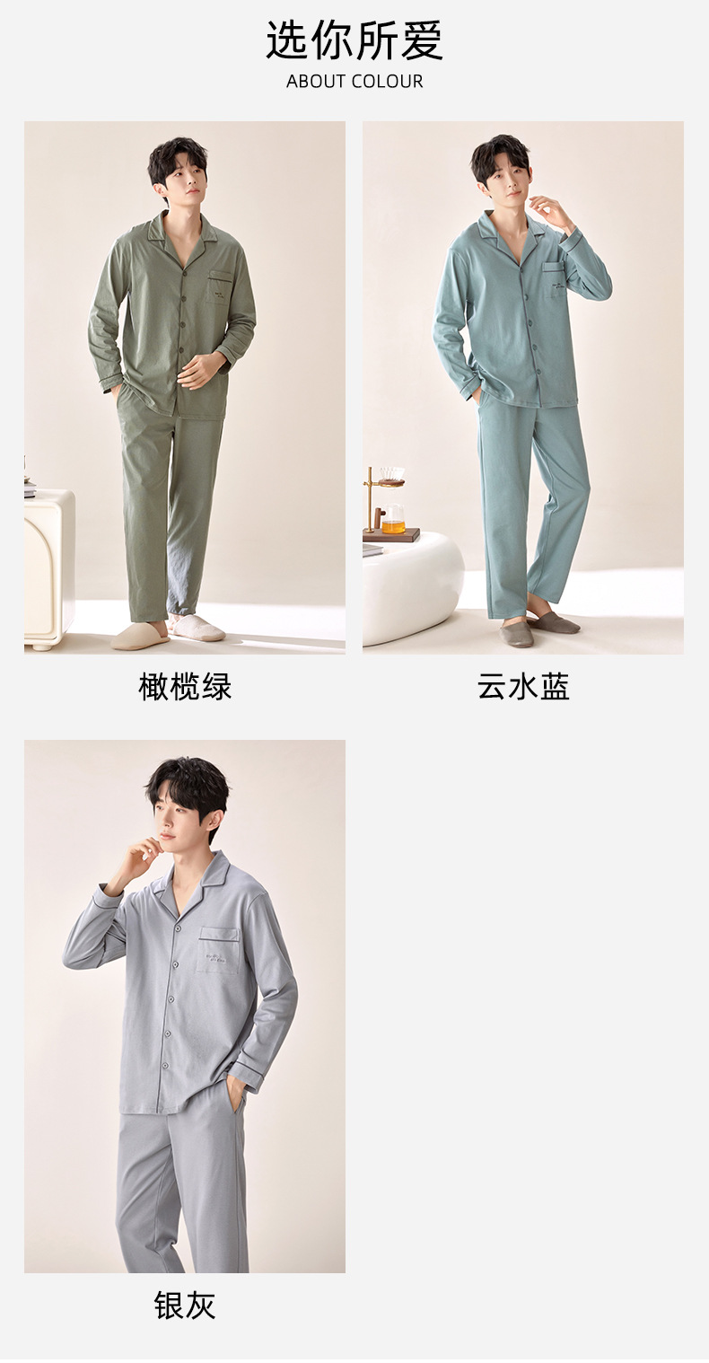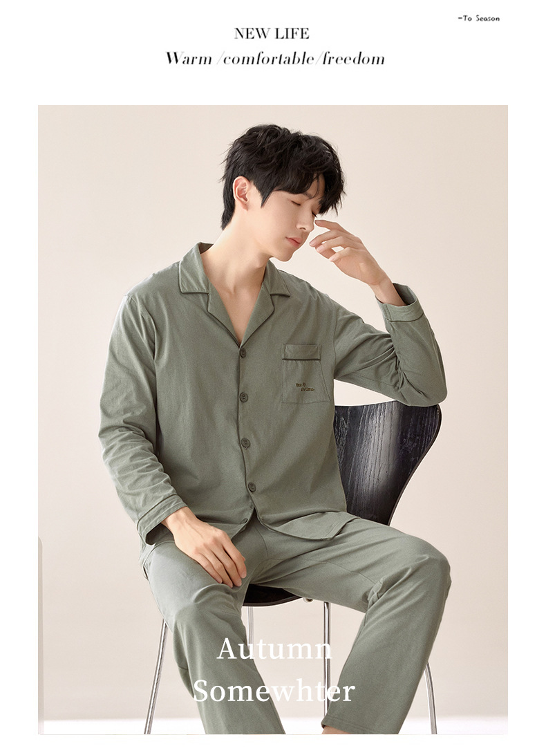 잠옷 남자의 봄과 가을 순색 면 긴 소매 옷깃 카디건 편안한 간단한 캐주얼 의류 세트스토어 가기