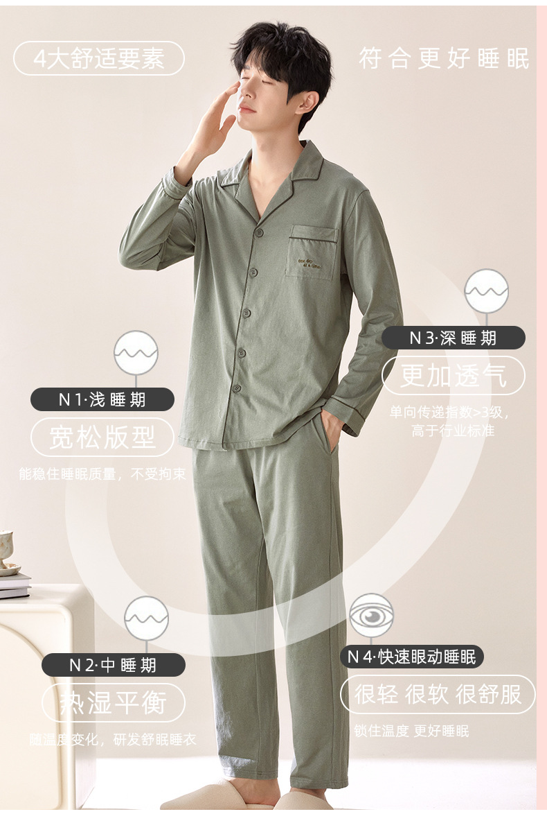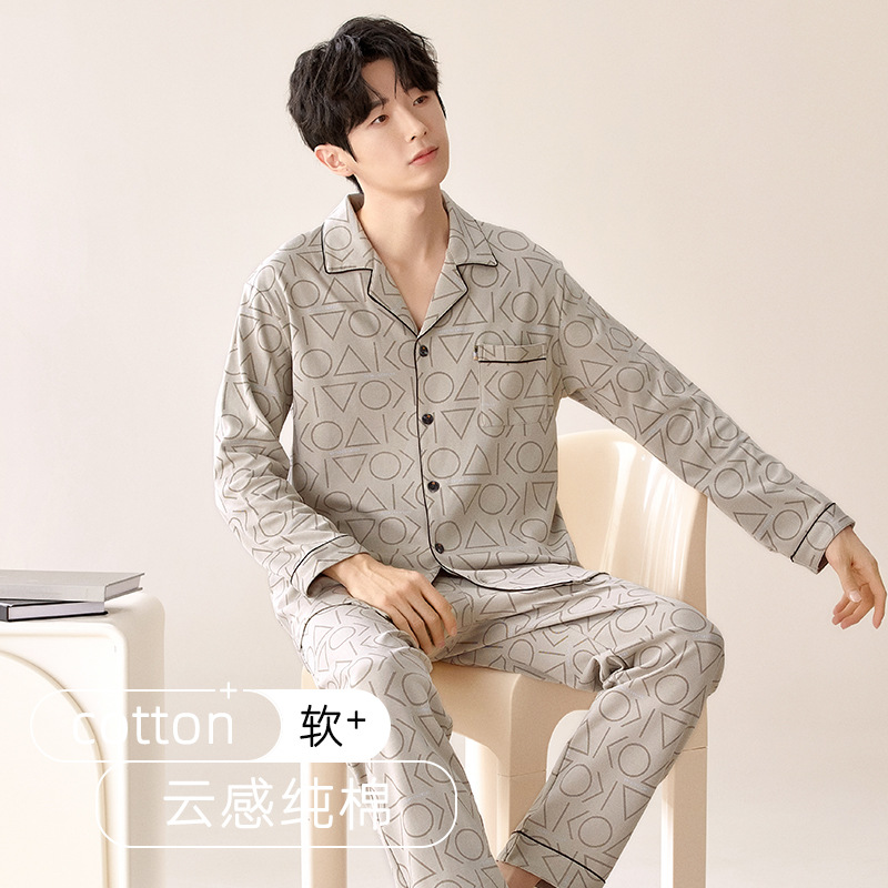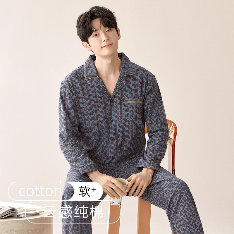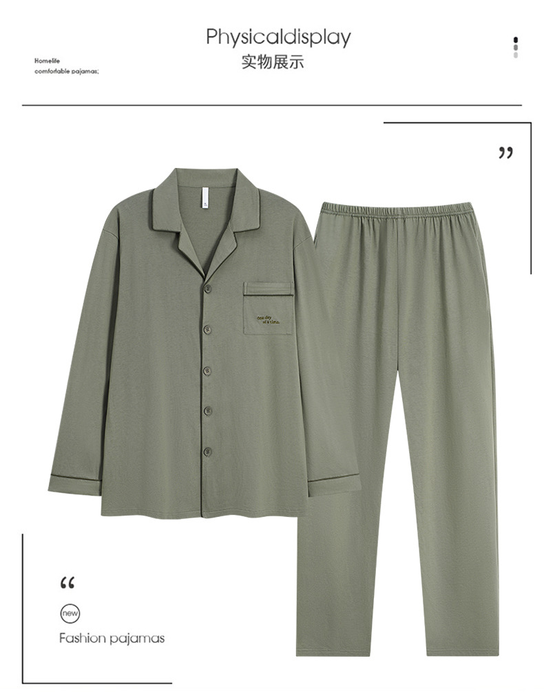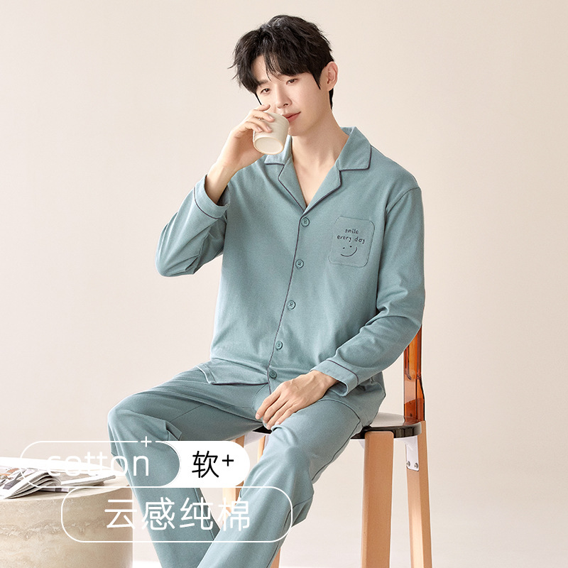 잠옷 남자의 봄과 가을 순색 면 긴 소매 옷깃 카디건 편안한 간단한 캐주얼 의류 세트스토어 가기
