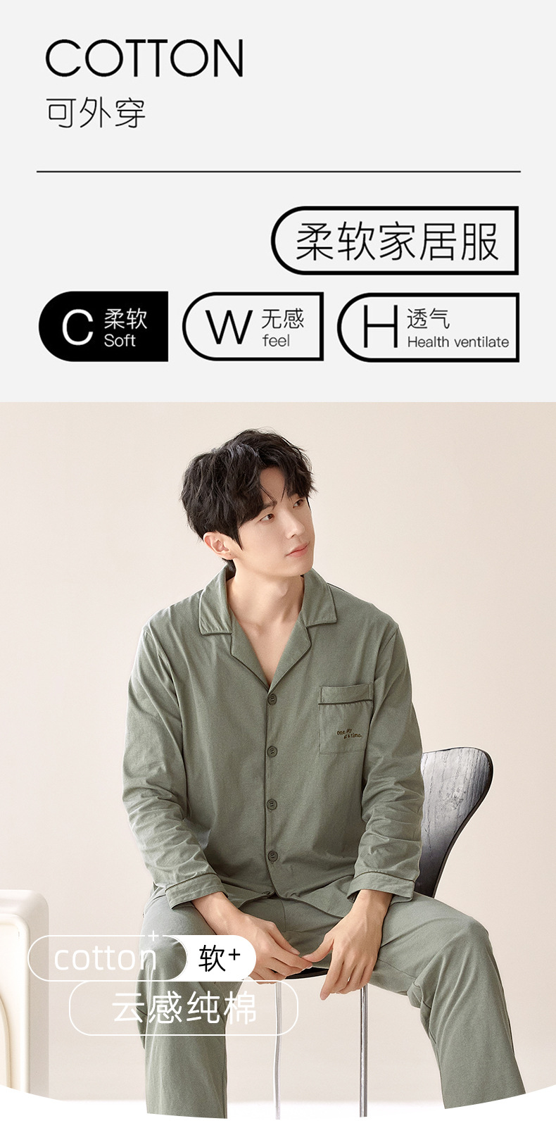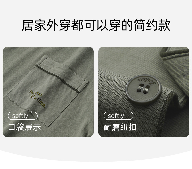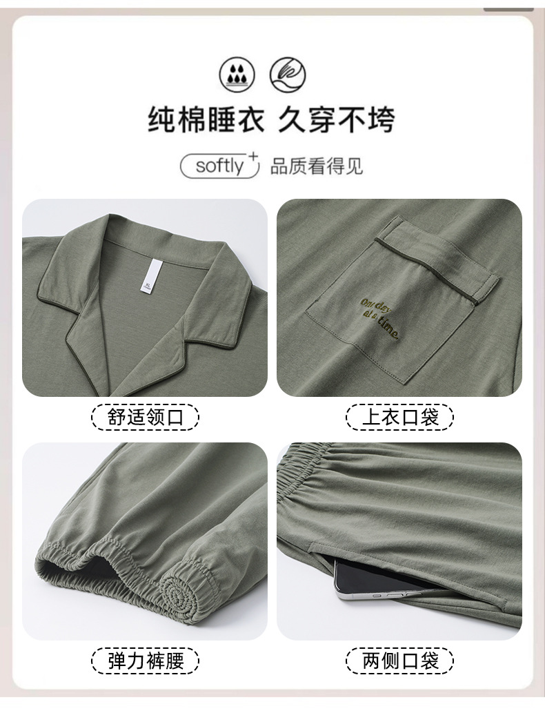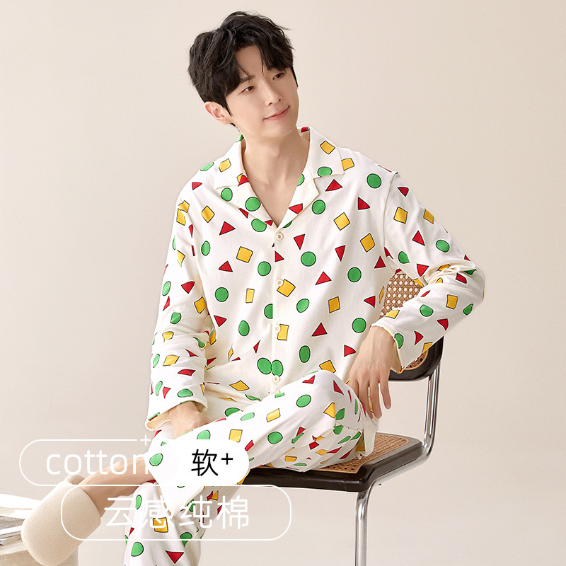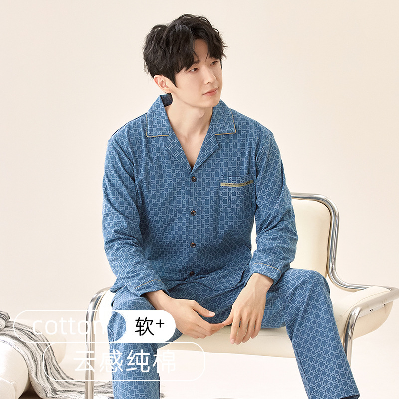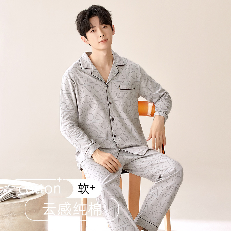 잠옷 남자의 봄과 가을 순색 면 긴 소매 옷깃 카디건 편안한 간단한 캐주얼 의류 세트스토어 가기