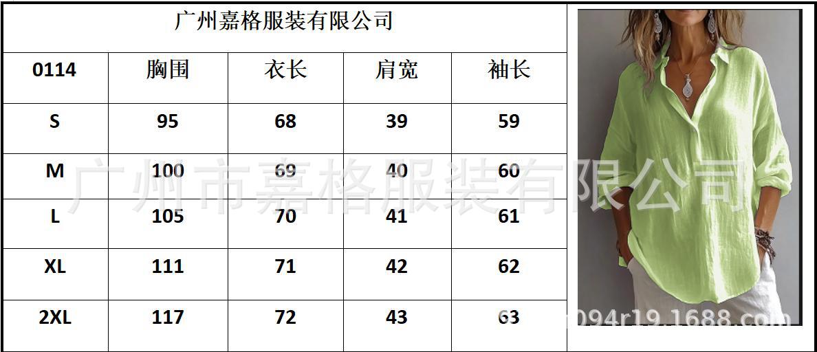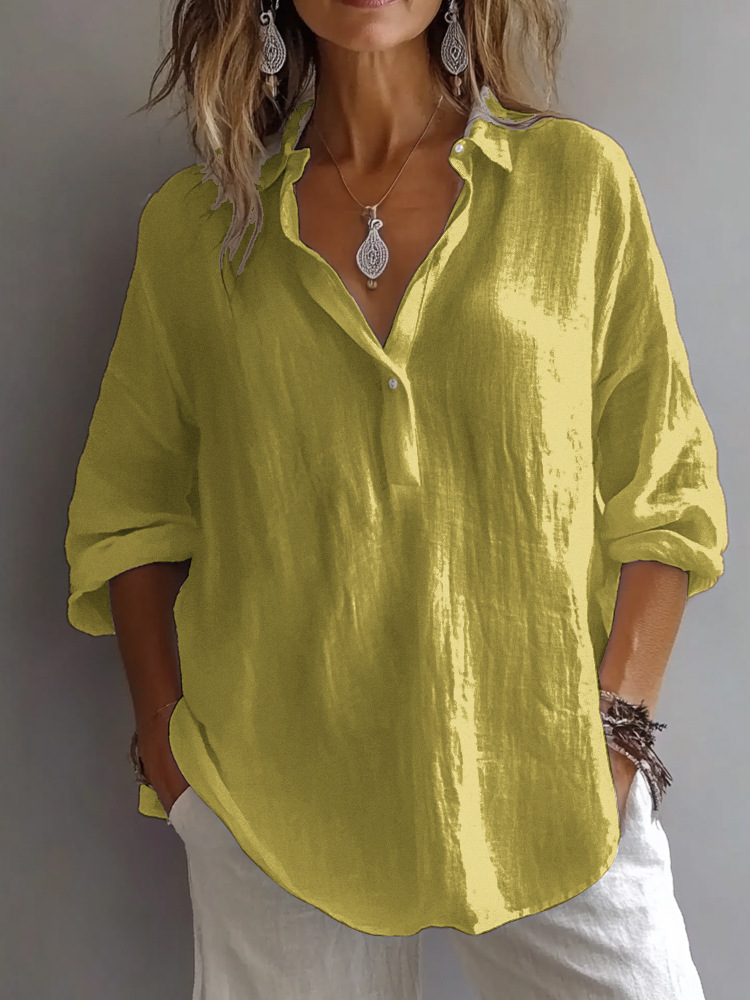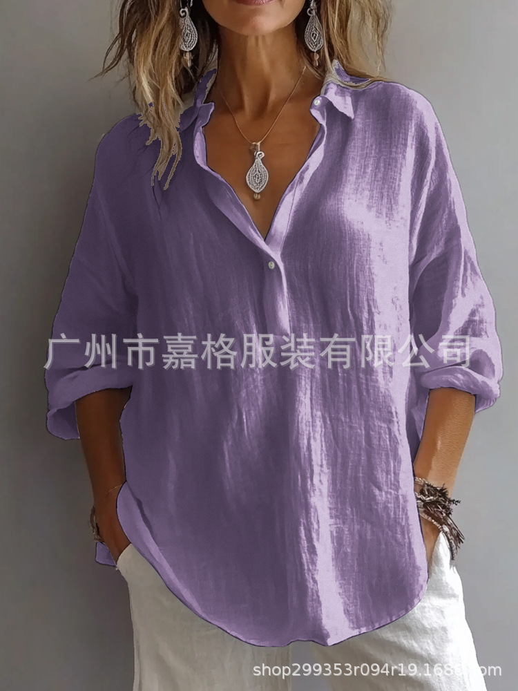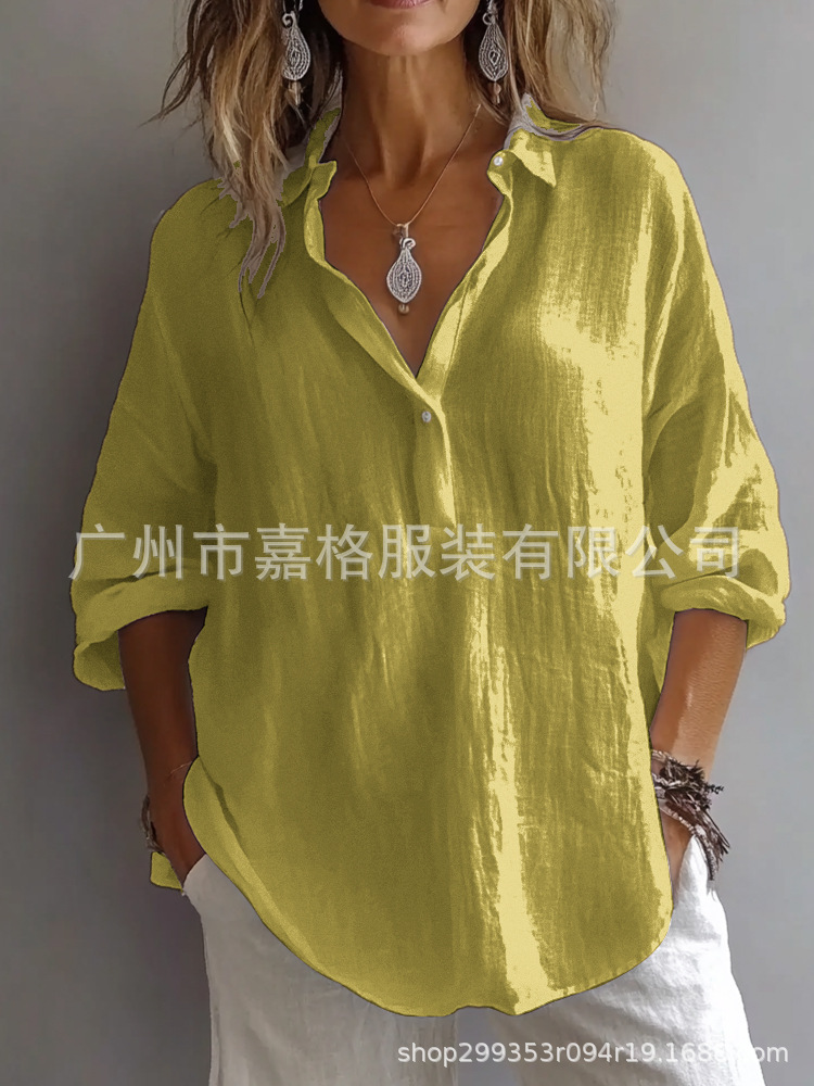 봄과 여름 2025 유럽과 미국의 단색 캐주얼 느슨한 긴 소매 리넨 V-넥 셔츠 아마존 셔츠