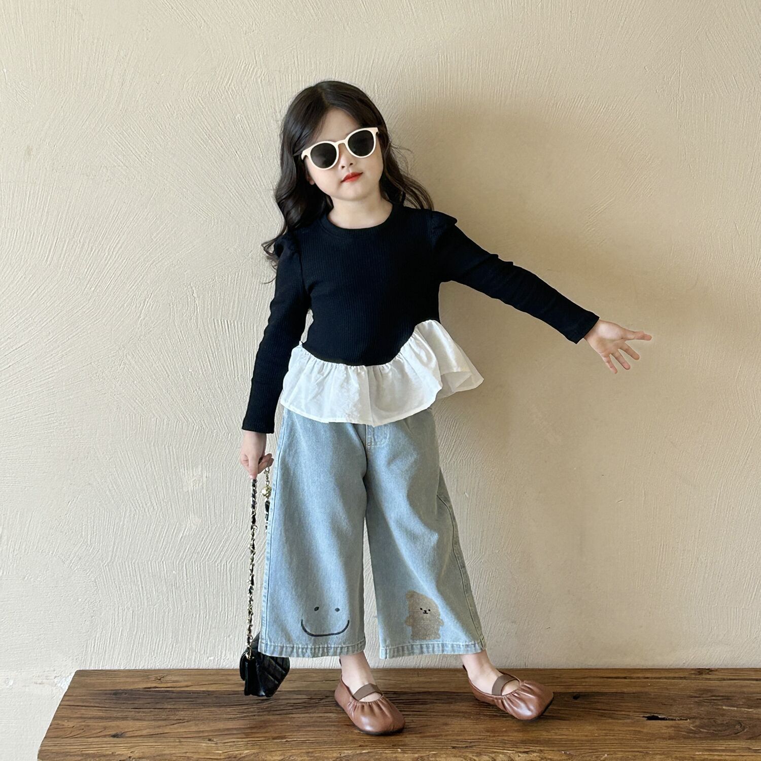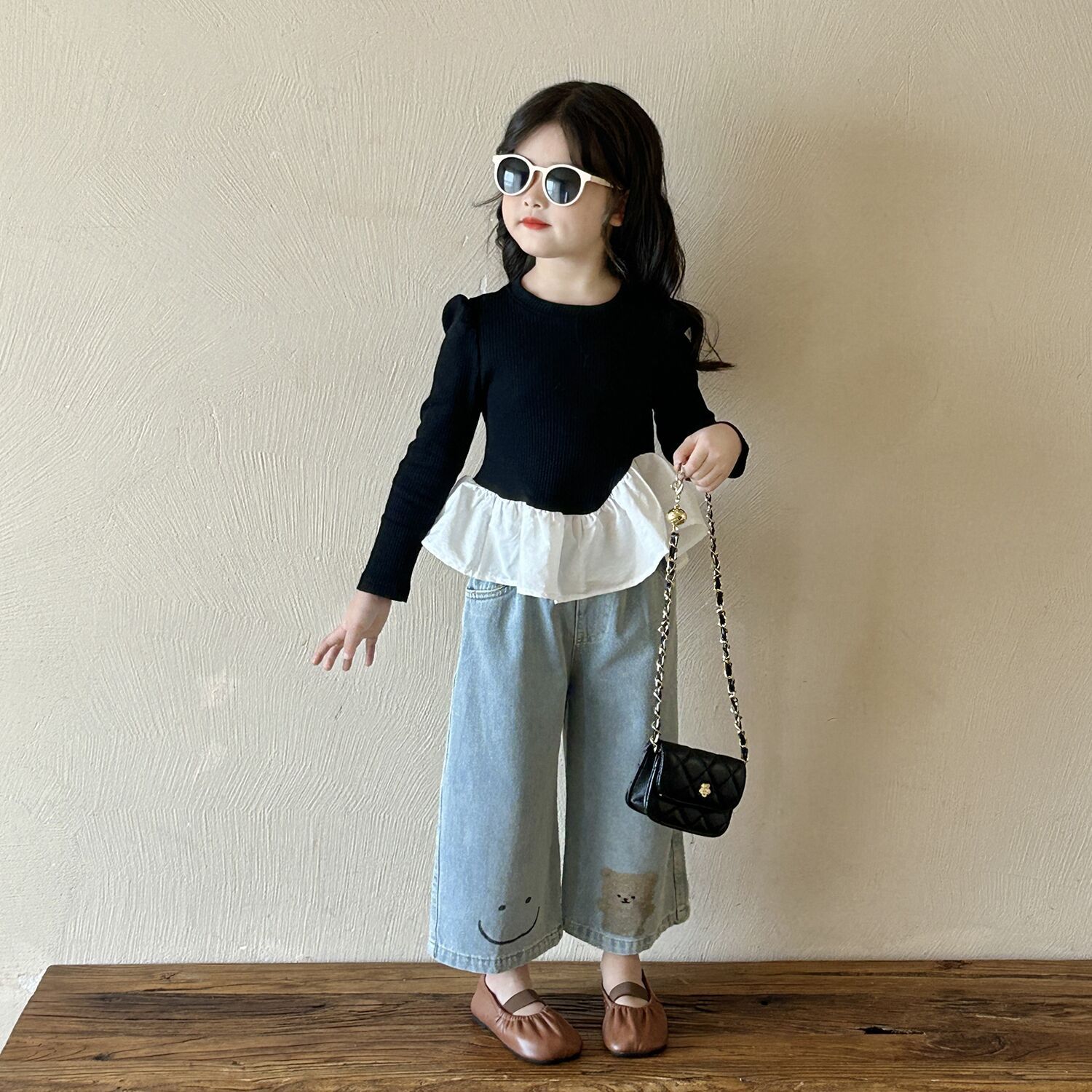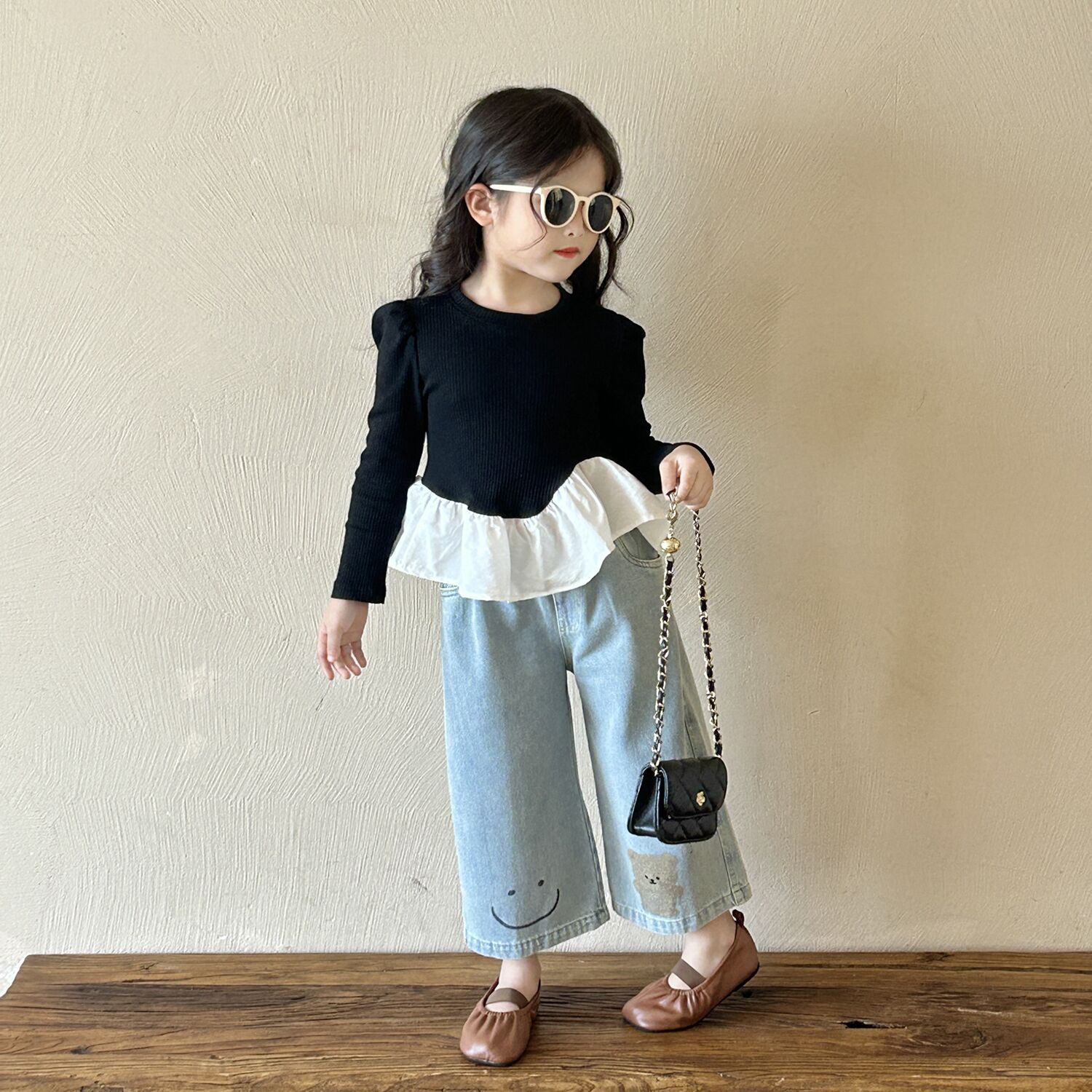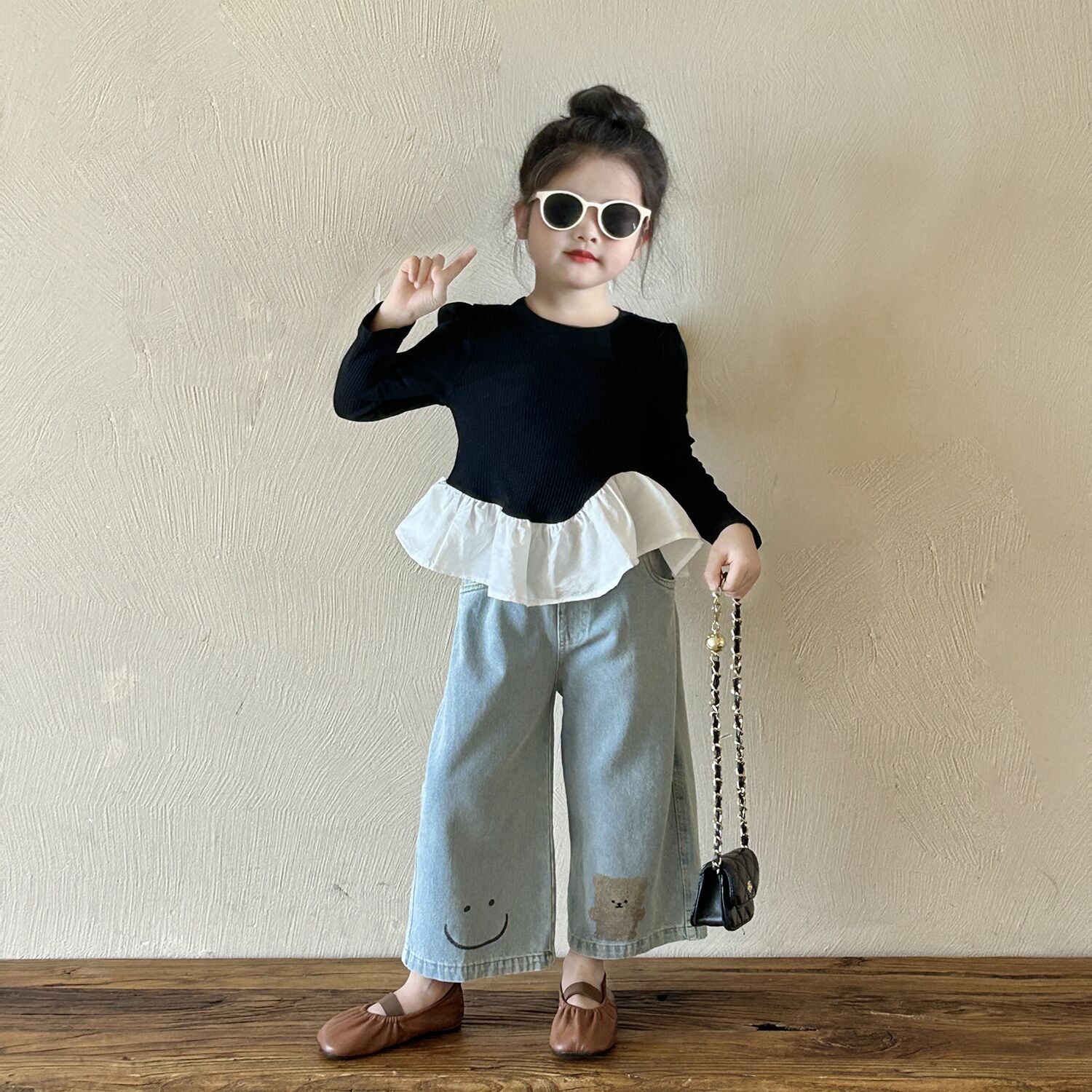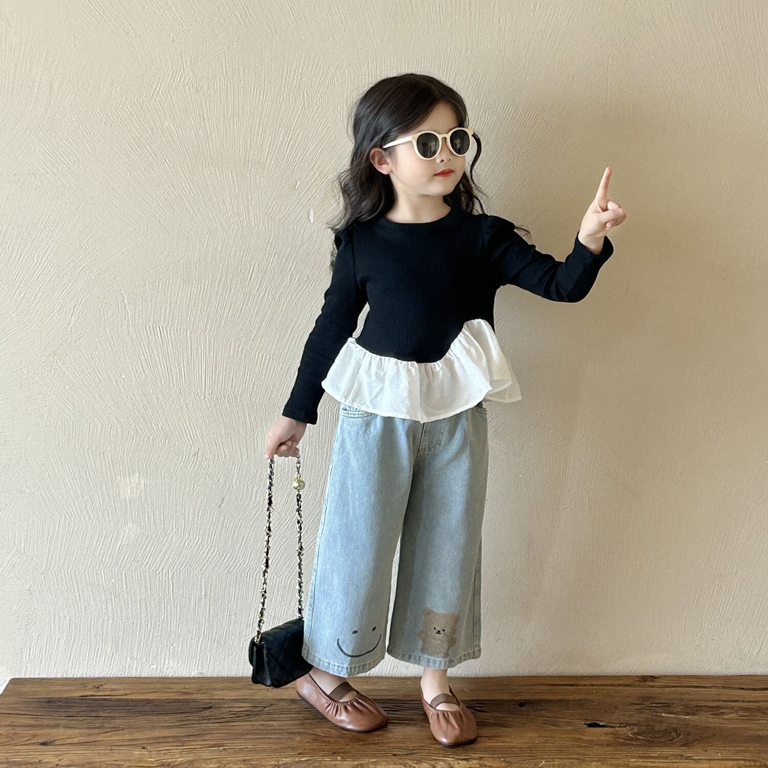 소녀 러플 롱 슬리브 티셔츠 2025 봄 새 아기 소녀 올 매치 니트 티셔츠 만화 청바지 세트스토어 가기