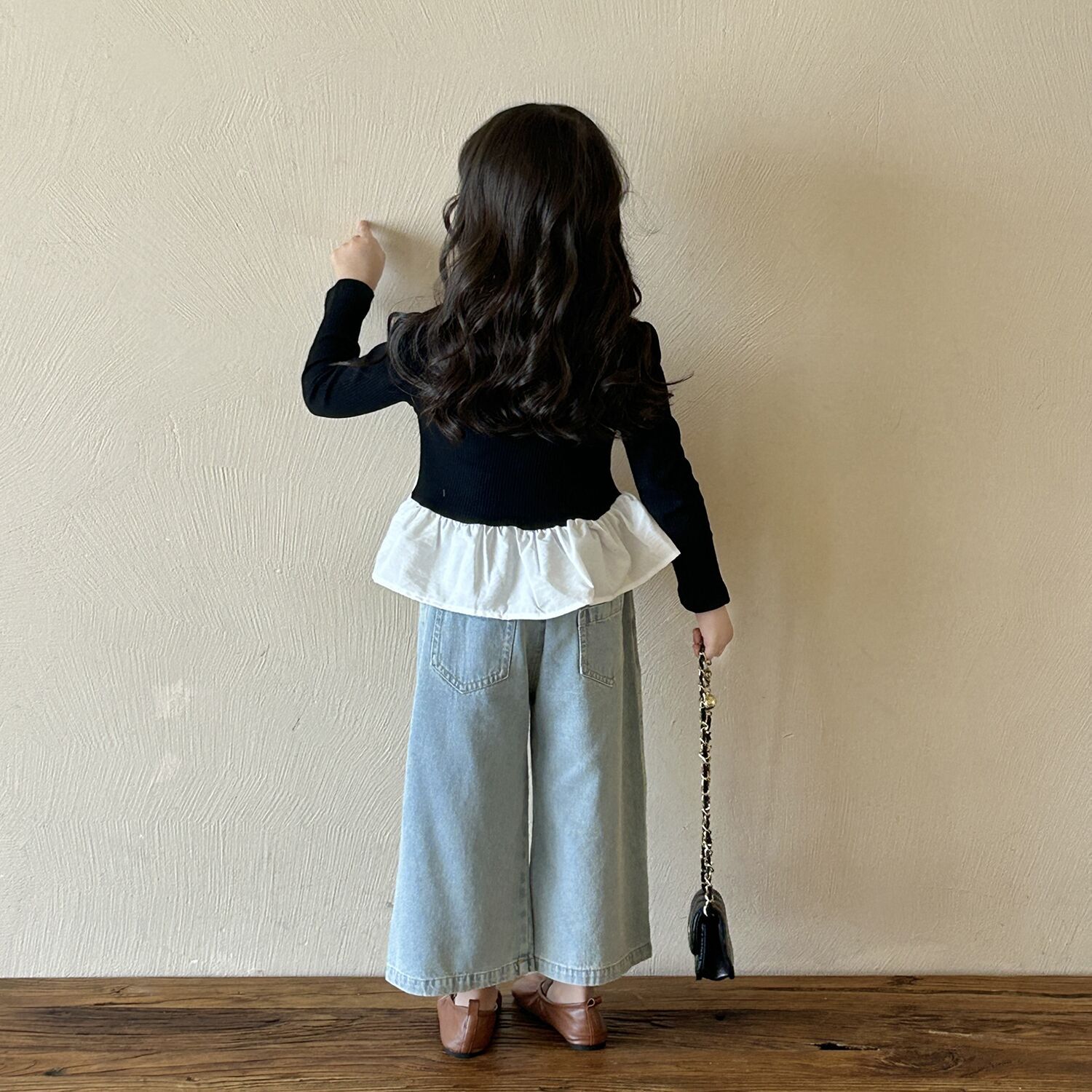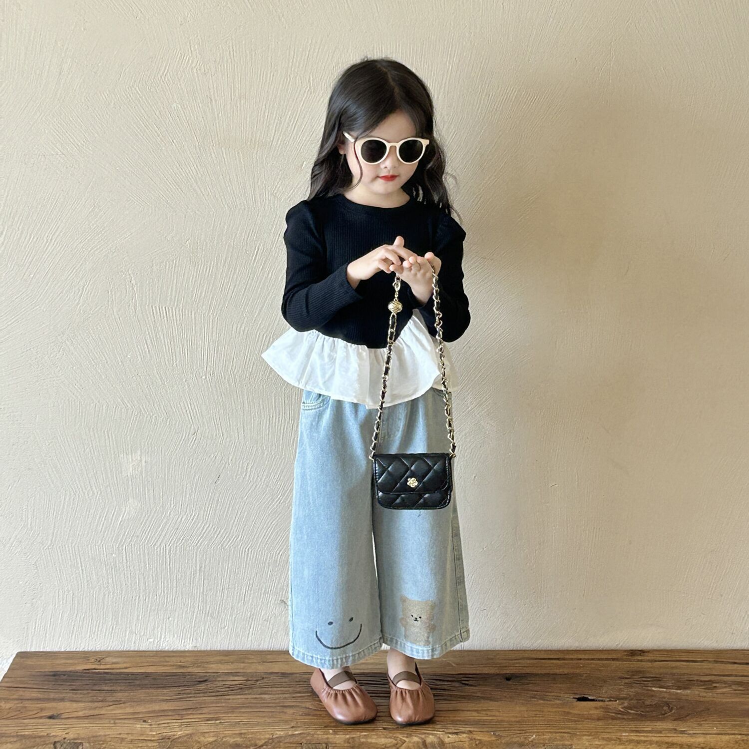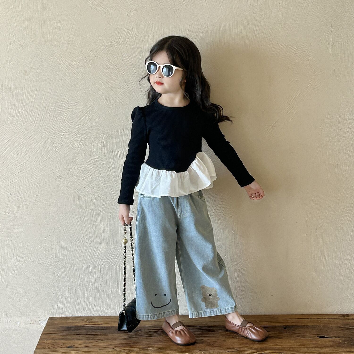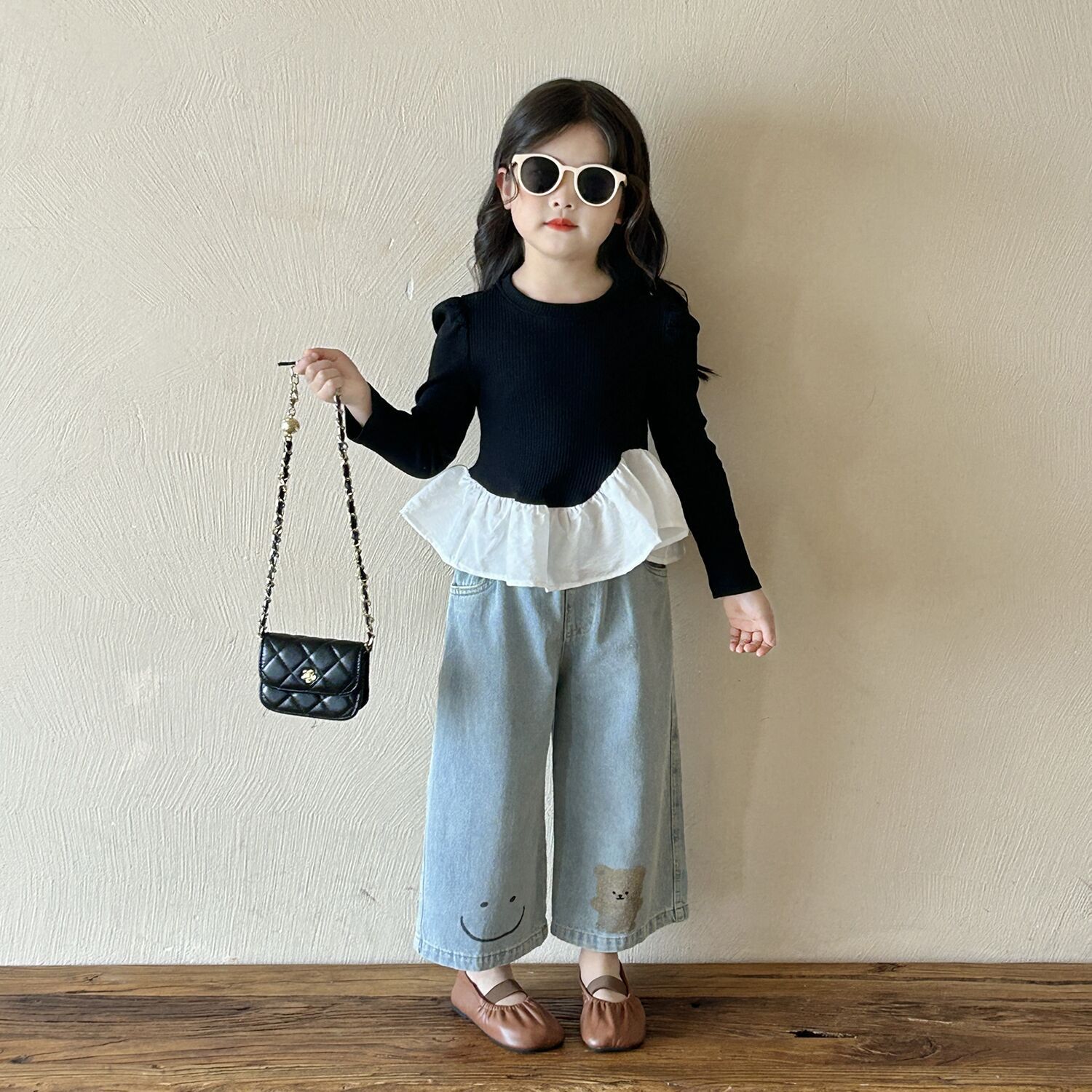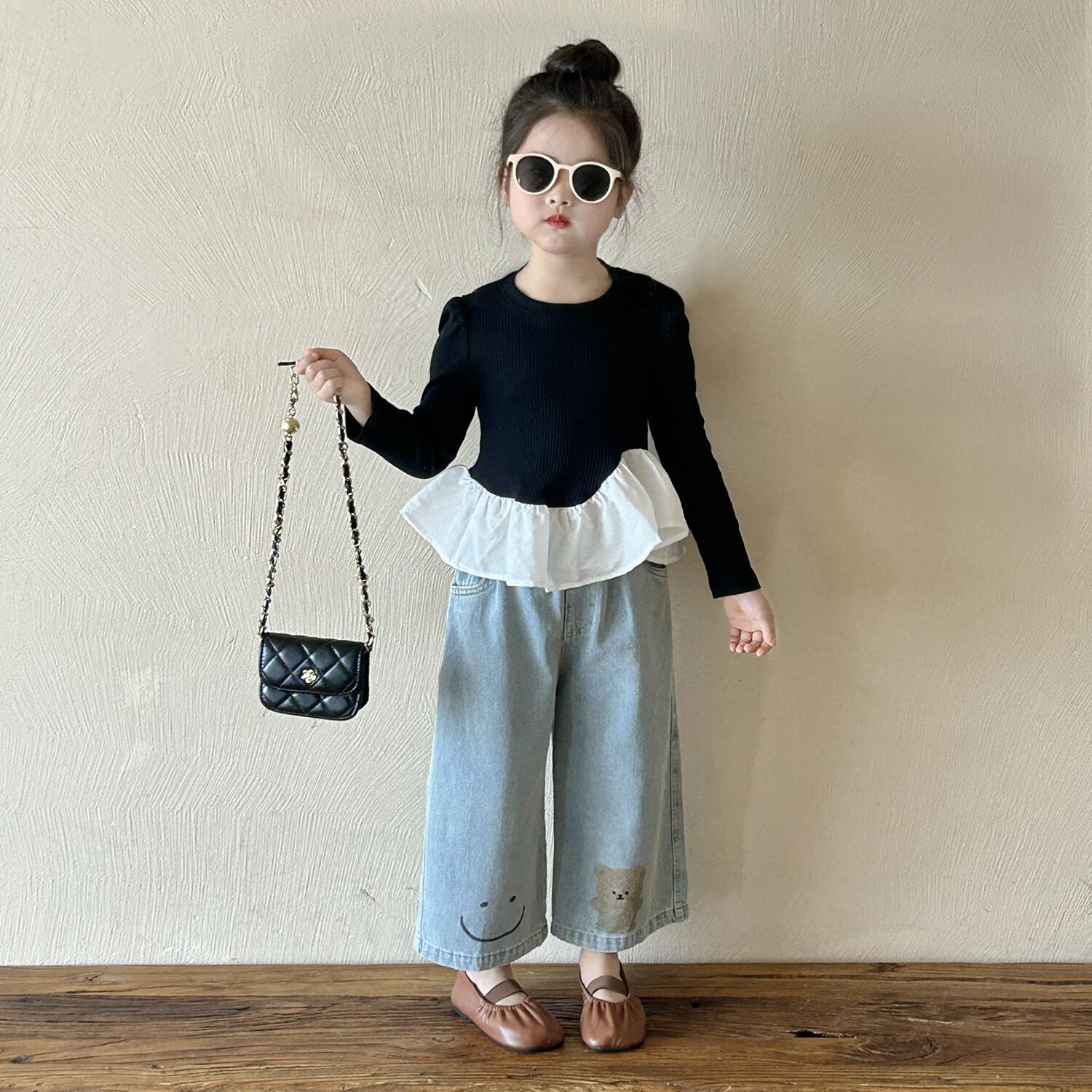 소녀 러플 롱 슬리브 티셔츠 2025 봄 새 아기 소녀 올 매치 니트 티셔츠 만화 청바지 세트스토어 가기