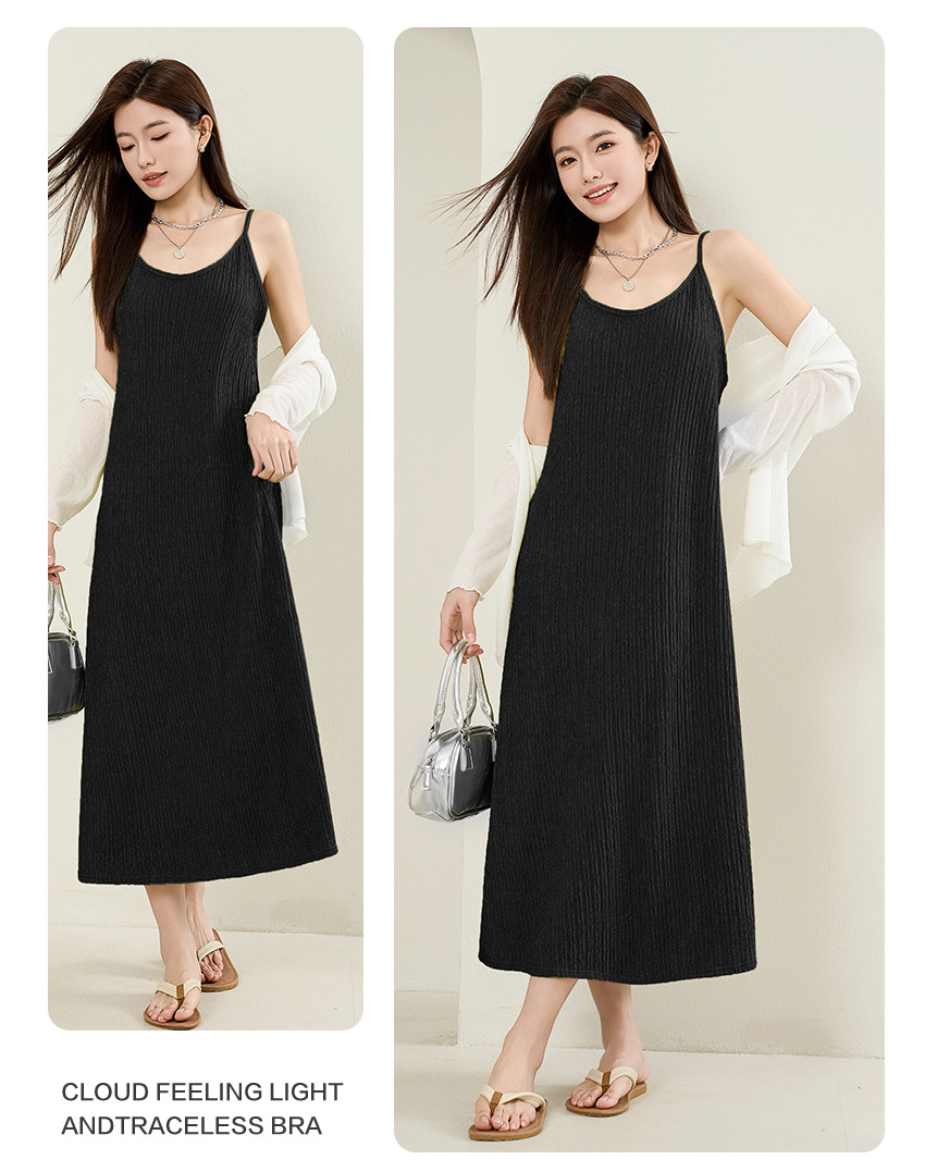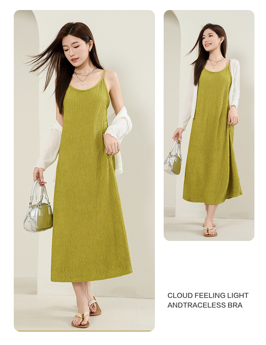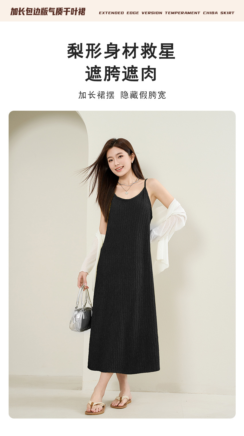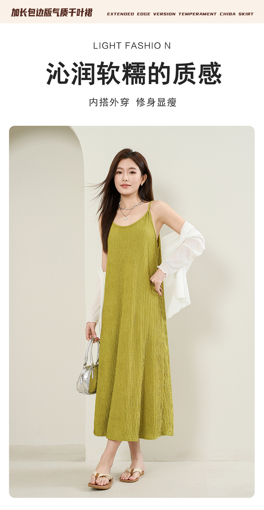 [작은 빨간 승마 책 추천] 2025 봄, 여름, 가을 스트랩 원피스 슬림 주름 짜임새 처짐 스트랩 긴 원피스