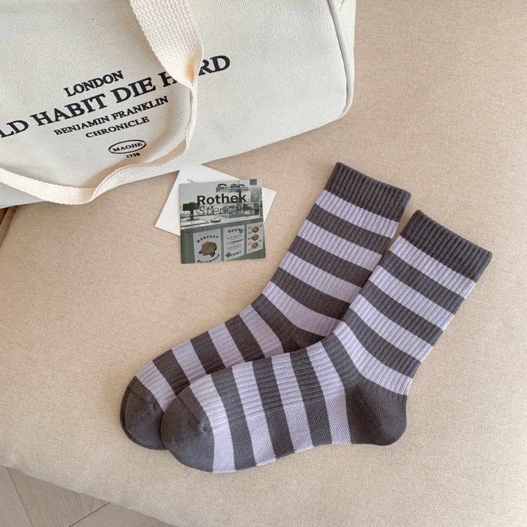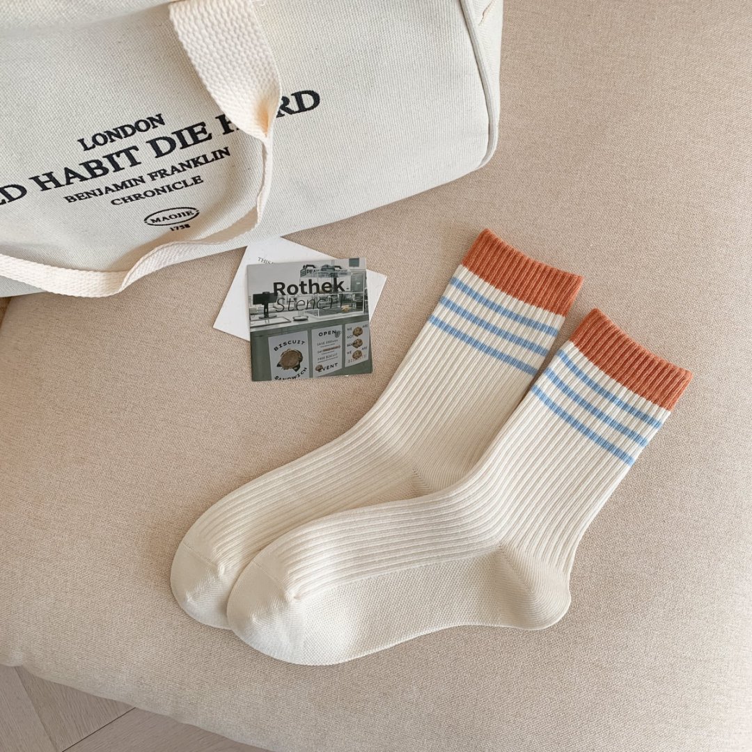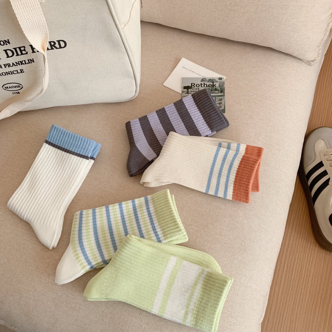커스텀 코튼 양말 여성용 모조 더블 바늘 한국 줄무늬 미드 튜브 양말 땀 흡수 통기성 소프트 편안한 캐주얼 양말