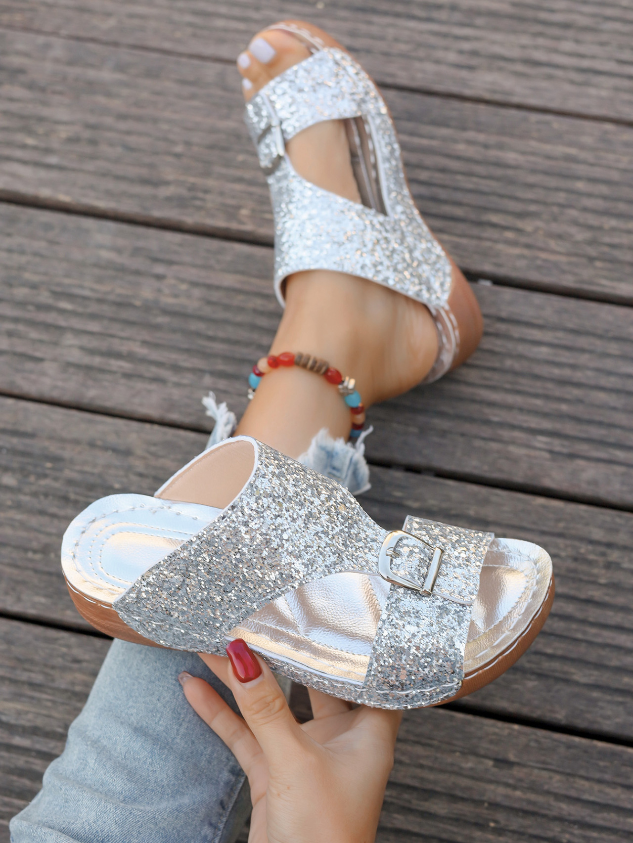 2025 년 여름 유럽과 미국의 국경 간 대외 무역 새로운 웨지 힐 벨트 버클 솔리드 컬러 라운드 헤드 여성 플러스 사이즈 샌들