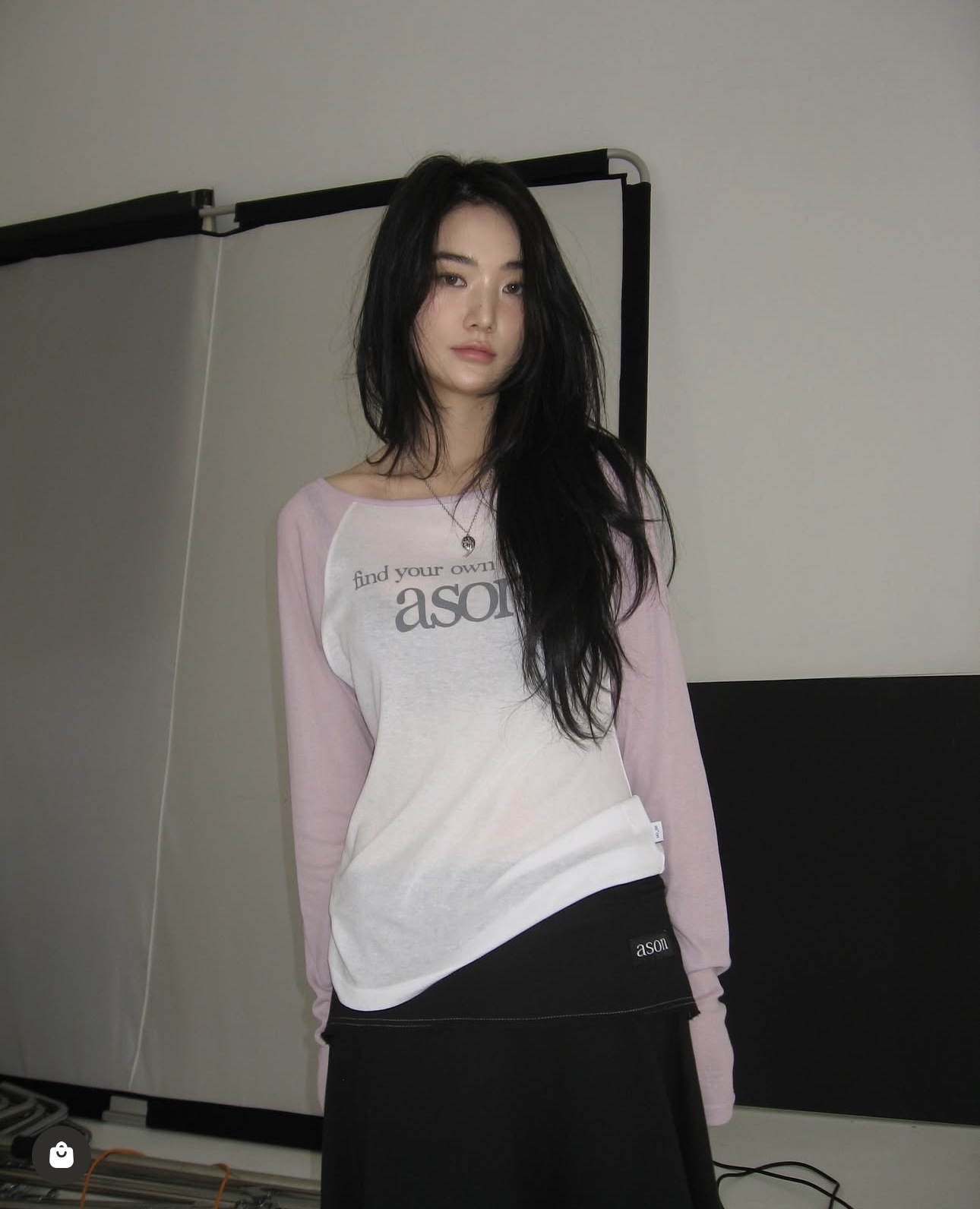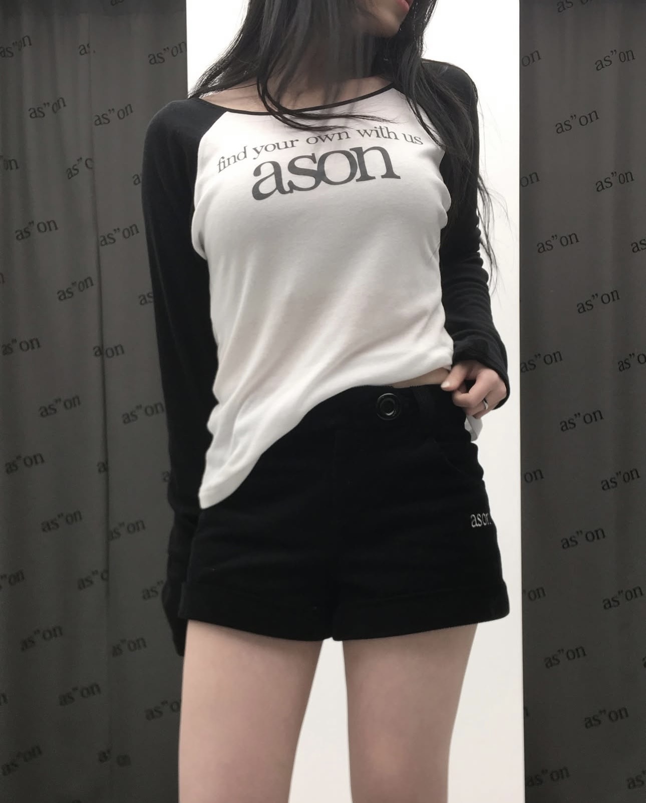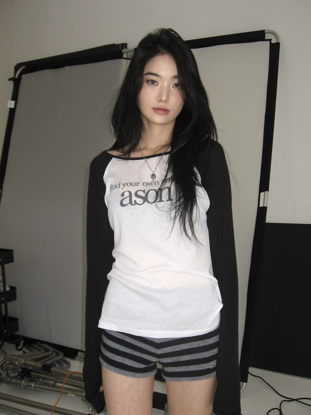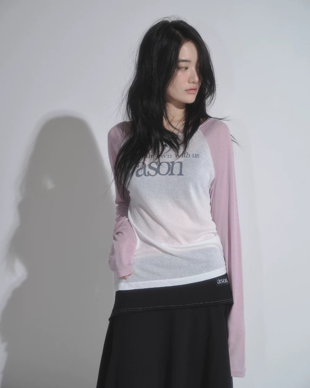 한국판/as*n 레터 프린트 텐셀 원단 배색 래글런 슬리브 라운드넥 베이직 긴팔 티셔츠 여성용