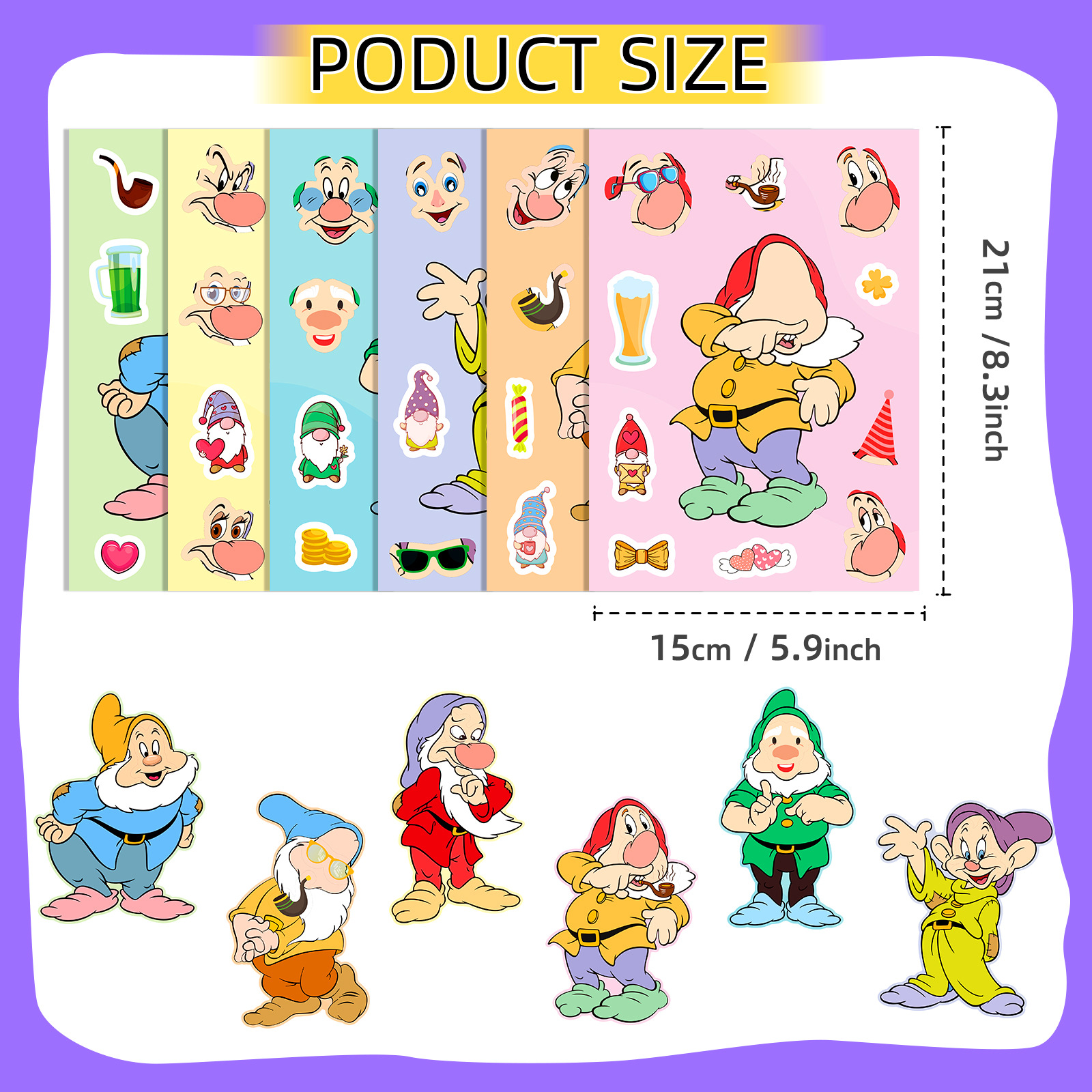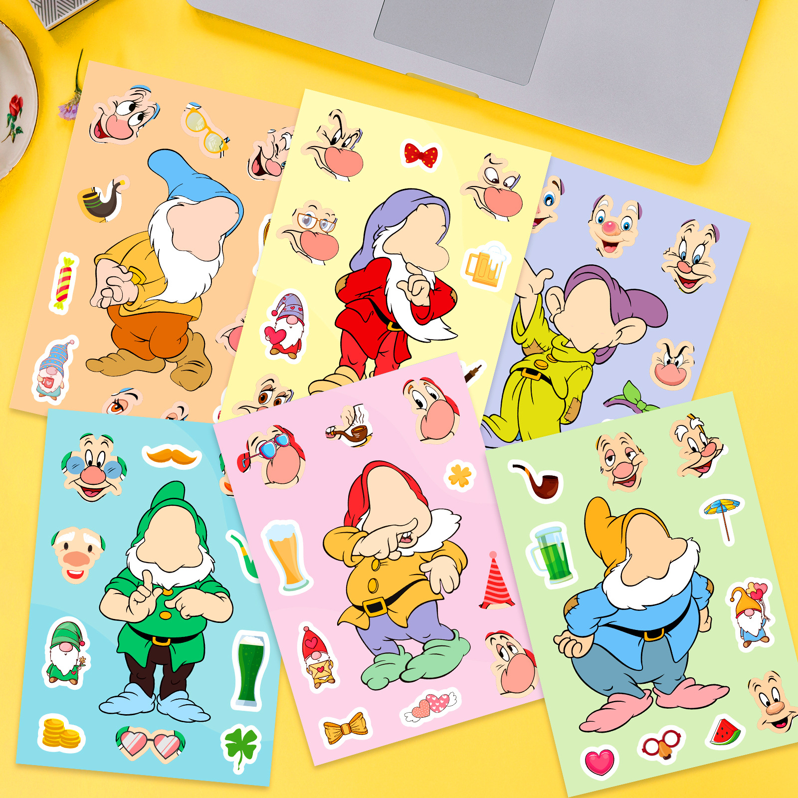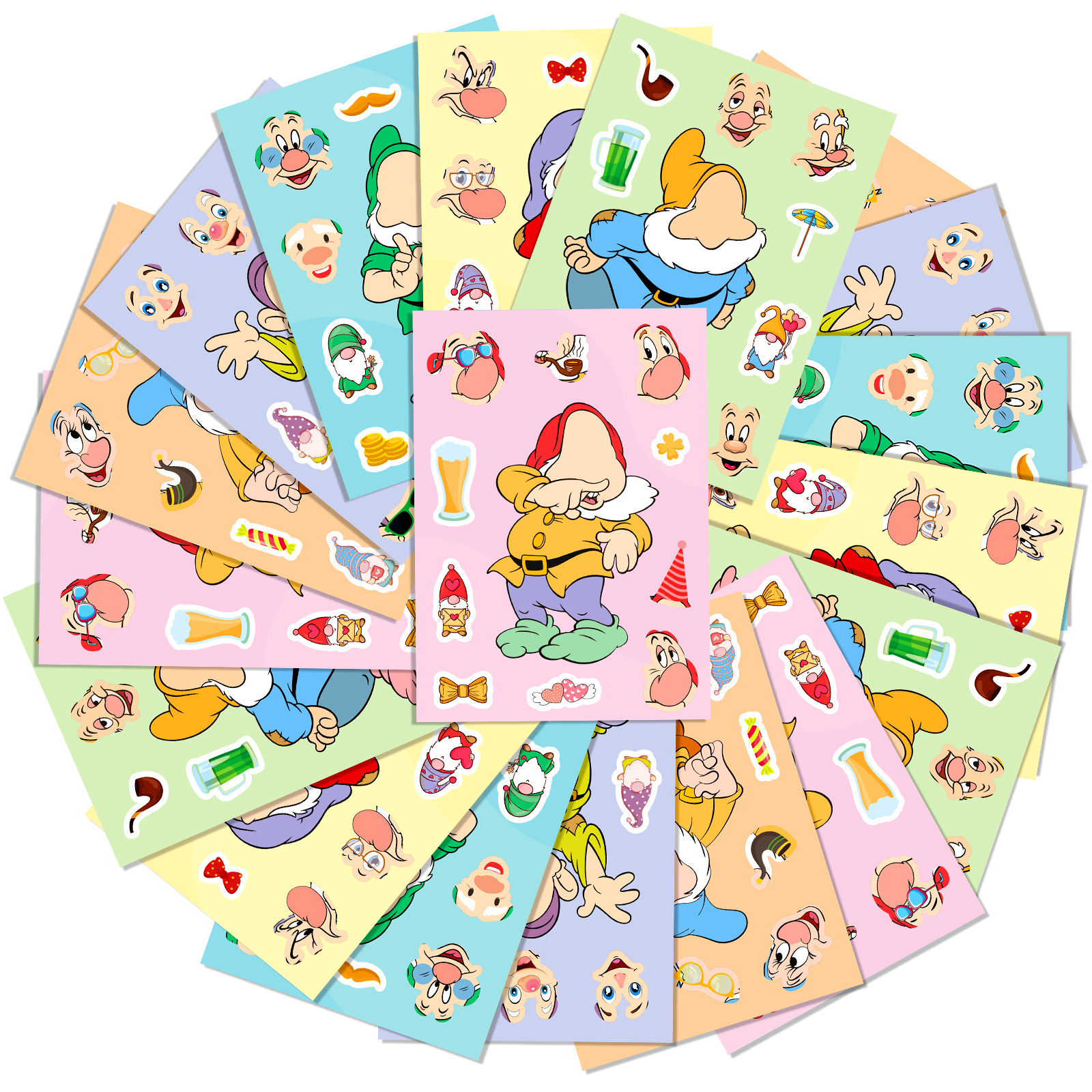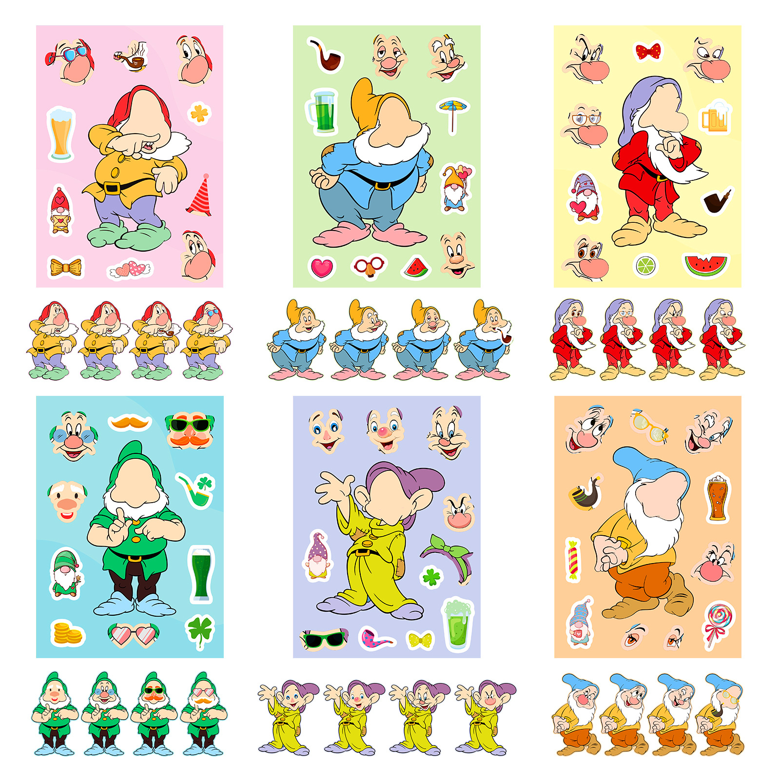 큰 판매 6 팩 난쟁이 얼굴 변화 퍼즐 스티커 diy 어린이 수공예 클래스 게임 스티커 새로운 국경스토어 가기