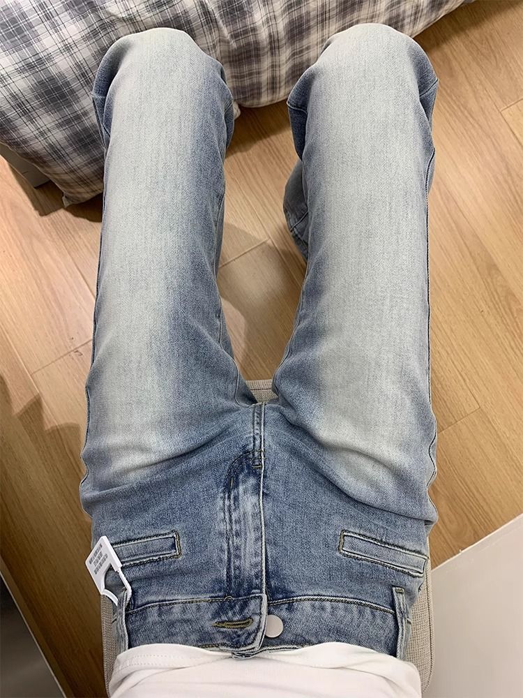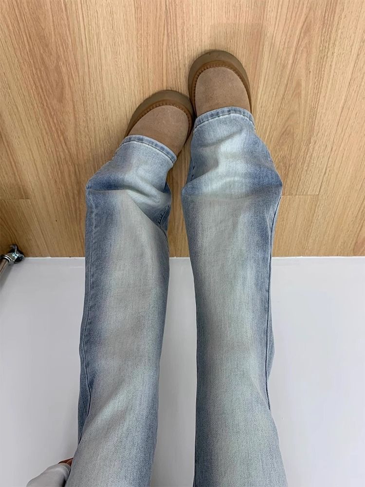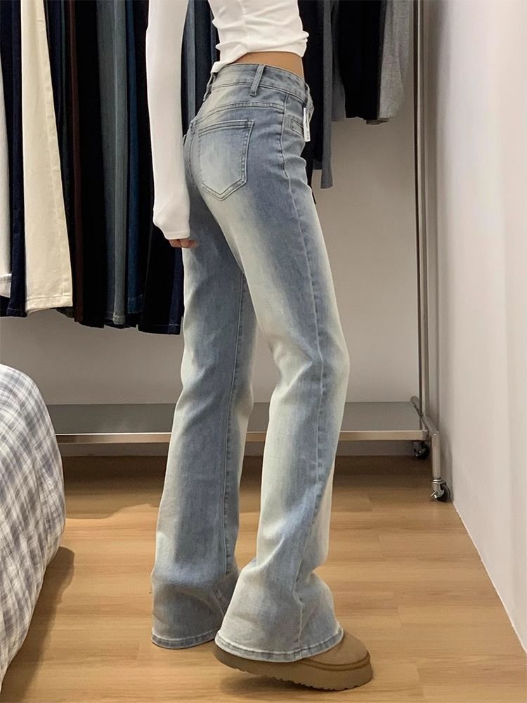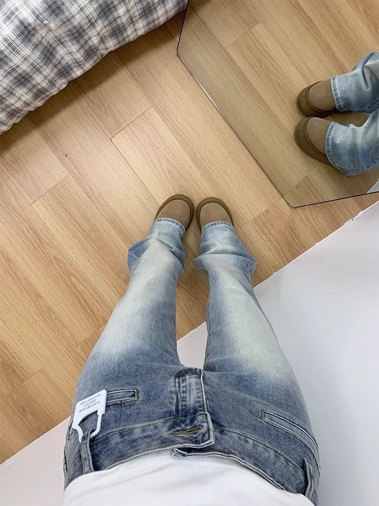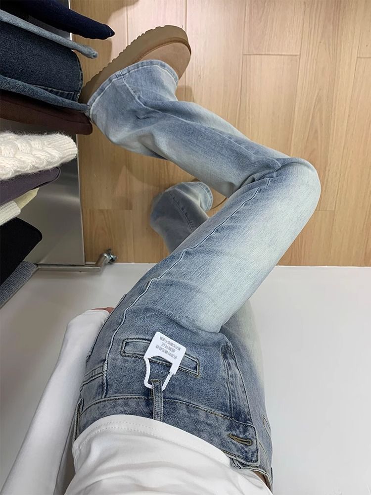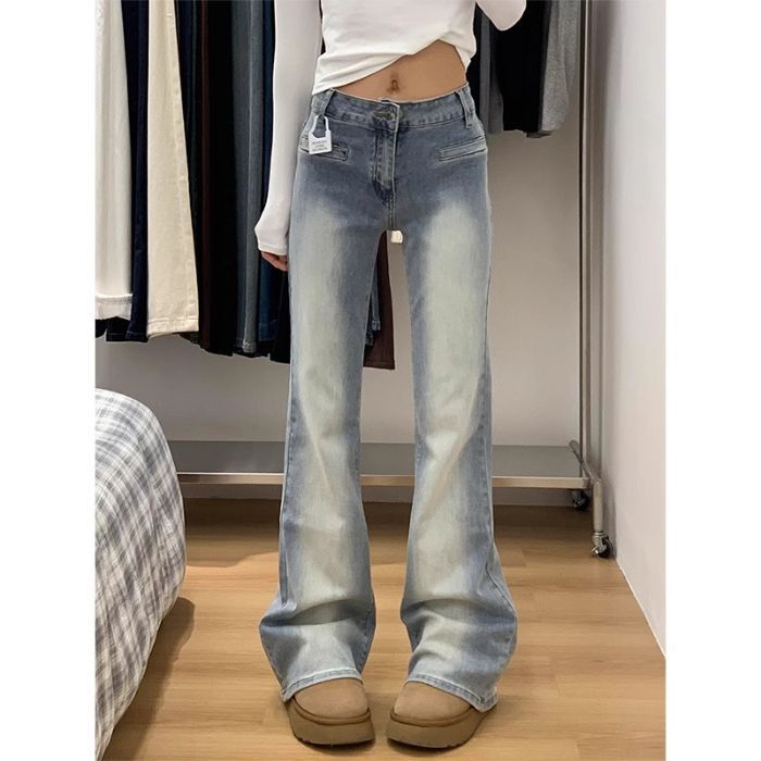 씻은 흰색 마이크로 플레어 청바지 봄 새로운 미국 스타일 레트로 낮은 허리 타이트 슬림 스트레이트 말굽 바지스토어 가기