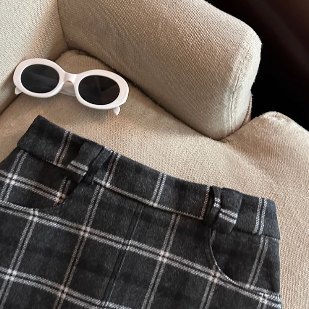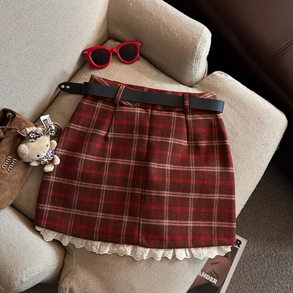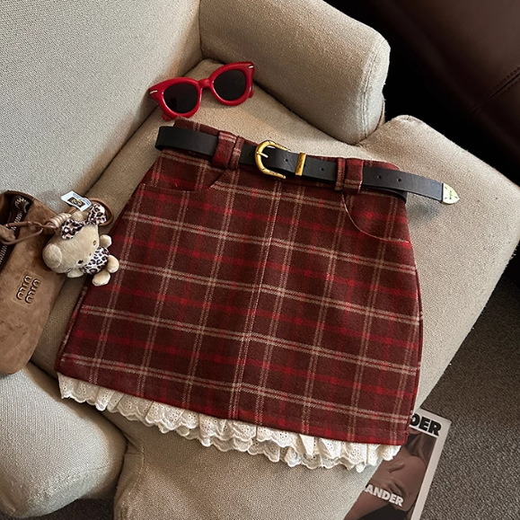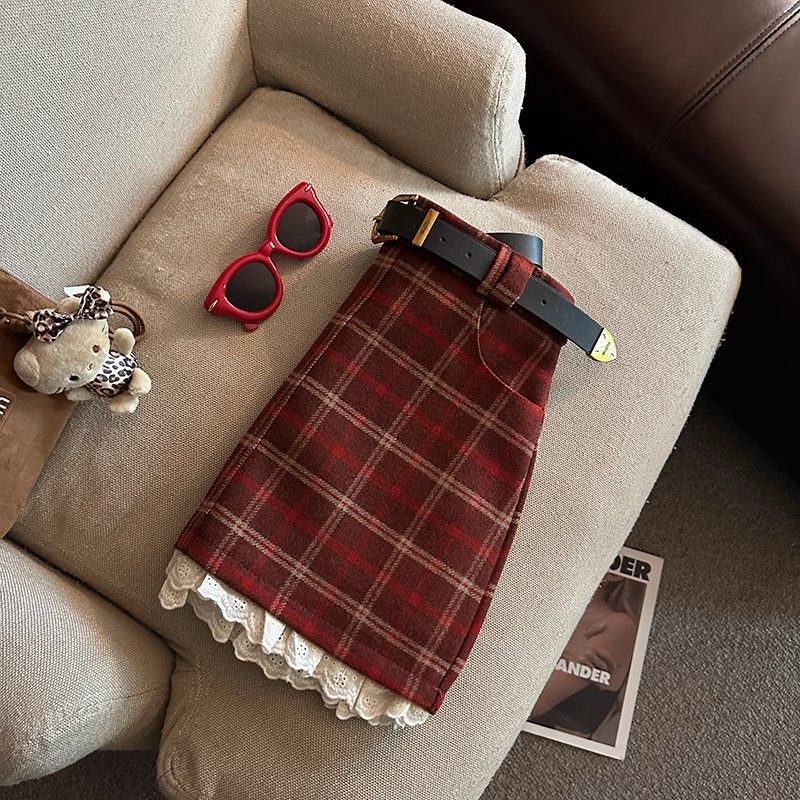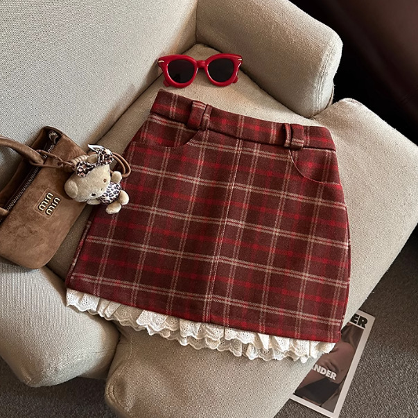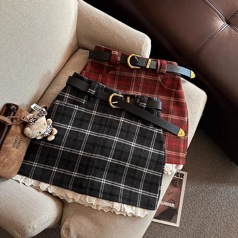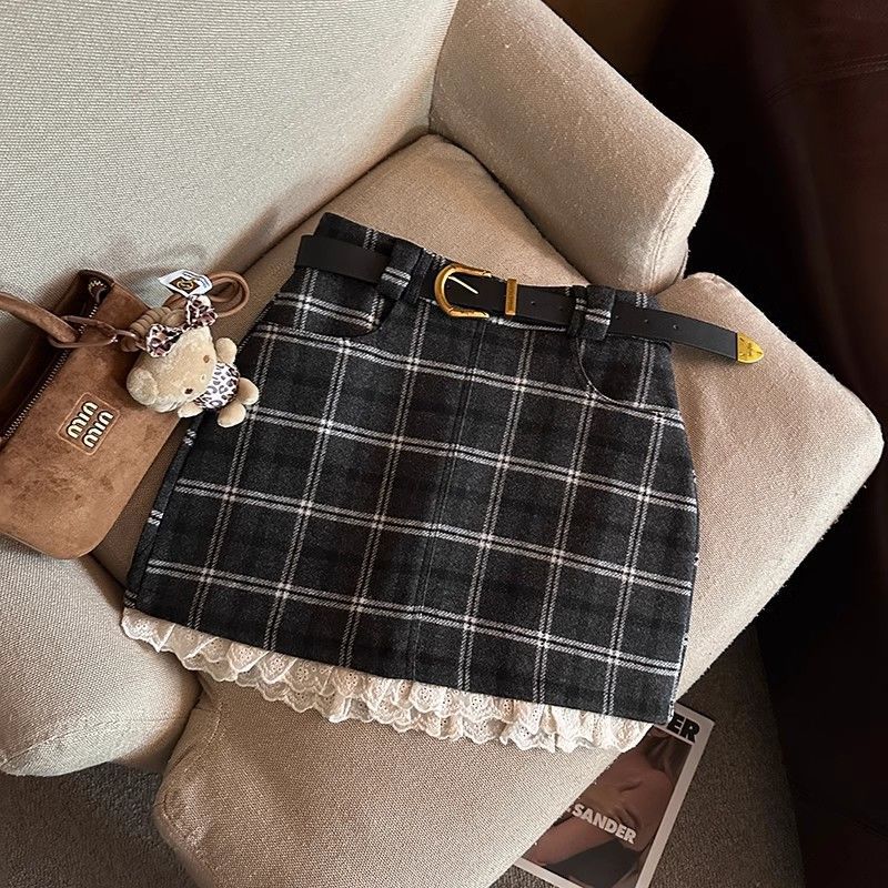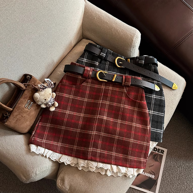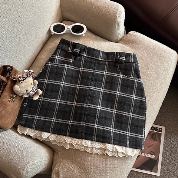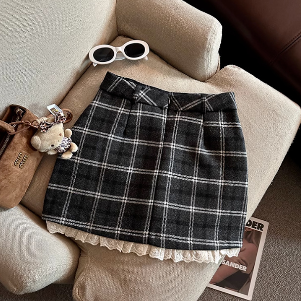 검은 빈티지 격자 무늬 스커트 여성의 가을과 겨울 새로운 미국 스타일 레이스 스티칭 안티 러닝 라이트 A 라인 힙합 짧은 치마스토어 가기