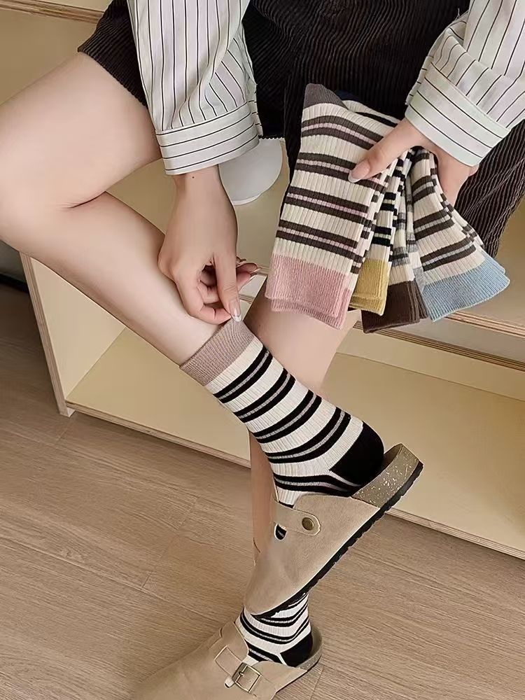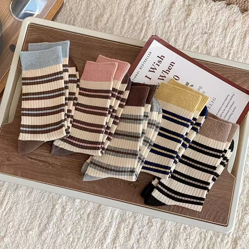 콘트라스트 컬러 스트라이프 양말 어린이 봄과 가을 더블 바늘 캐주얼 뼈없는 중간 길이 양말, 트렌디 한 한국 스타일 가을과 겨울 필 스타킹