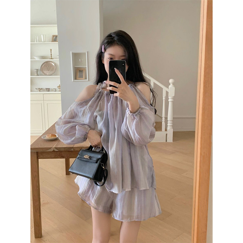 프렌치 스타일 퓨어 세트 여성 여름 2025 얇은 오프 숄더 긴팔 선 스크린 셔츠 와이드 레그 반바지 넥타이 염색 투피스 세트