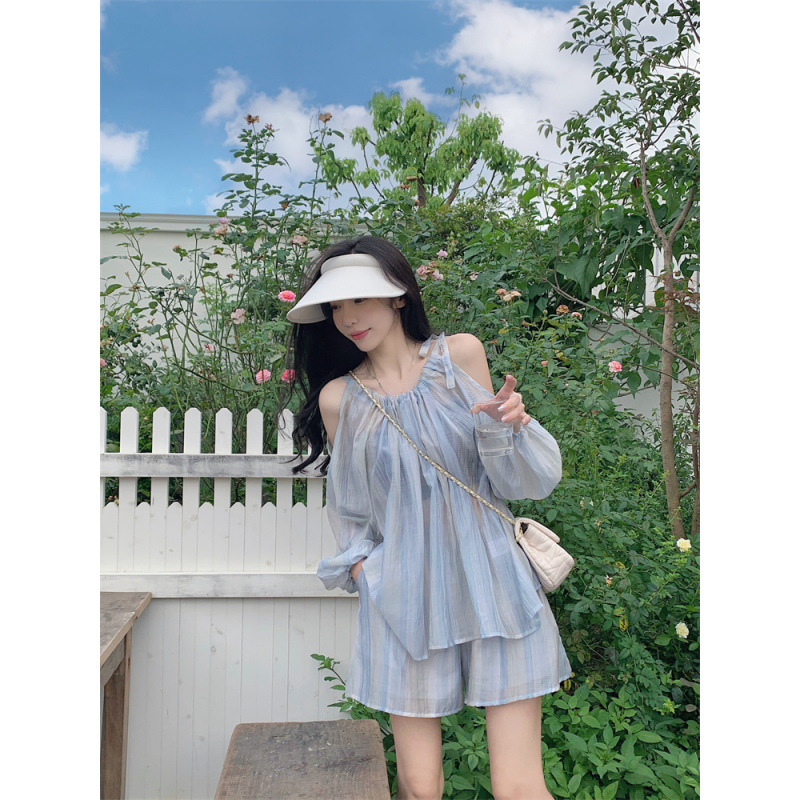 프렌치 스타일 퓨어 세트 여성 여름 2025 얇은 오프 숄더 긴팔 선 스크린 셔츠 와이드 레그 반바지 넥타이 염색 투피스 세트스토어 가기